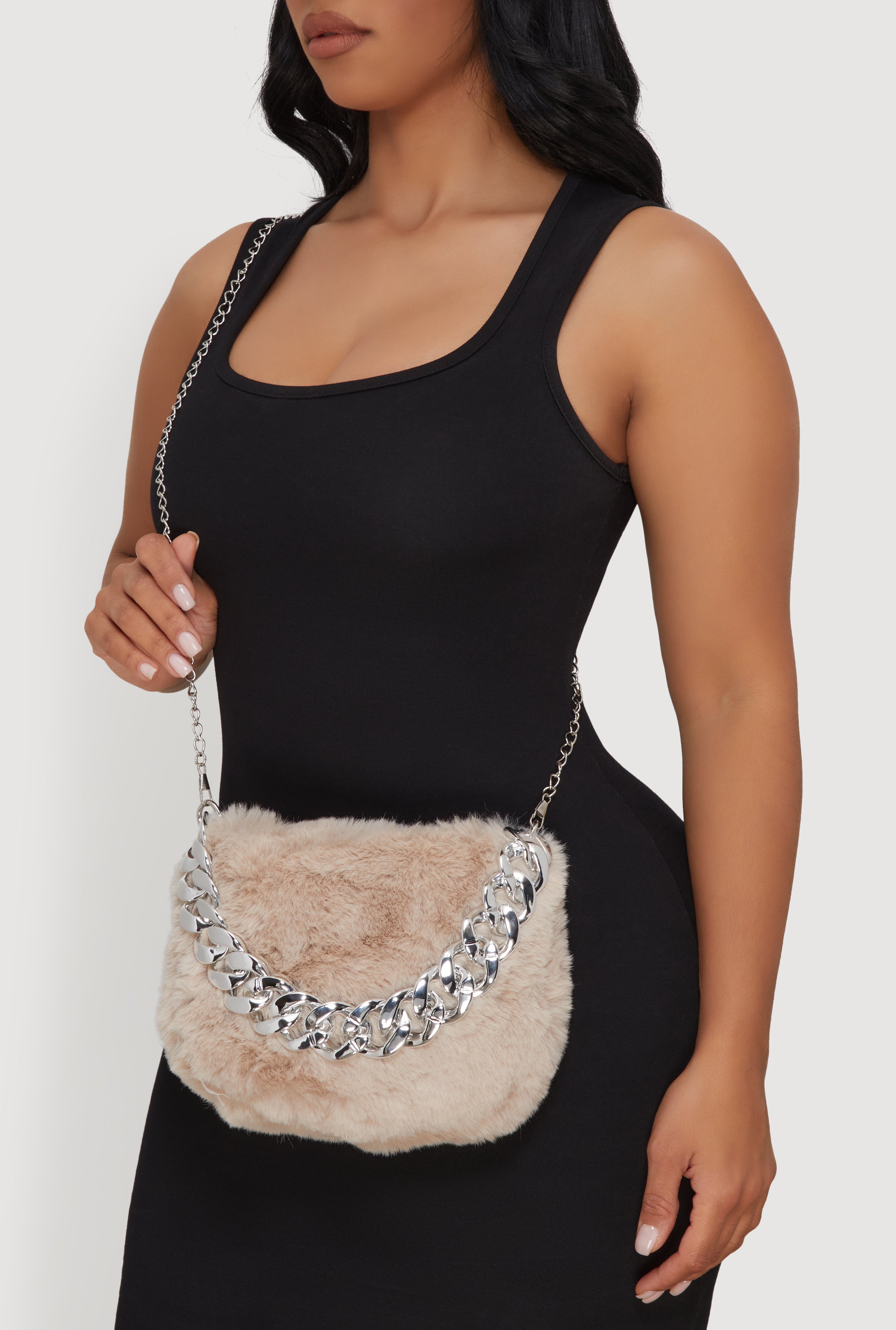 - Edgy chain handle adds a metallic pop to your look