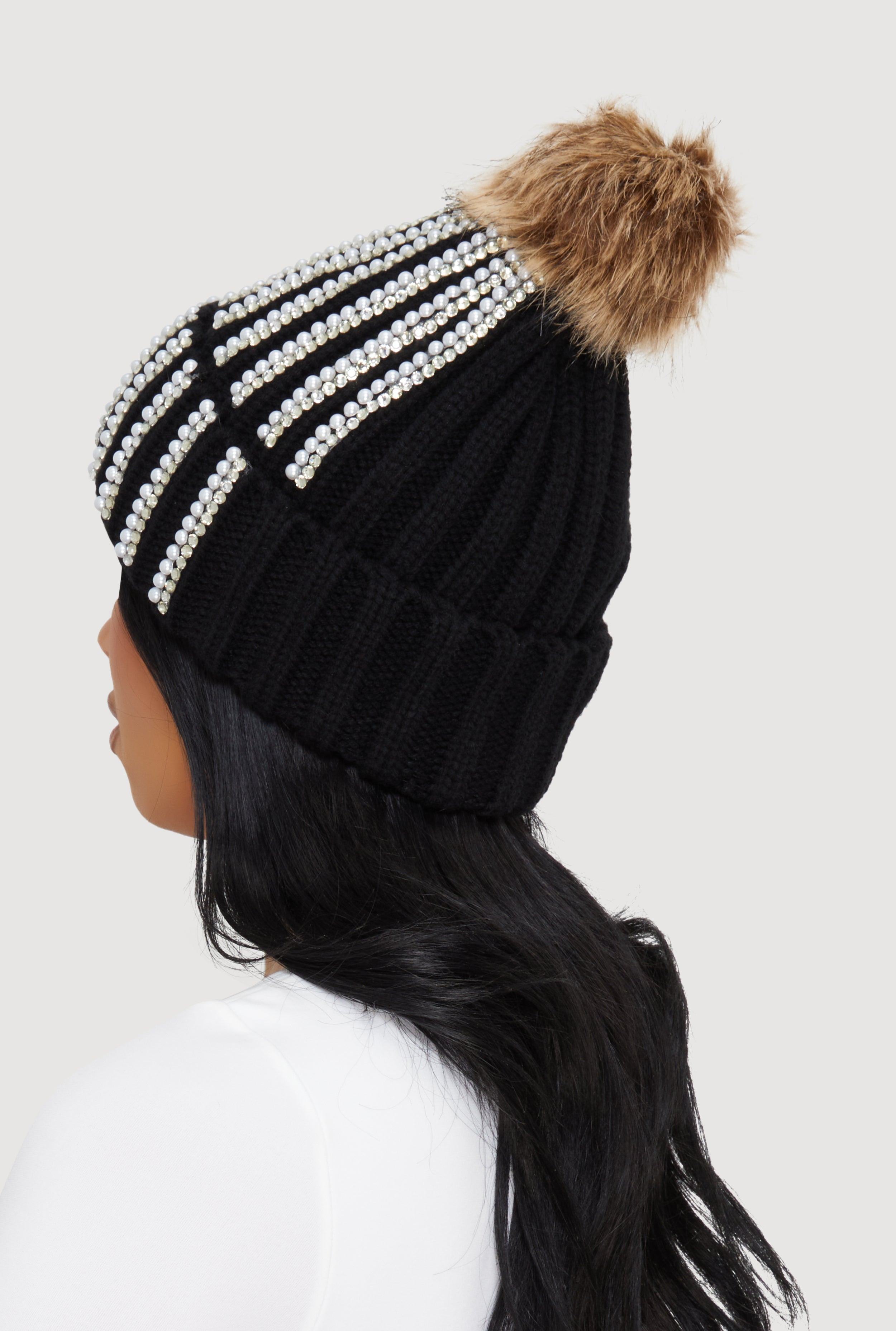Stay cozy and chic with this Faux Fur Pom Pom Faux Pearl and Rhinestone Striped Beanie, featuring playful faux pearls and sparkling rhinestone stripes for a touch of glam. Perfect for casual days when you want to keep warm without sacrificing style, this beanie adds a fun and trendy twist to any outfit.