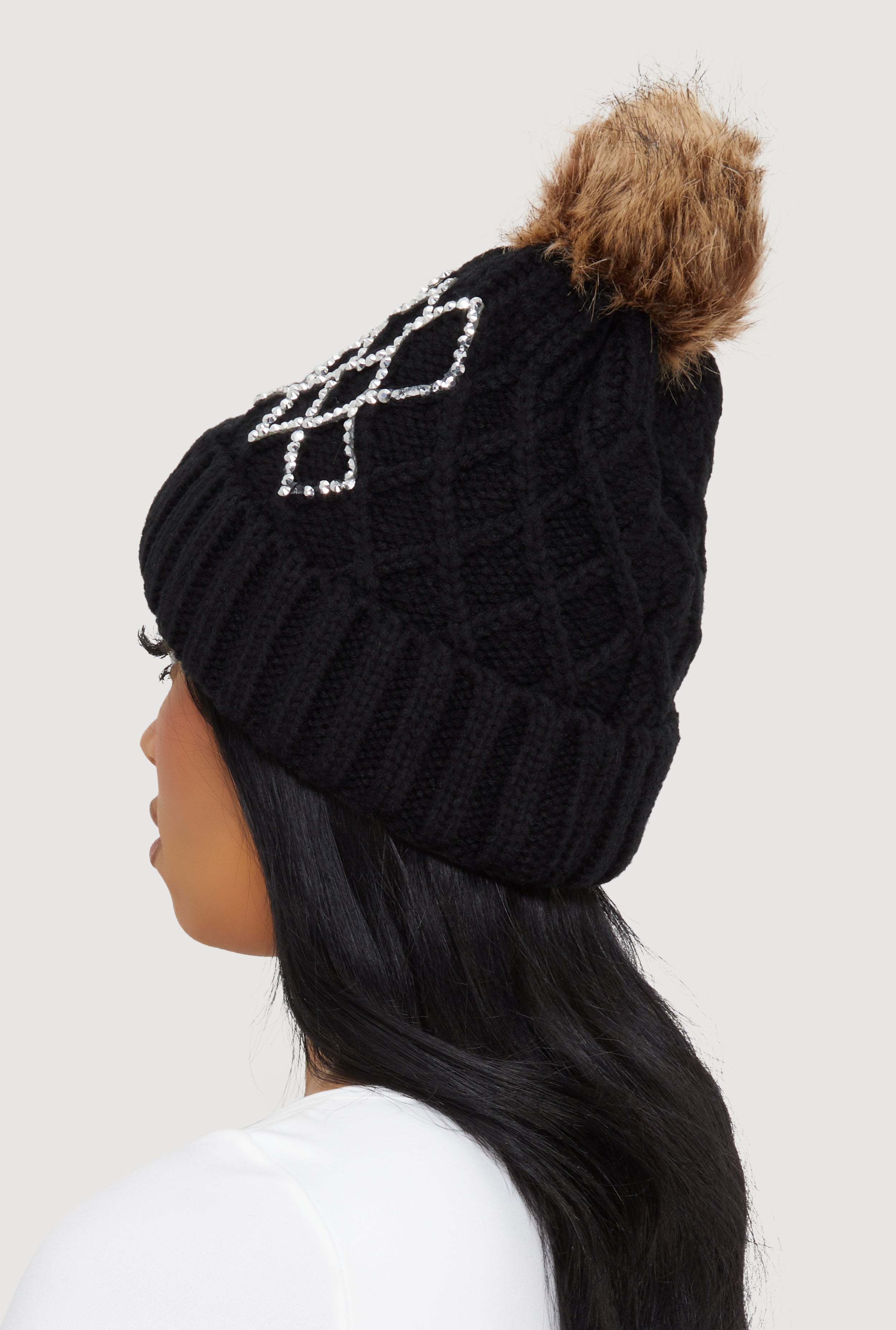 Rhinestone Pattern Knitted Beanie with Pom Pom