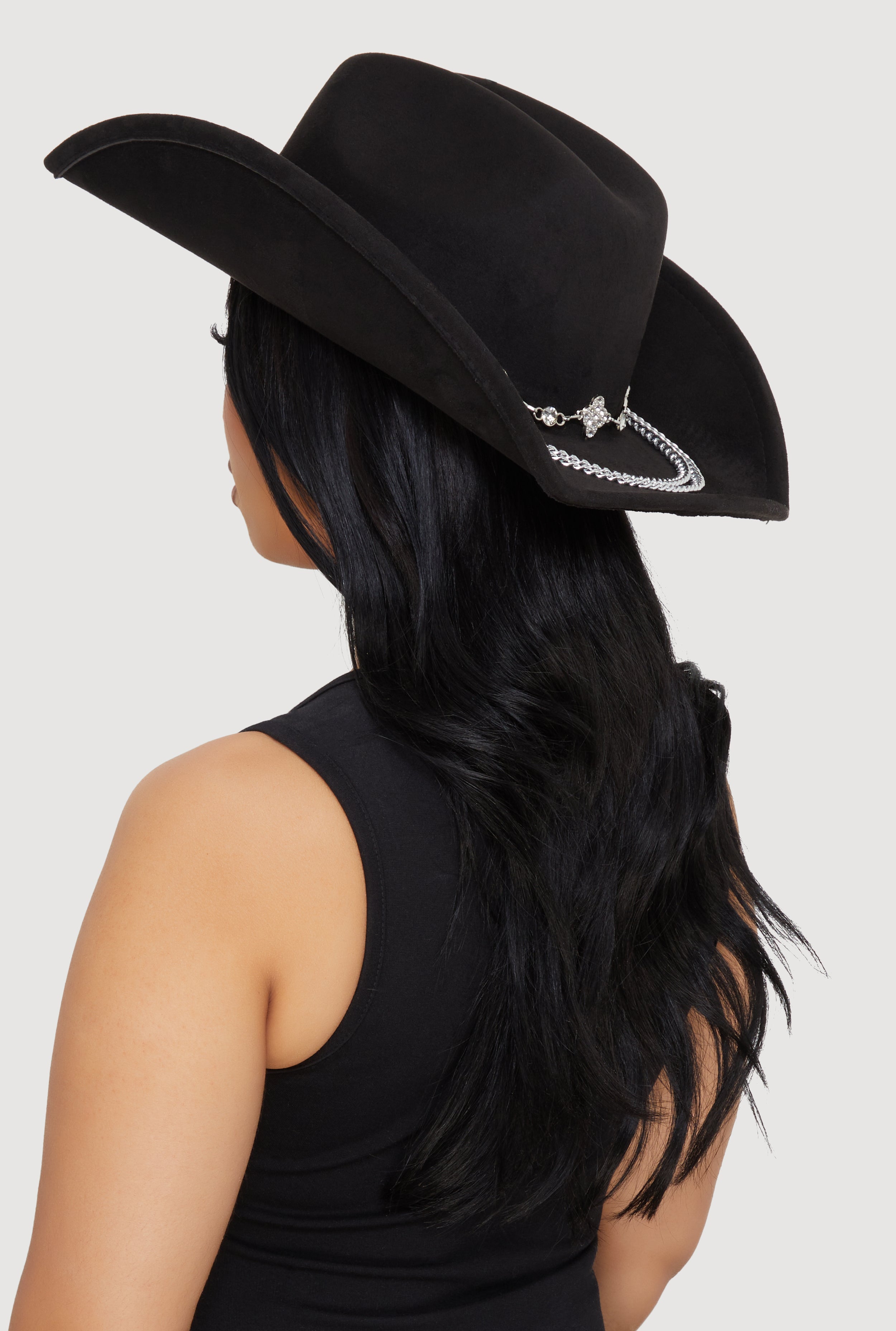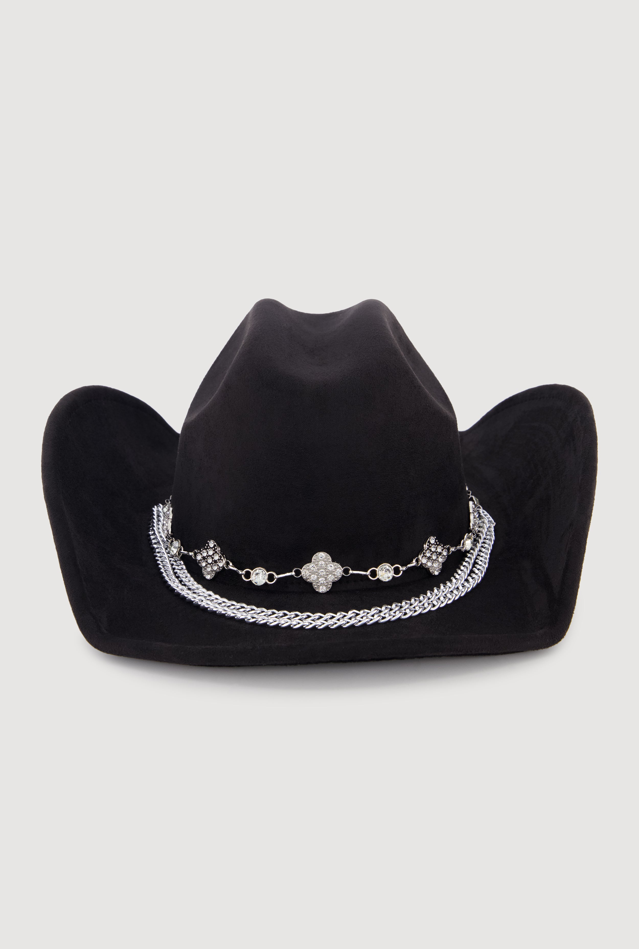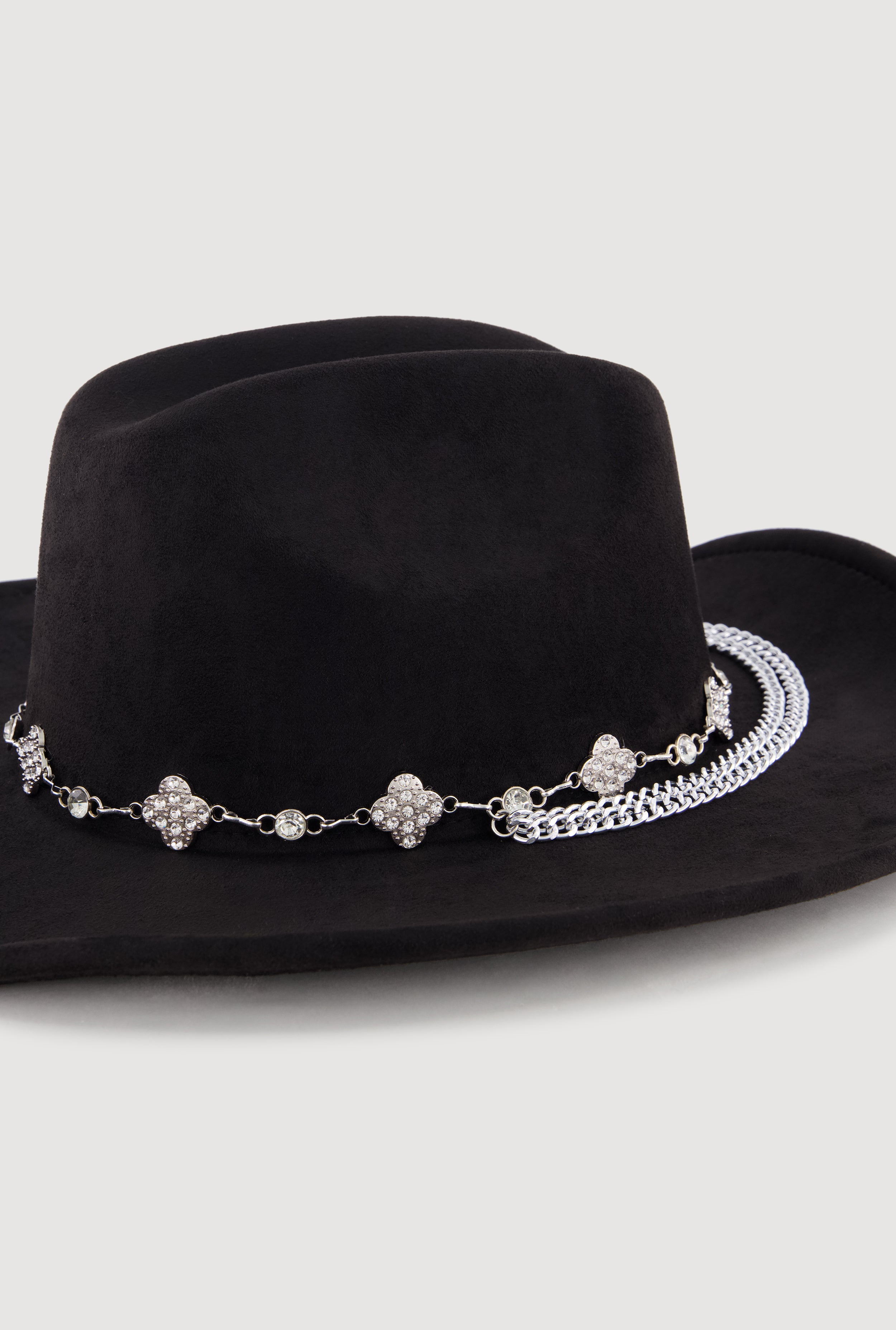 Step up your style game with this Faux Suede Rhinestone Charm Trim Cowboy Hat. Perfect for casual days or festival vibes, this hat brings a fresh twist to the classic cowboy look with sparkling rhinestone details and charming metallic accents. Soft faux suede feels great while the unique trim adds just the right amount of shine to make you stand out effortlessly. Whether you're hitting the festival grounds or just want to add some edge to your everyday outfit, this hat is your new go-to accessory.