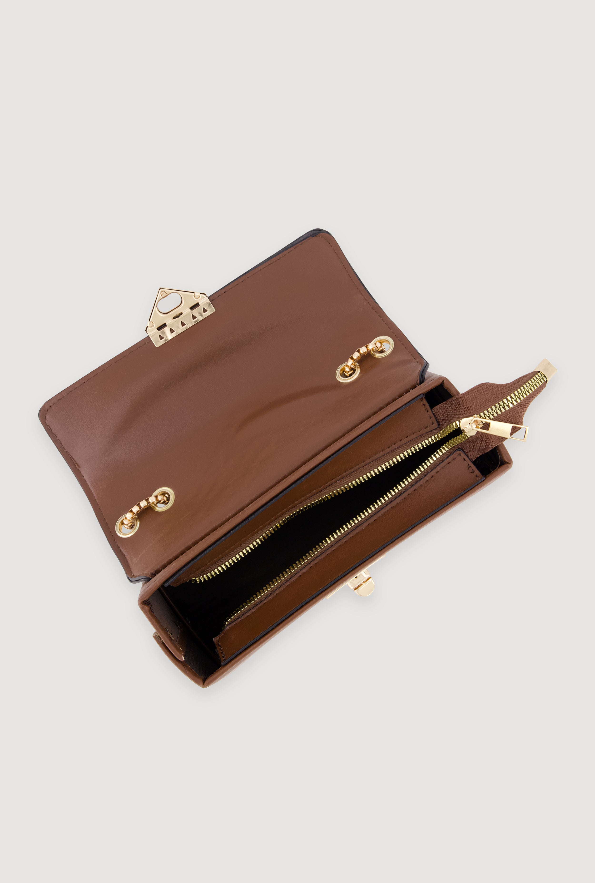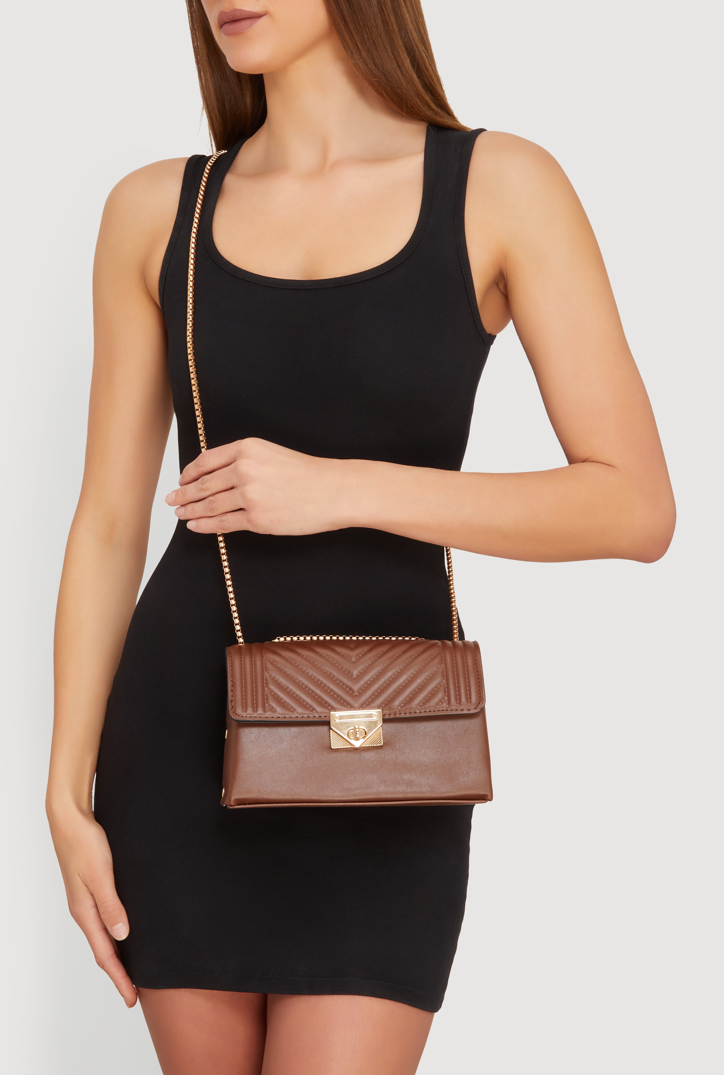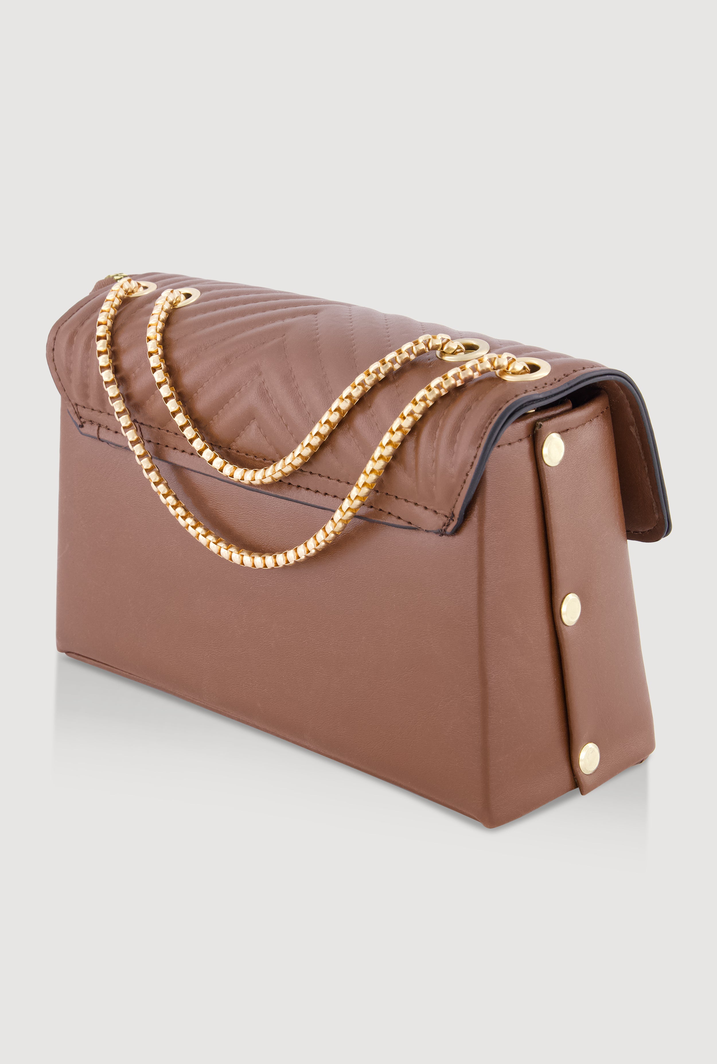 This compact crossbody bag features a quilted faux leather exterior with a metallic chain strap for an edgy finish. Its flap closure secures essentials while maintaining a sleek silhouette. Perfectly sized for everyday use, it blends casual style with practical design.