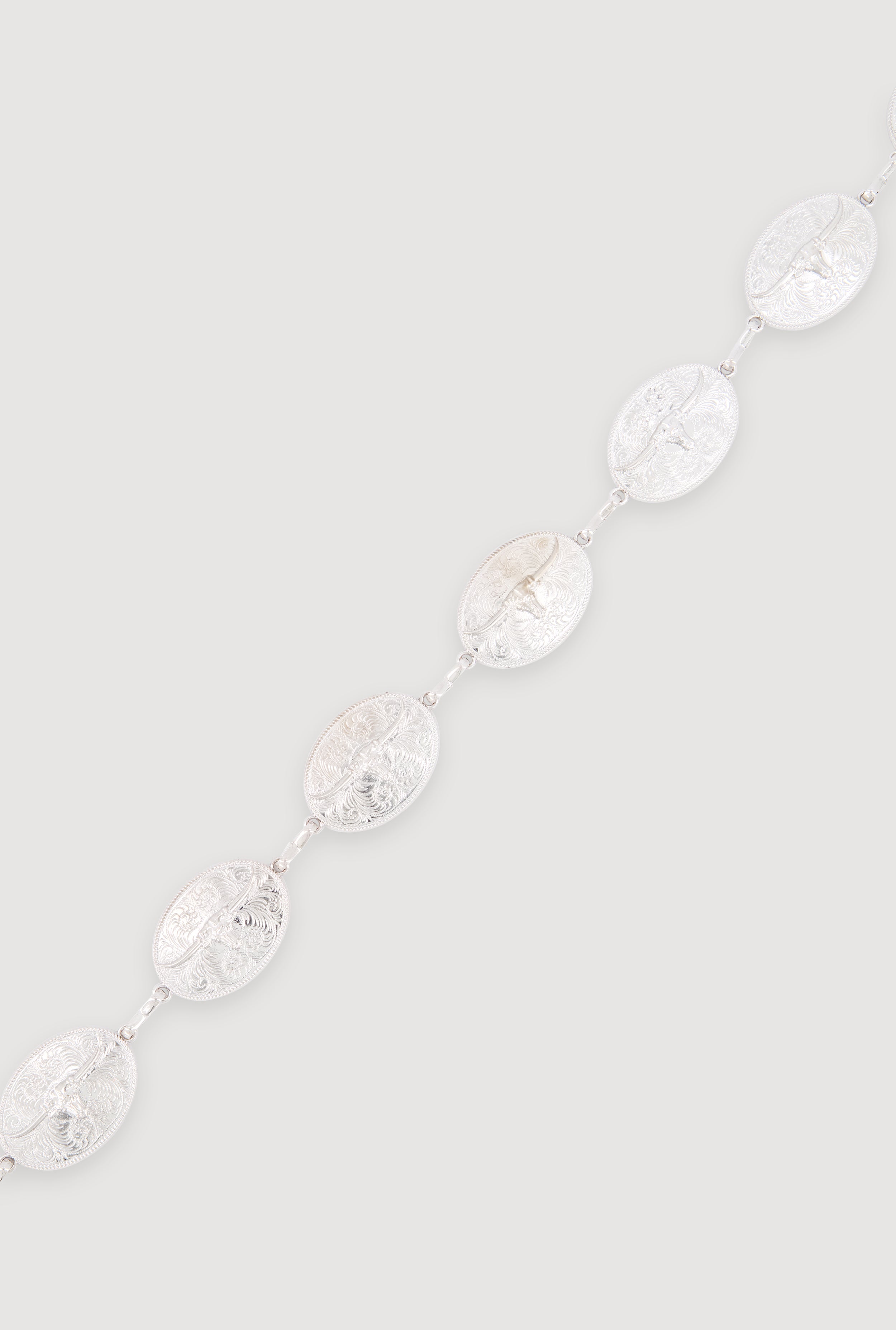 - Oval conchos with detailed bull engravings create a standout accessory