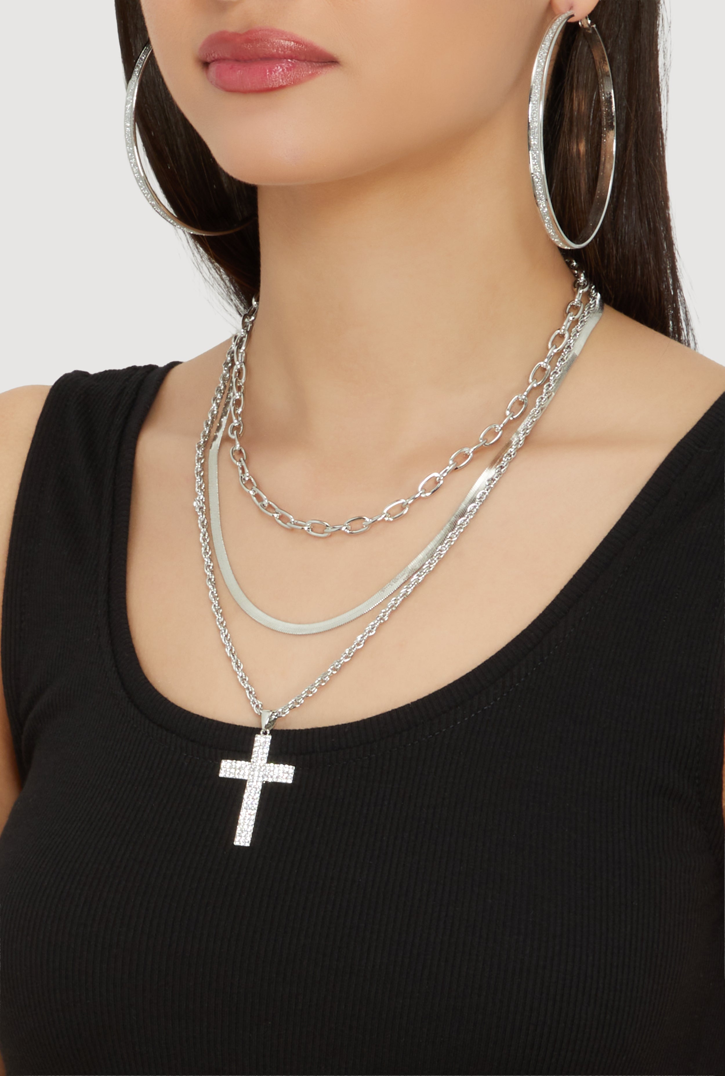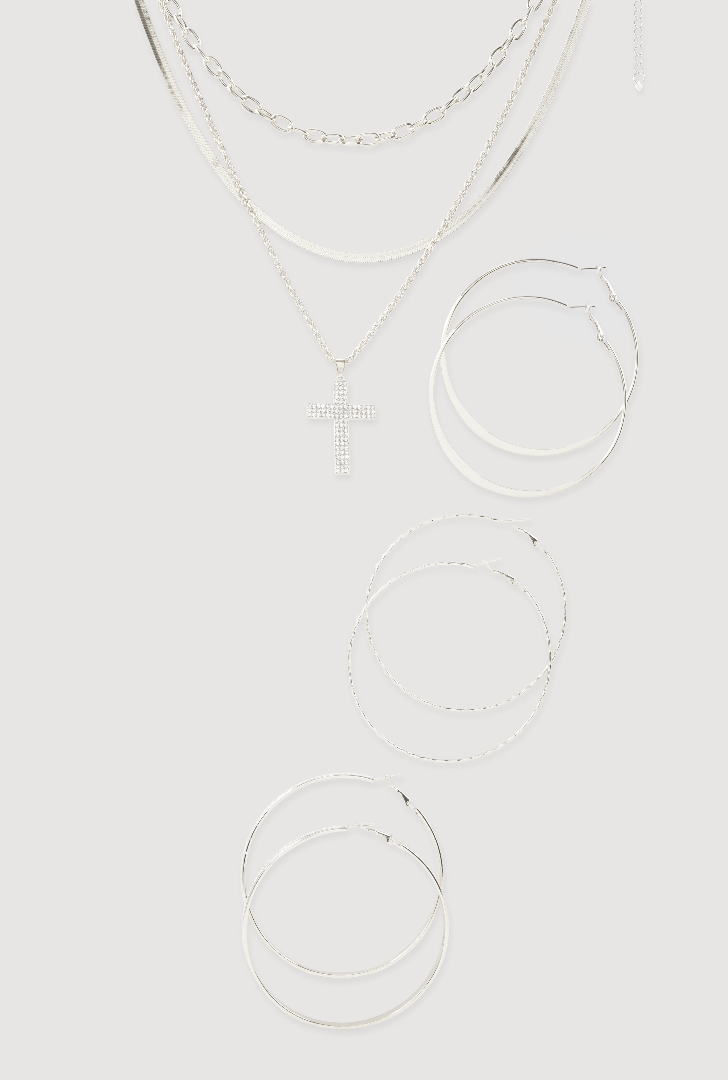 Cubic Zirconia Layered Cross Necklace and Hoop Earrings Set of 4