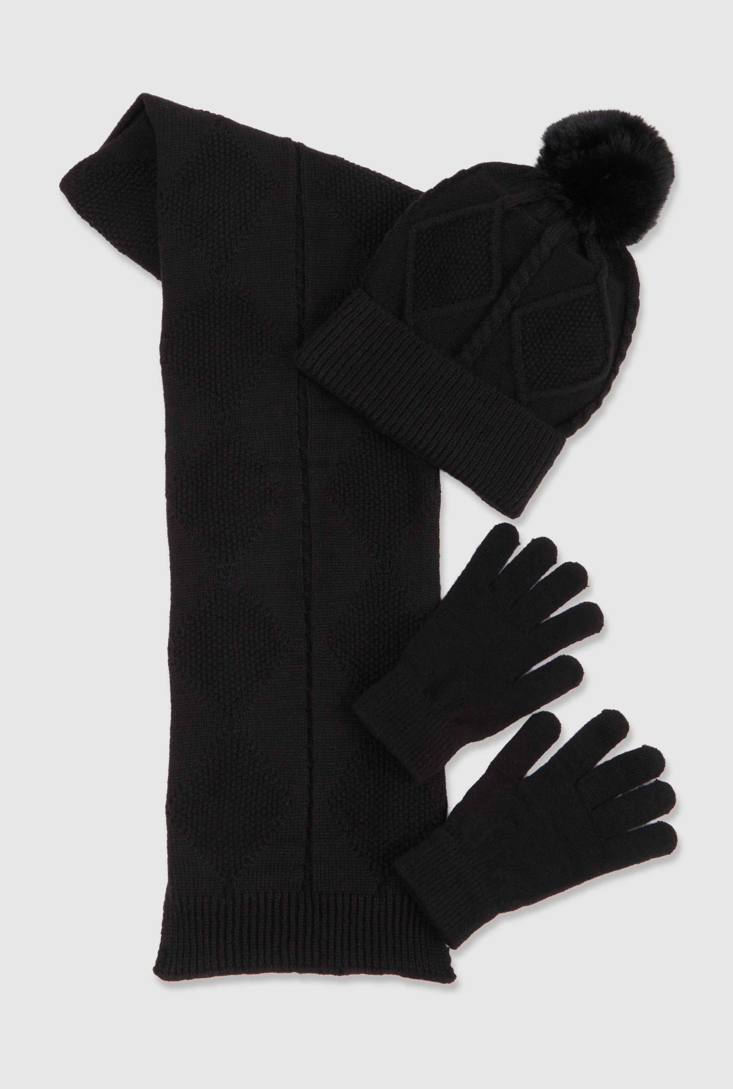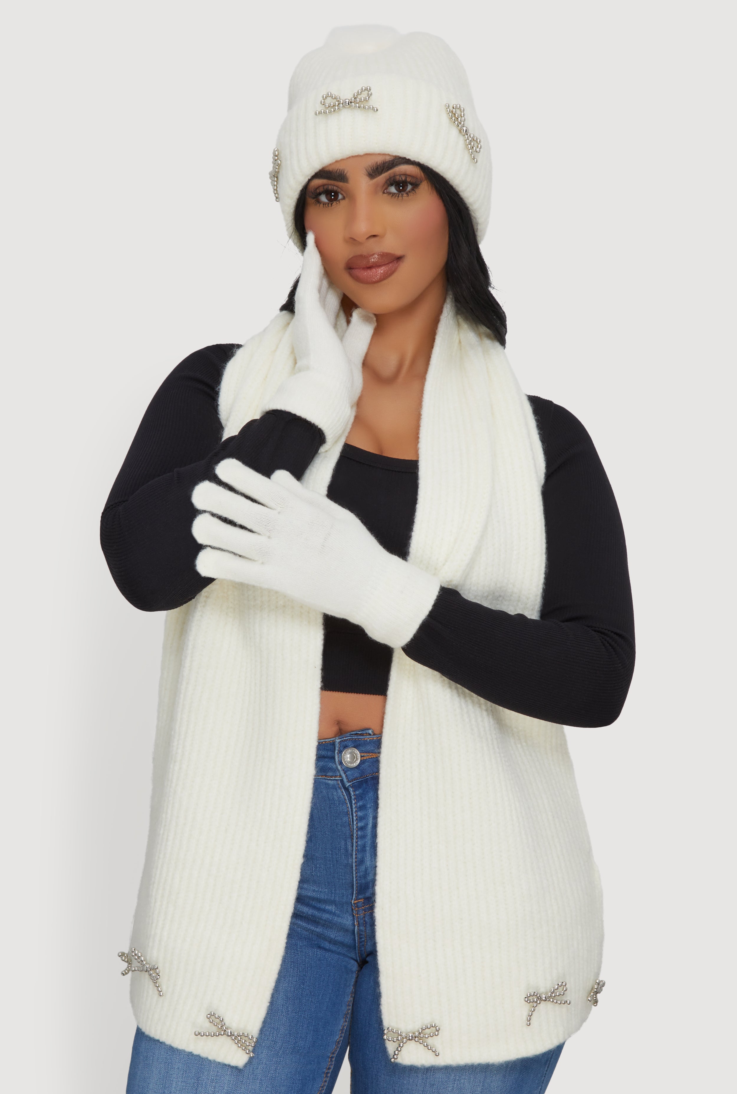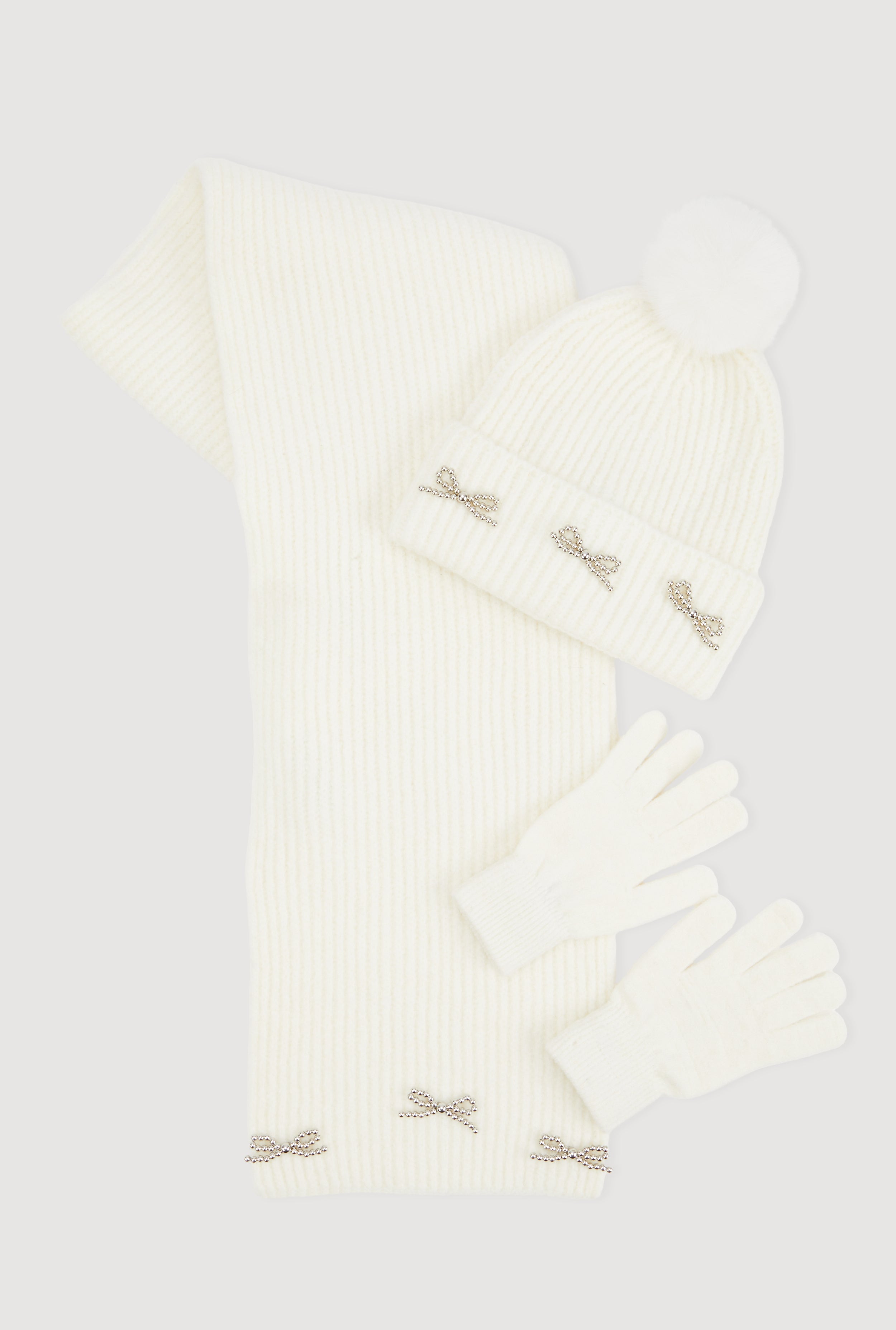 Beaded Bow Detail Scarf and Pom Pom Beanie with Gloves