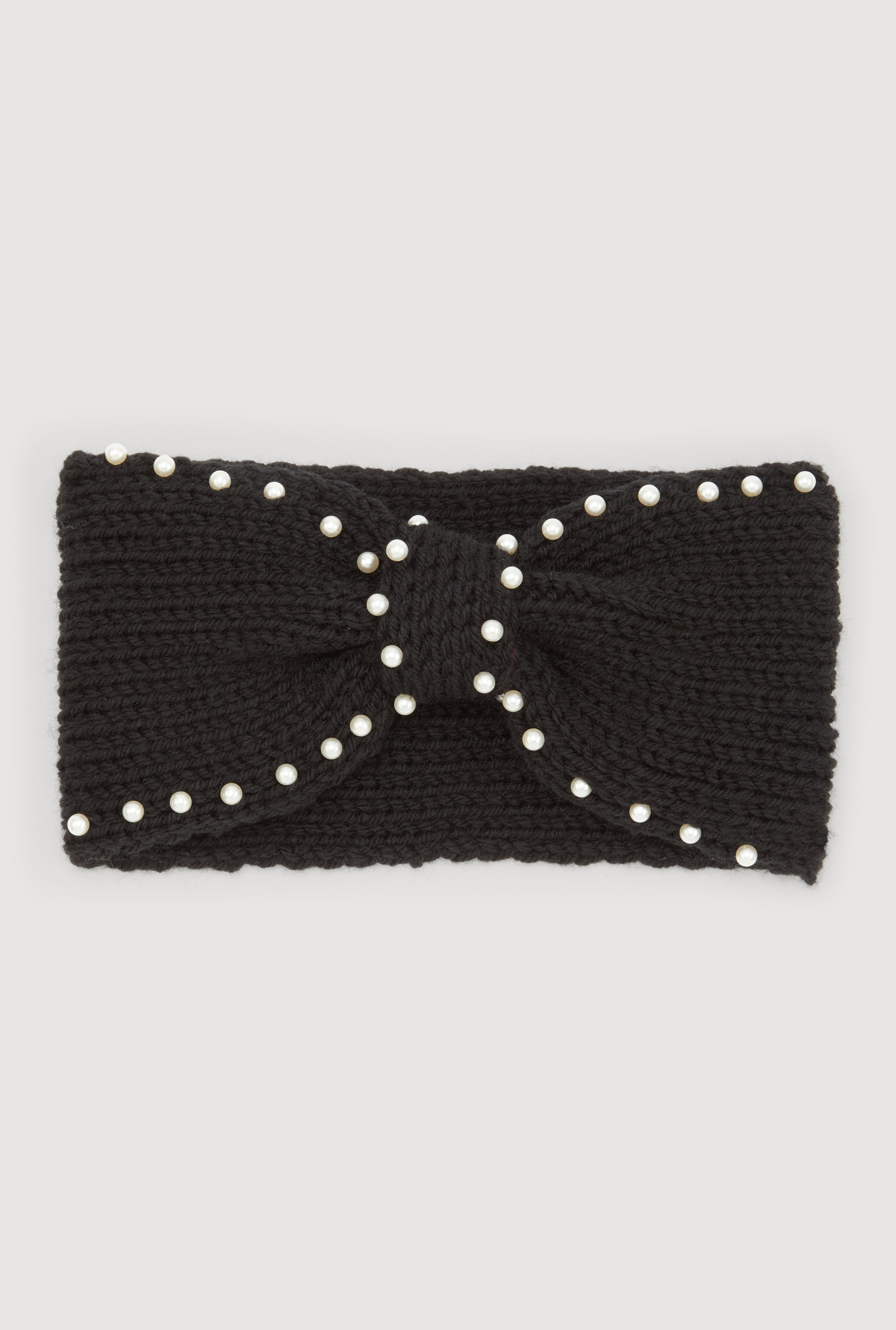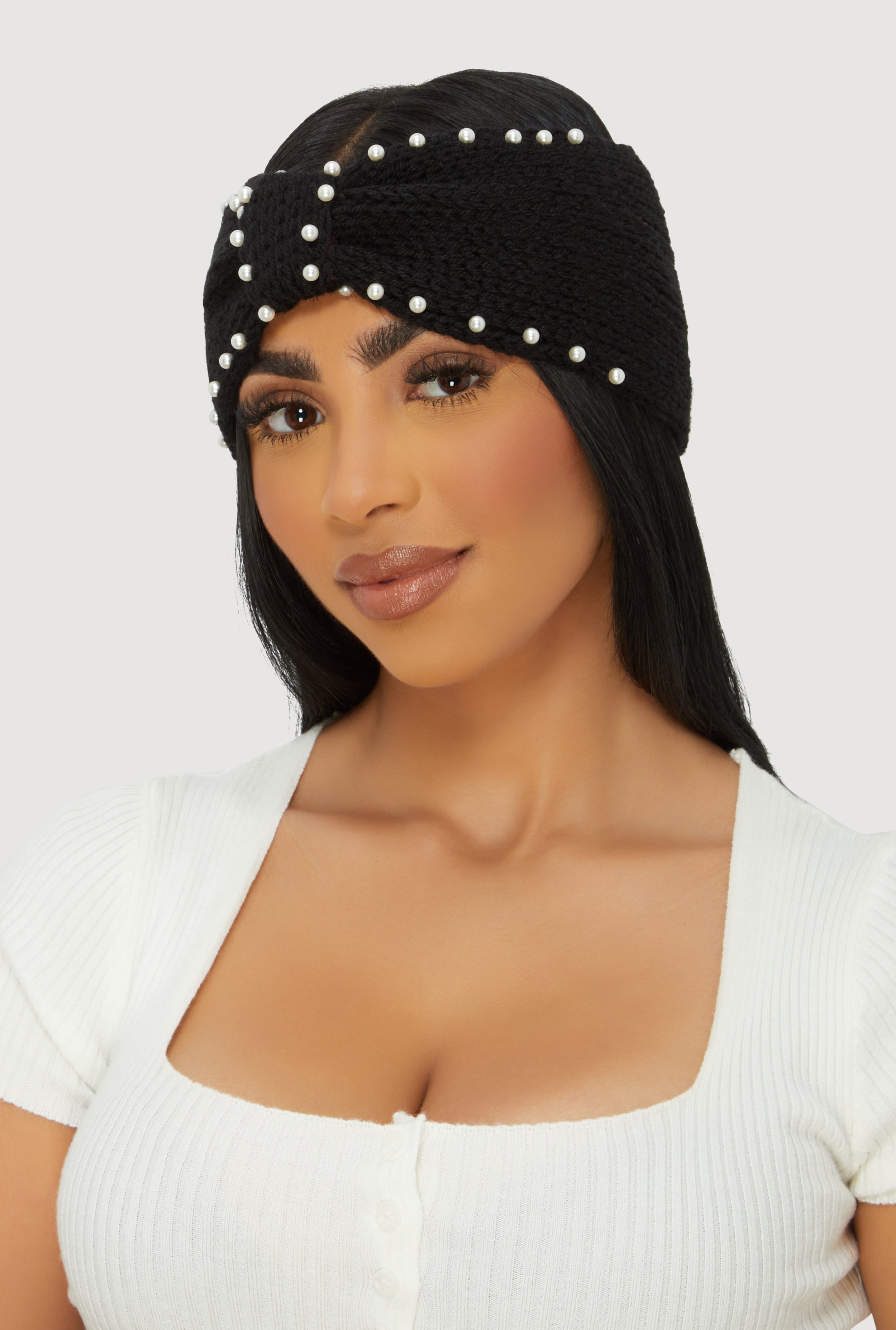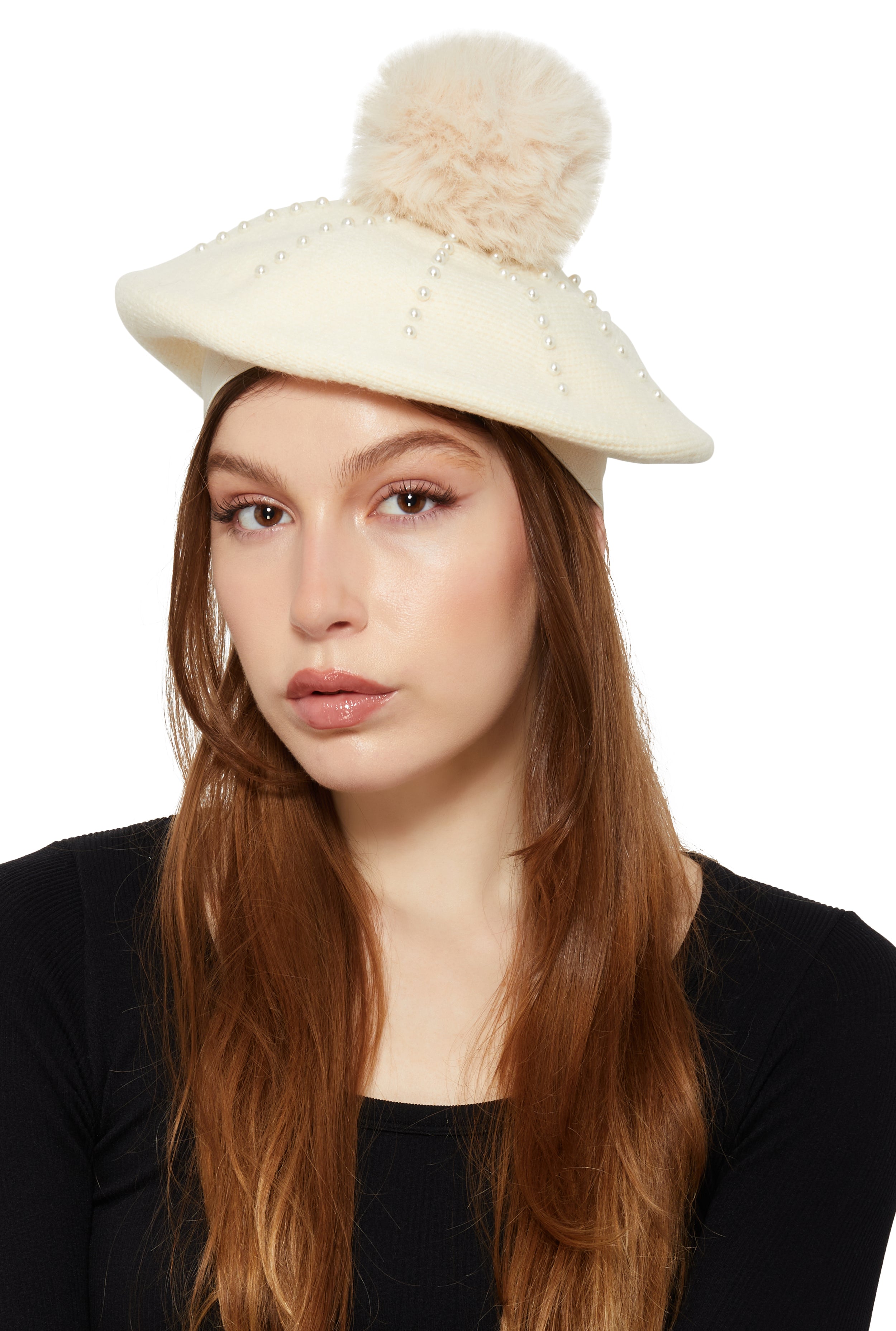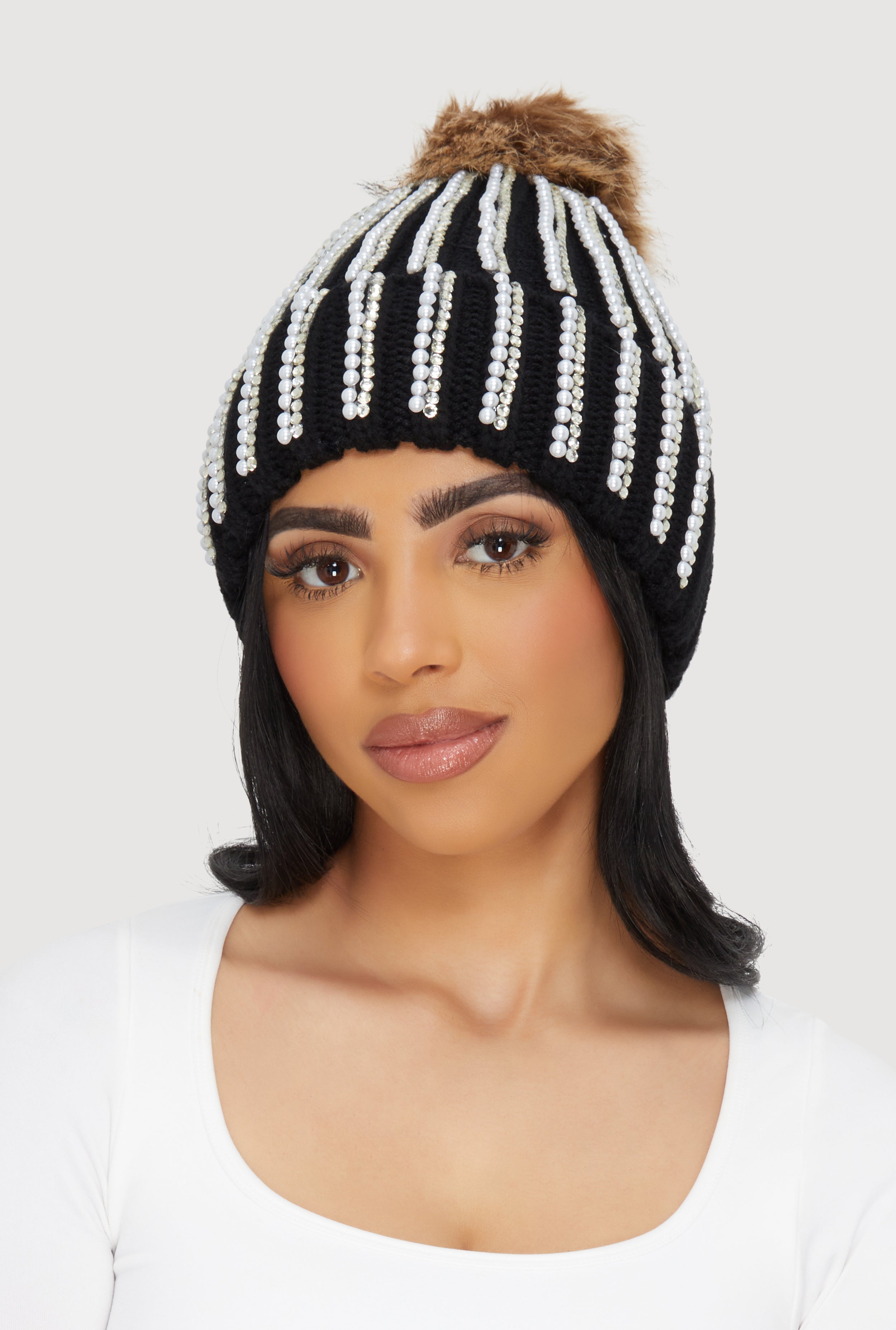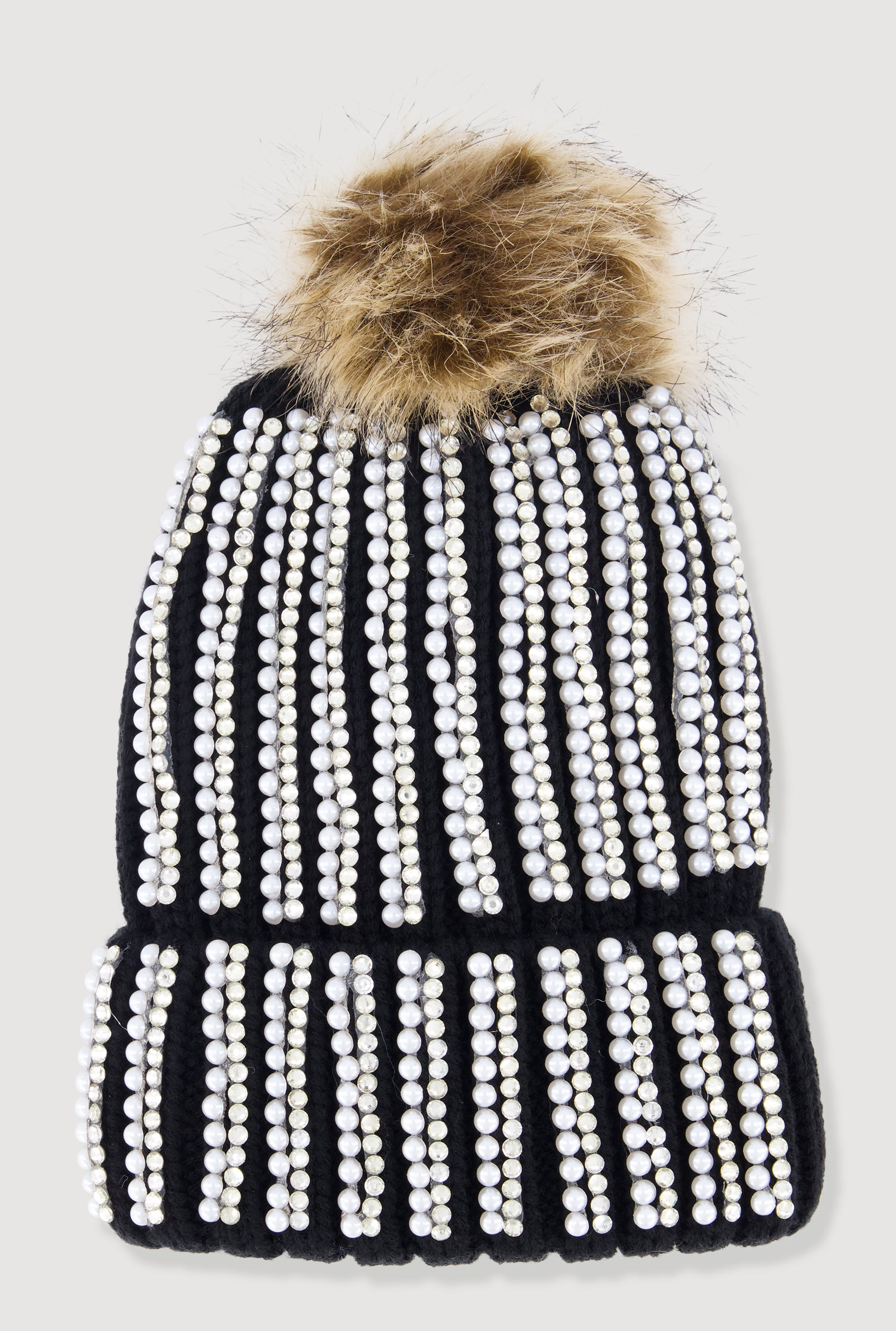 Faux Fur Pom Pom Faux Pearl and Rhinestone Striped Beanie