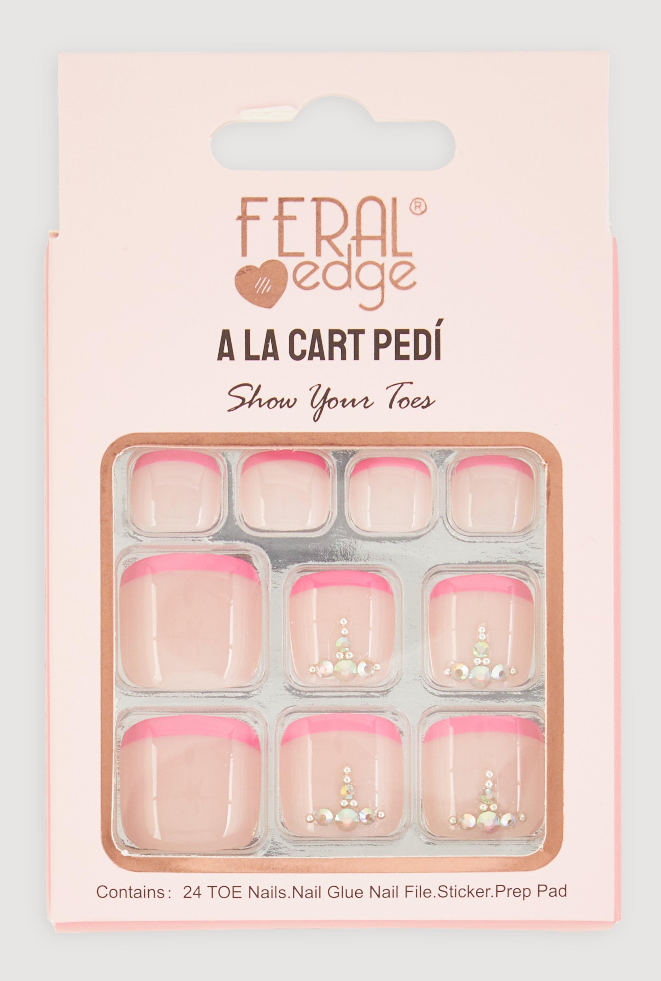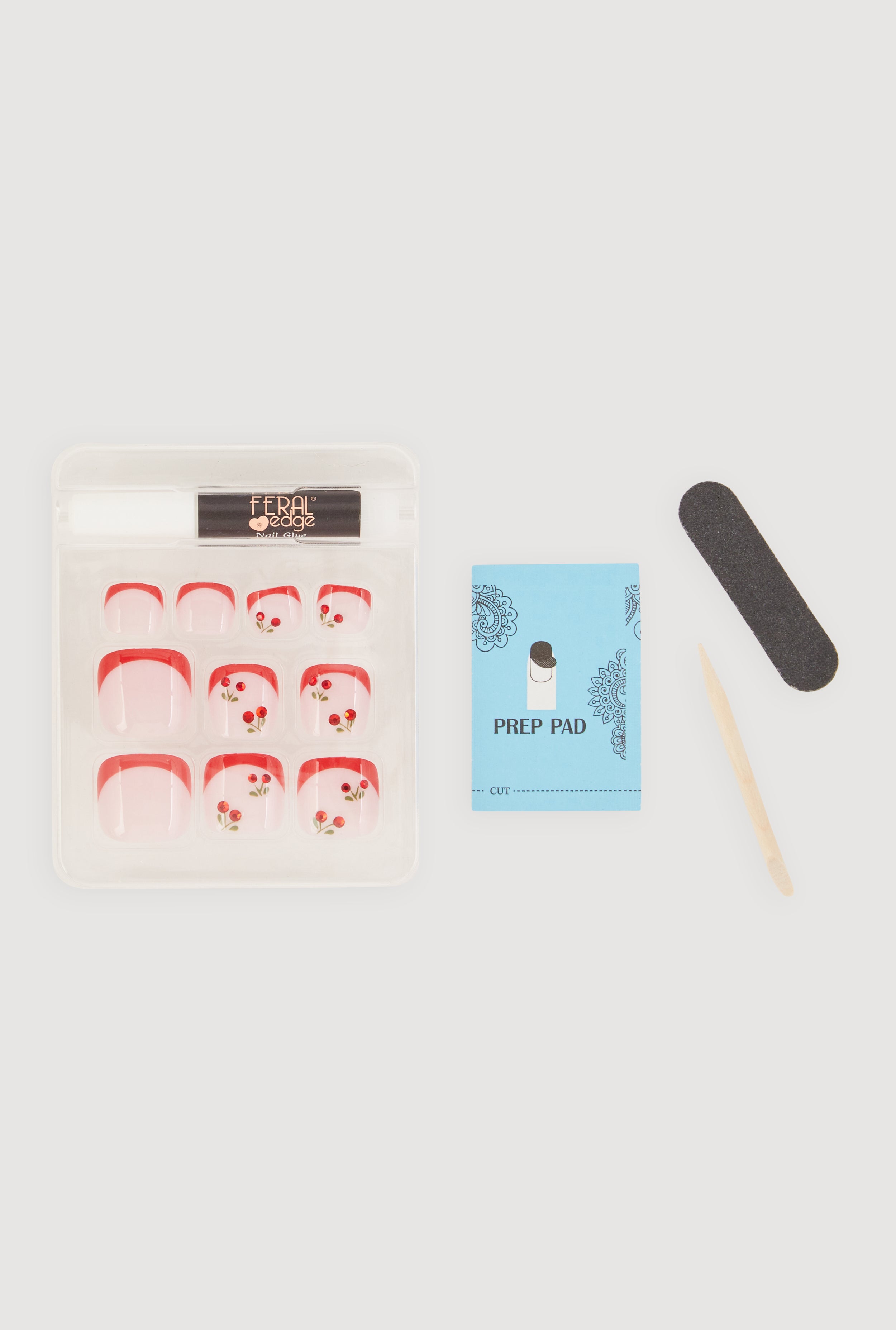Rhinestone Cherry French Tip Press On Pedicure Toenails