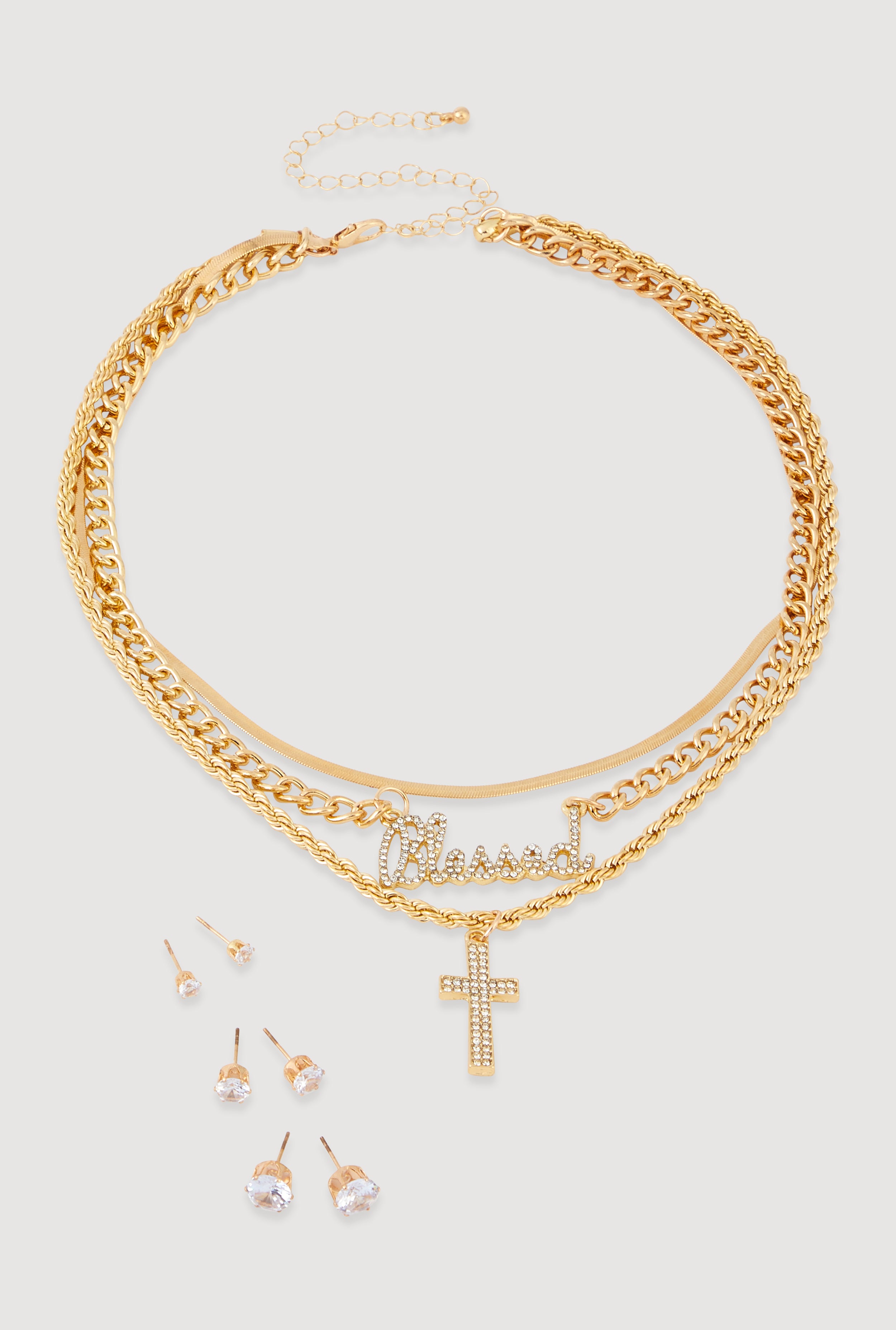 Blessed Cross Layered Necklace with Stud Earring Trio Set