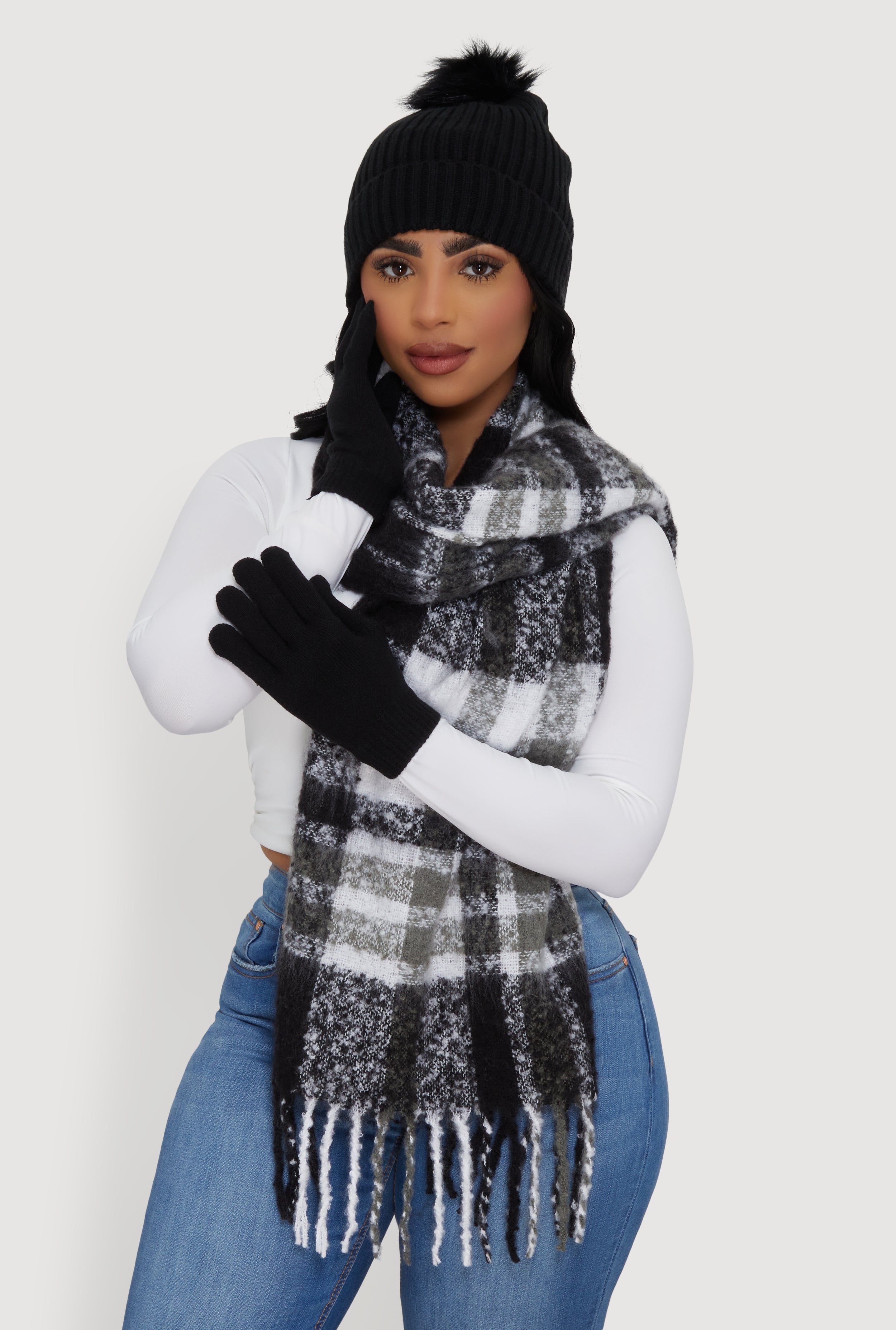 Plaid Scarf with Cable Knit Beanie and Gloves