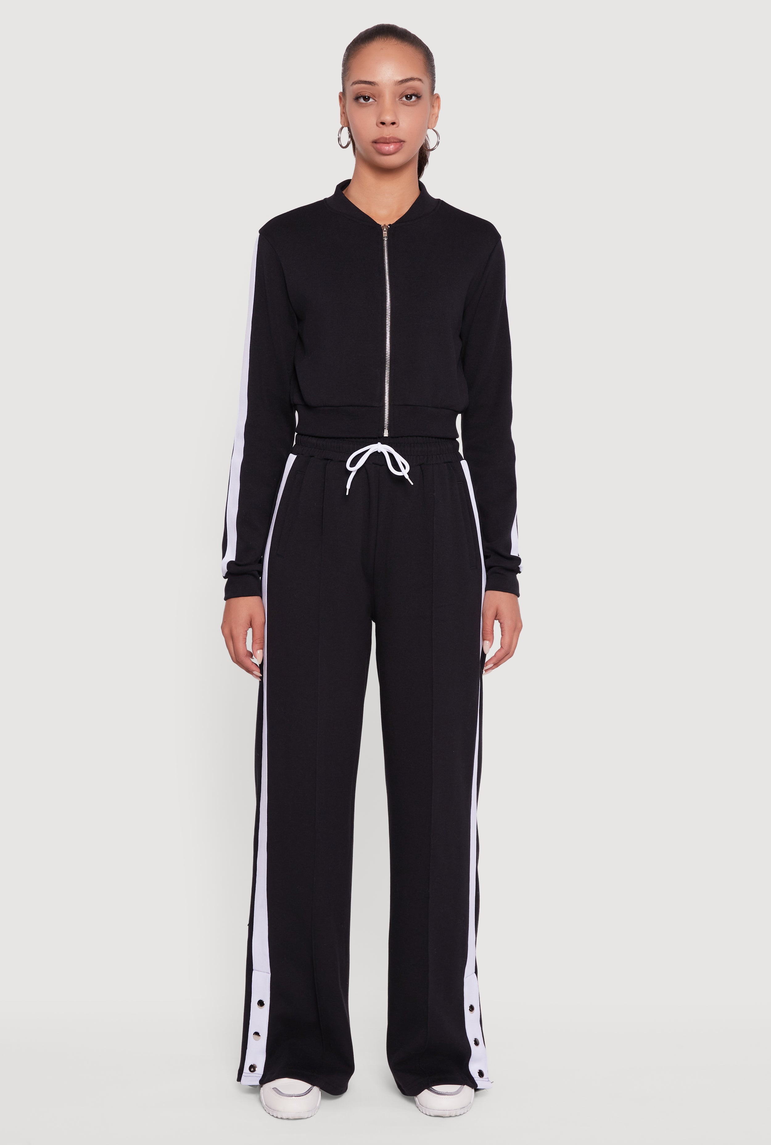 Step up your casual game with the Side Stripe Cropped Zip Front Track Jacket. This sporty-chic piece is perfect for those who want to stay comfy and stylish whether you're running errands or meeting friends. The sleek zip front and trendy side stripes add just the right amount of edge, while the cropped fit keeps it fresh and flattering. Pair it with your favorite high-waisted jeans or leggings and get ready to turn heads effortlessly.