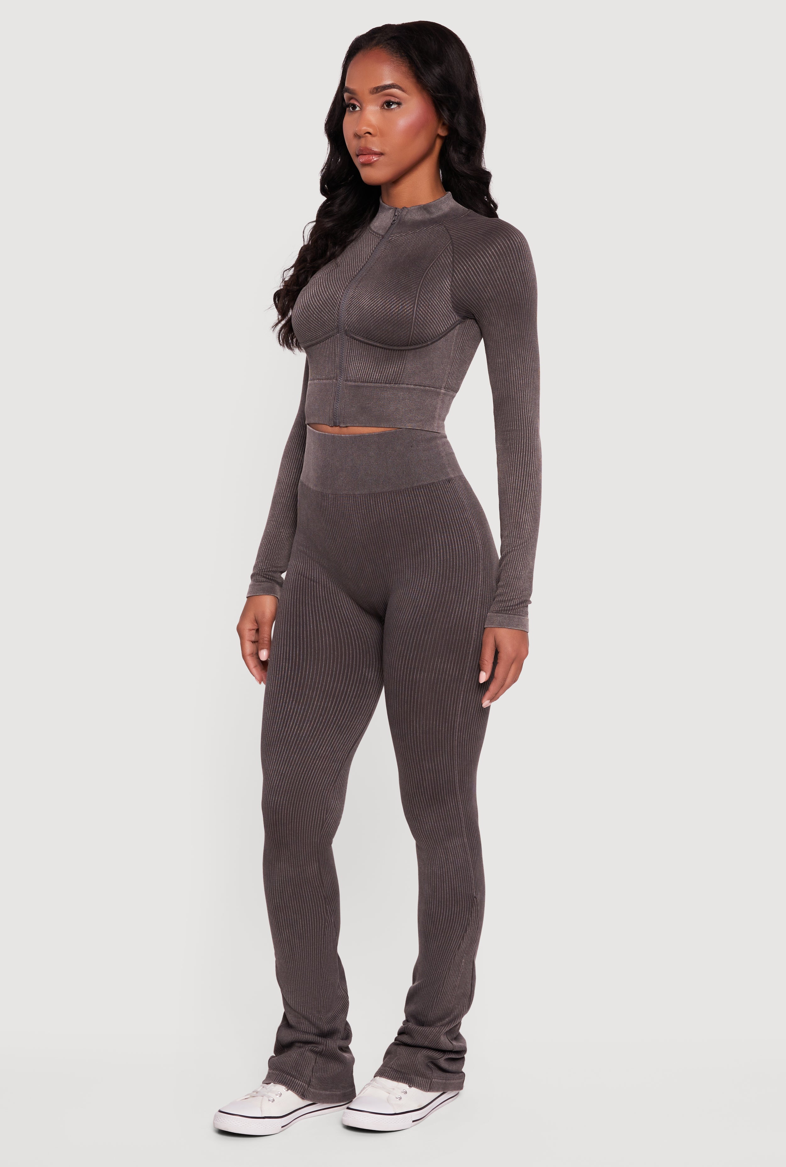 - Compression rib fabric provides stretch and shape retention
