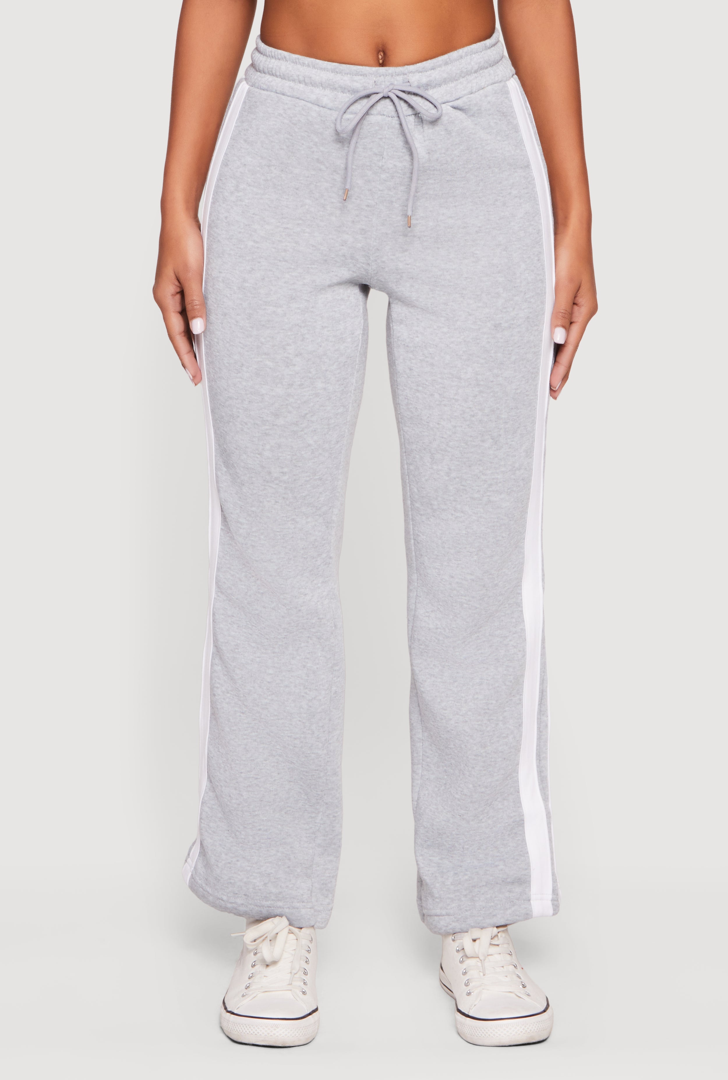 Step up your casual game with these High Waisted Wide Leg Varsity Stripe Sweatpants. Designed for ultimate comfort and style, these fleece-lined sweatpants feature a flattering high waist and trendy wide-leg silhouette that moves with you. The varsity stripe detail adds a sporty edge, making them perfect for lounging, running errands, or hitting your favorite coffee spot. Easy to pair with your favorite crop top or hoodie, these sweatpants are your new go-to for effortless cool.