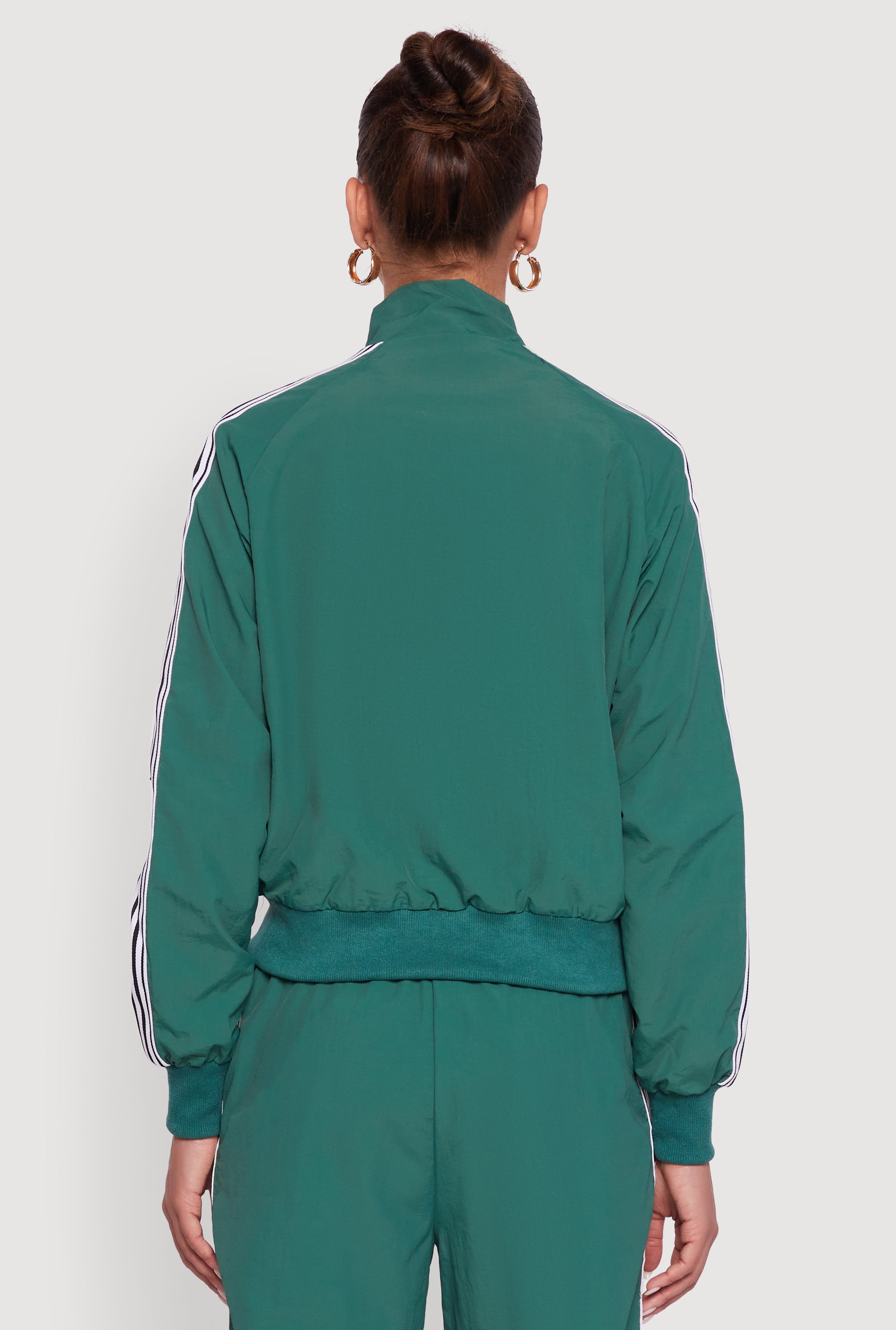 Step up your casual game with the Side Striped Nylon Mock Neck Track Jacket. This sleek, sporty jacket blends retro vibes with modern comfort, making it your go-to for athleisure looks or those chill days when you want to stay cozy without sacrificing style. The mock neck adds a cool edge, while the side stripes bring that classic track jacket flair. Whether you're running errands or meeting friends, this lightweight, lined jacket keeps you looking fresh and feeling comfy all day long.