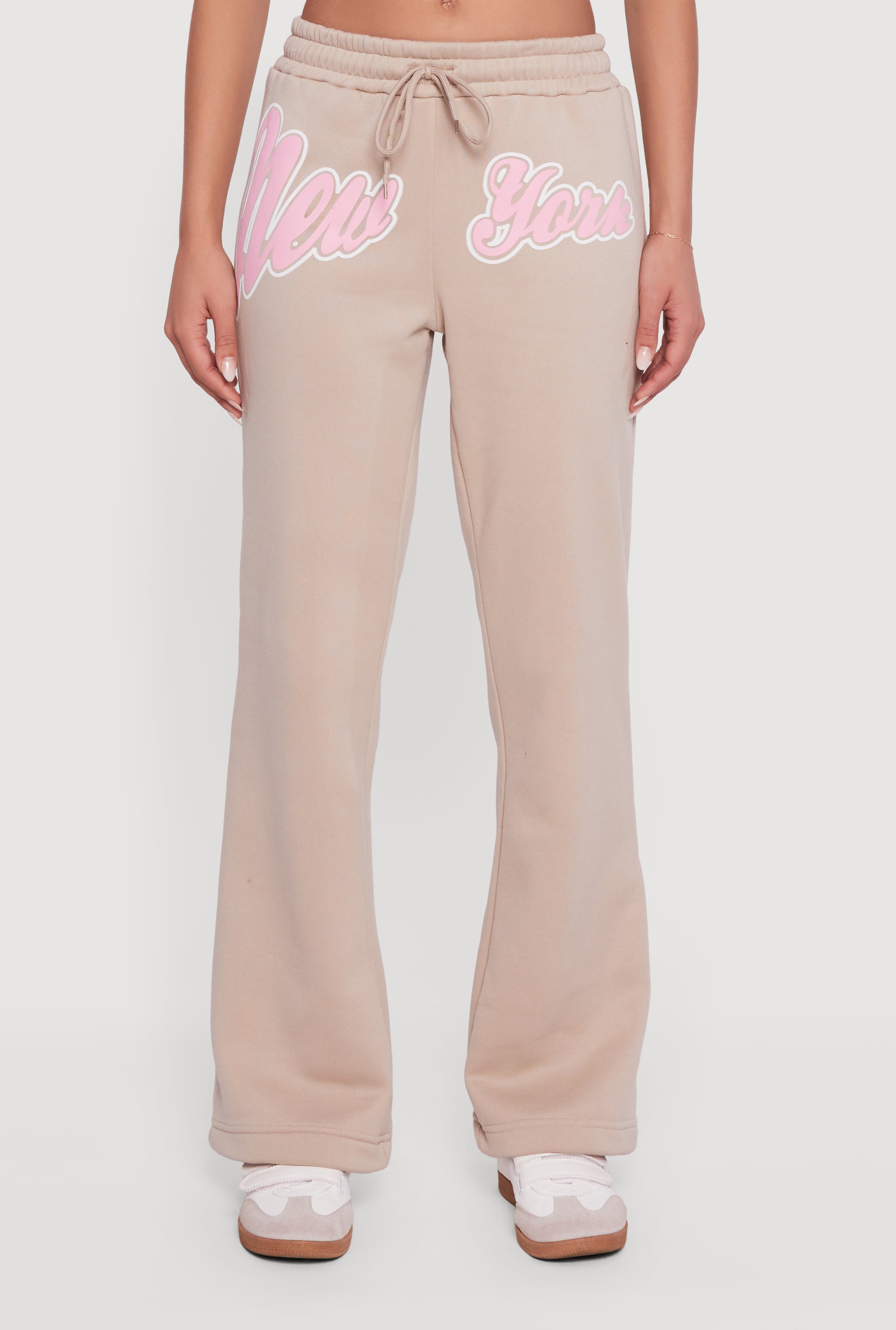 Step up your casual game with these New York Graphic Flare Leg Sweatpants. Designed for comfort and style, they feature a trendy flare leg silhouette and a bold New York graphic print that makes a statement wherever you go. Made from cozy fleece with a mid-rise fit and adjustable drawstring waist, these sweatpants are perfect for lounging, streetwear vibes, or running errands with effortless cool.