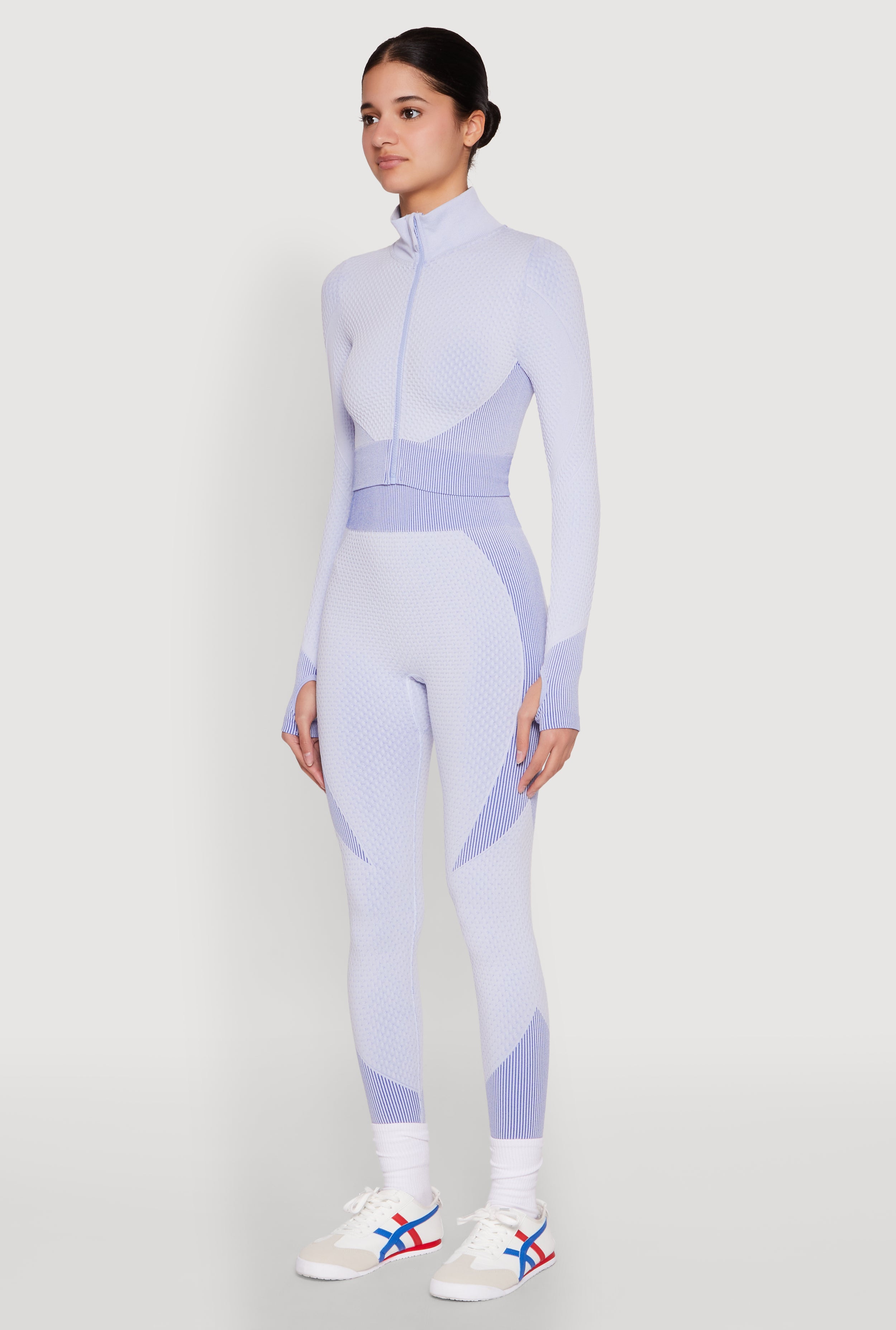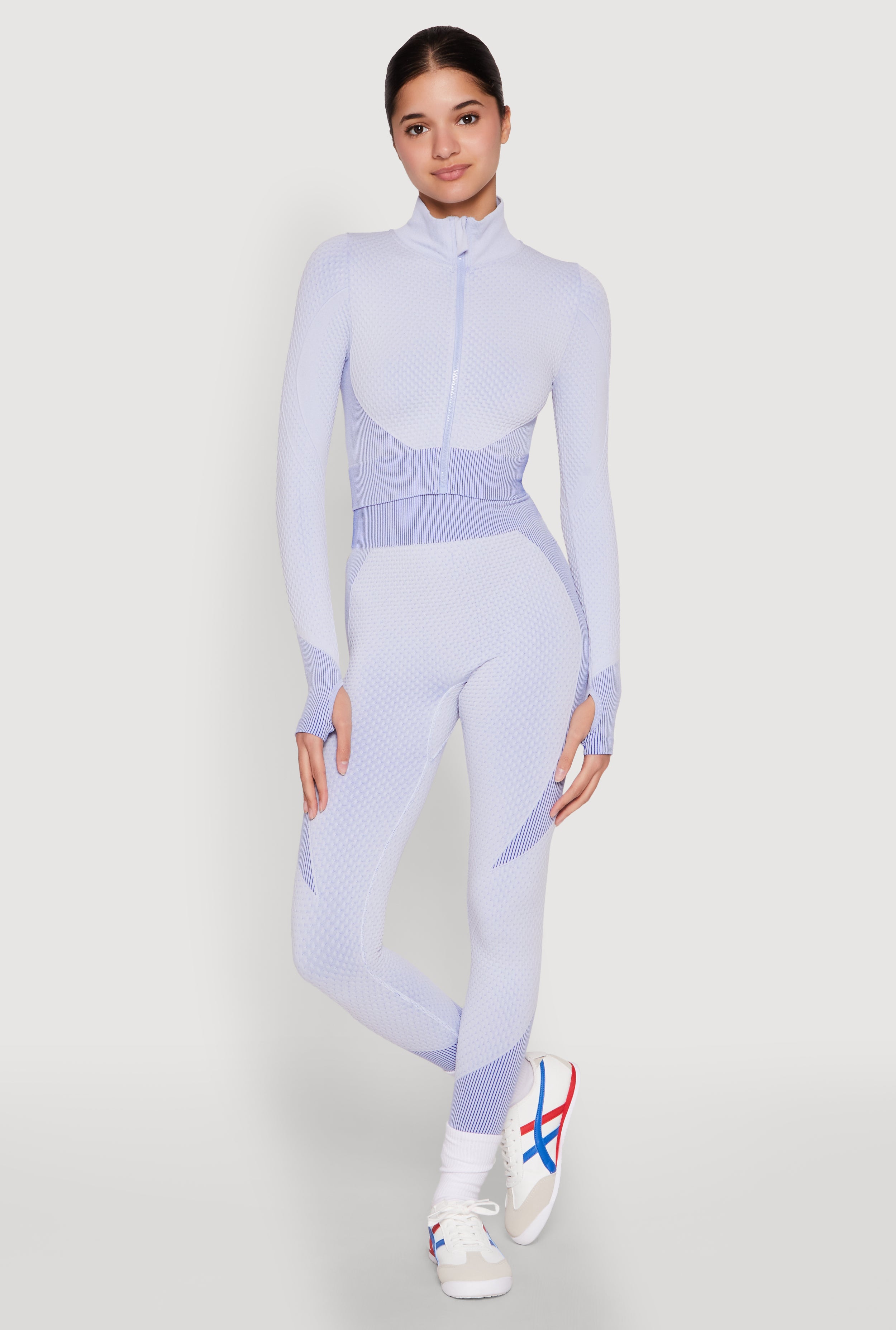 Step up your athleisure game with the Striped Detail Two Tone Track Jacket. Designed for comfort and style, this cropped hem jacket features a sleek mock neck and long sleeves that keep you cozy during your workouts or casual outings. The textured knit fabric adds a touch of sophistication, while the bold striped details give it that effortlessly cool vibe. Whether you're hitting the gym or just running errands, this versatile piece is your new go-to for looking fresh and feeling confident.
