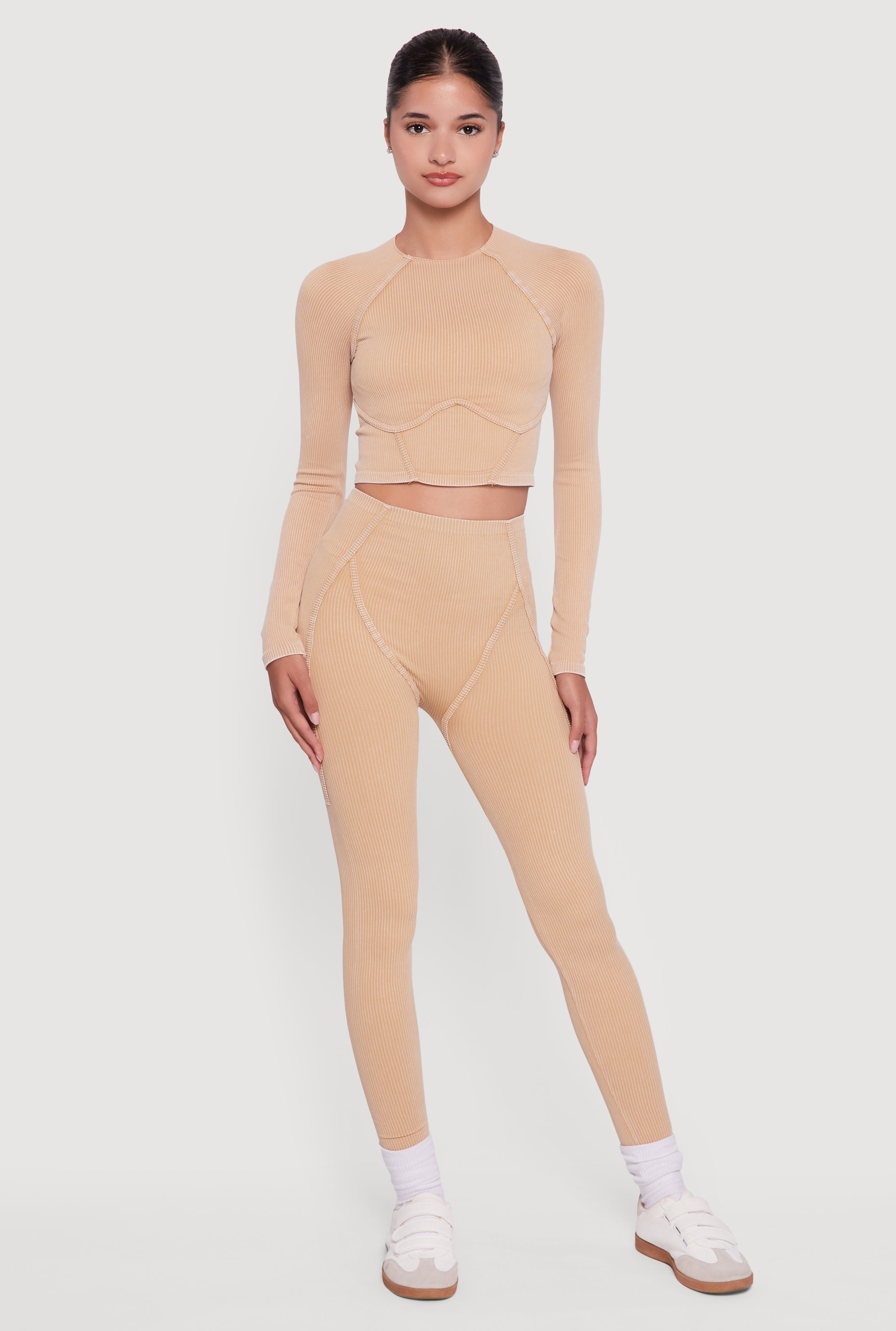 Acid Wash Ribbed Knit Decorative Stitch Active Crop Top