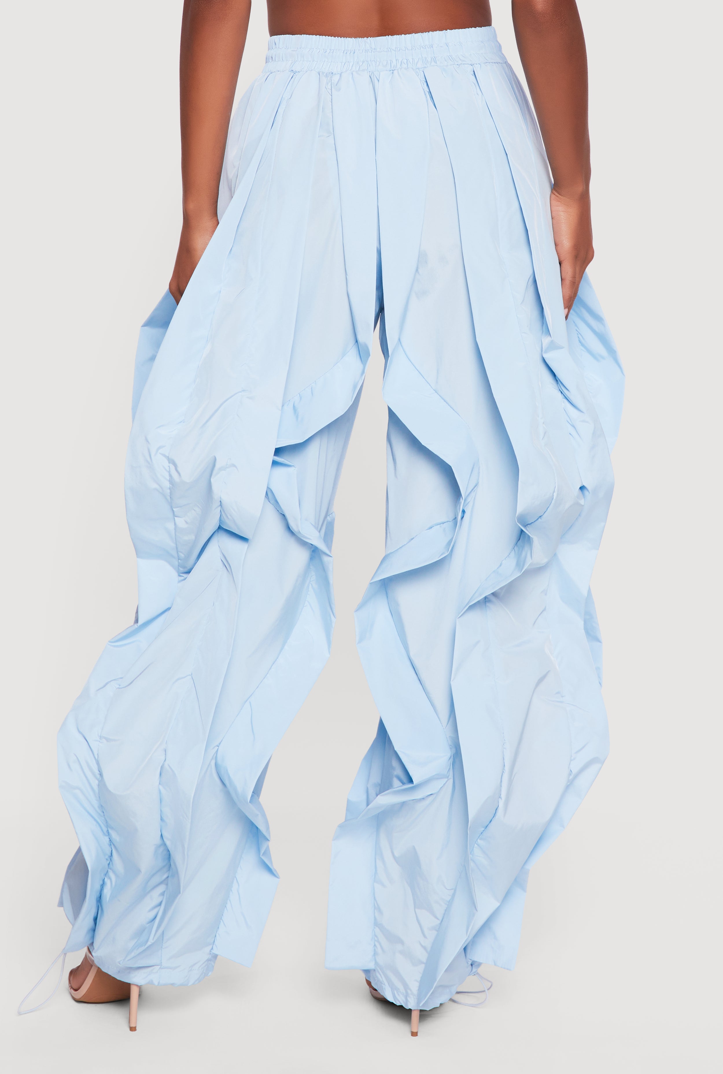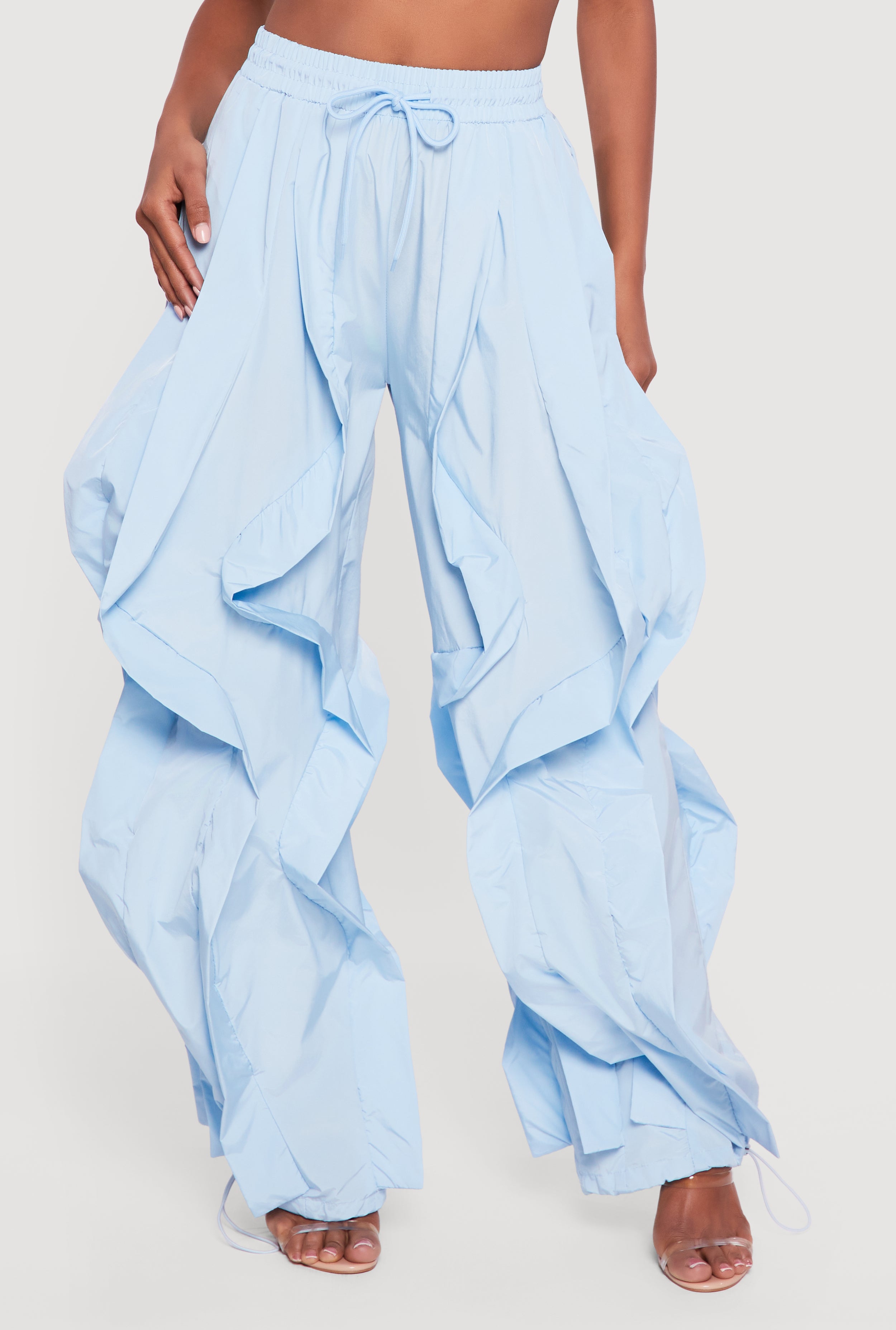 Step up your casual game with these Drawstring Waist Ruffle Parachute Pants. Designed for comfort and style, these joggers feature a mid-rise fit and wide-leg silhouette that gives you that effortlessly cool, baggy vibe. The playful ruffle detail and adjustable drawstring waist and hem add a fun, flirty touch perfect for festivals or laid-back weekends. Made for those who want to stay comfy without sacrificing style, these pants are your new go-to for easy, breezy looks.