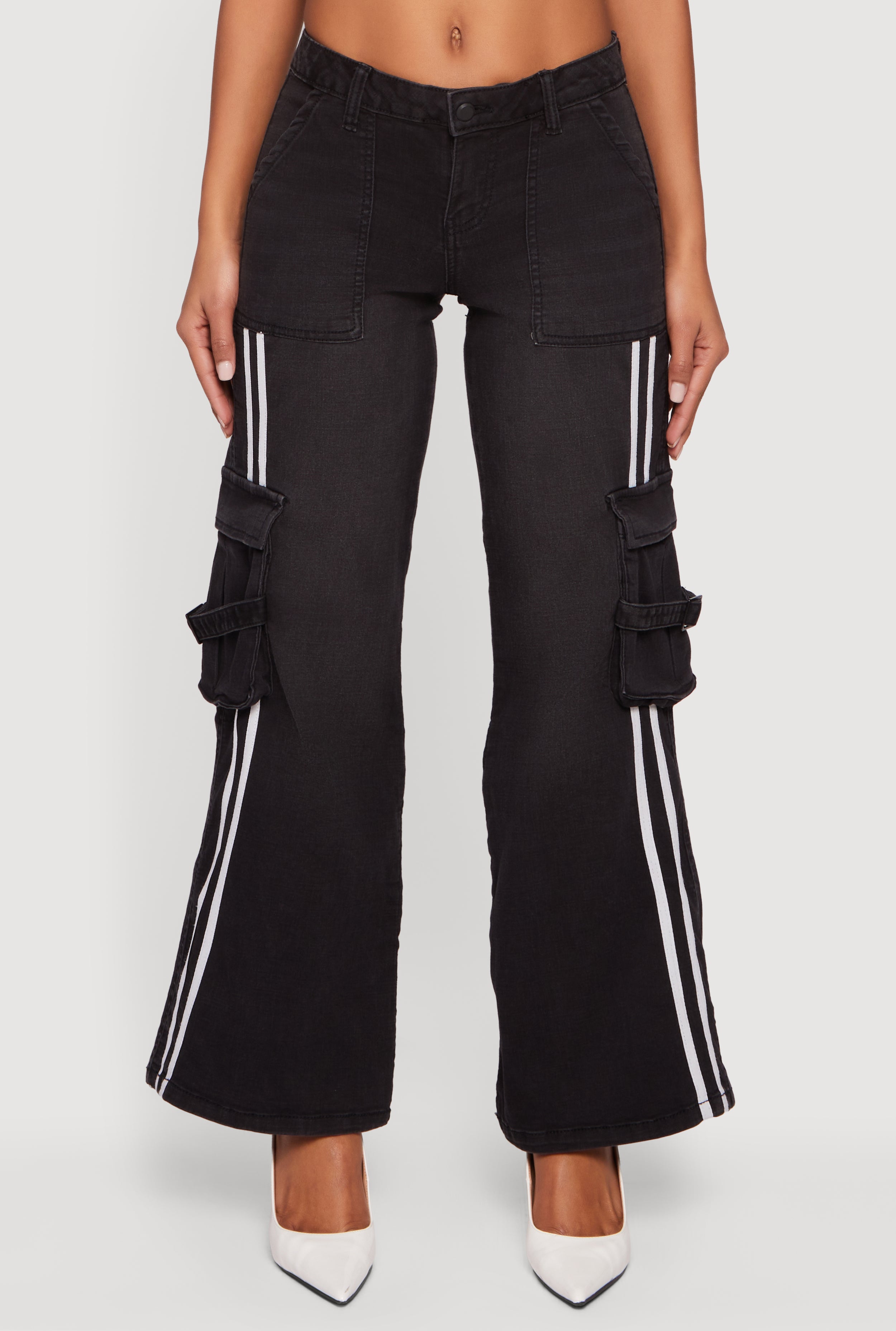 Step up your denim game with these Varsity Stripe Cargo Pocket Flare Leg Jeans. Designed for the trend-savvy woman who loves a mix of sporty vibes and streetwear edge, these jeans feature a flattering mid rise and a modern fit that hugs your curves just right. The standout varsity stripe detail adds a playful pop, while the cargo pockets bring functional style to your everyday look. Perfect for casual days when you want to feel comfortable but still turn heads.