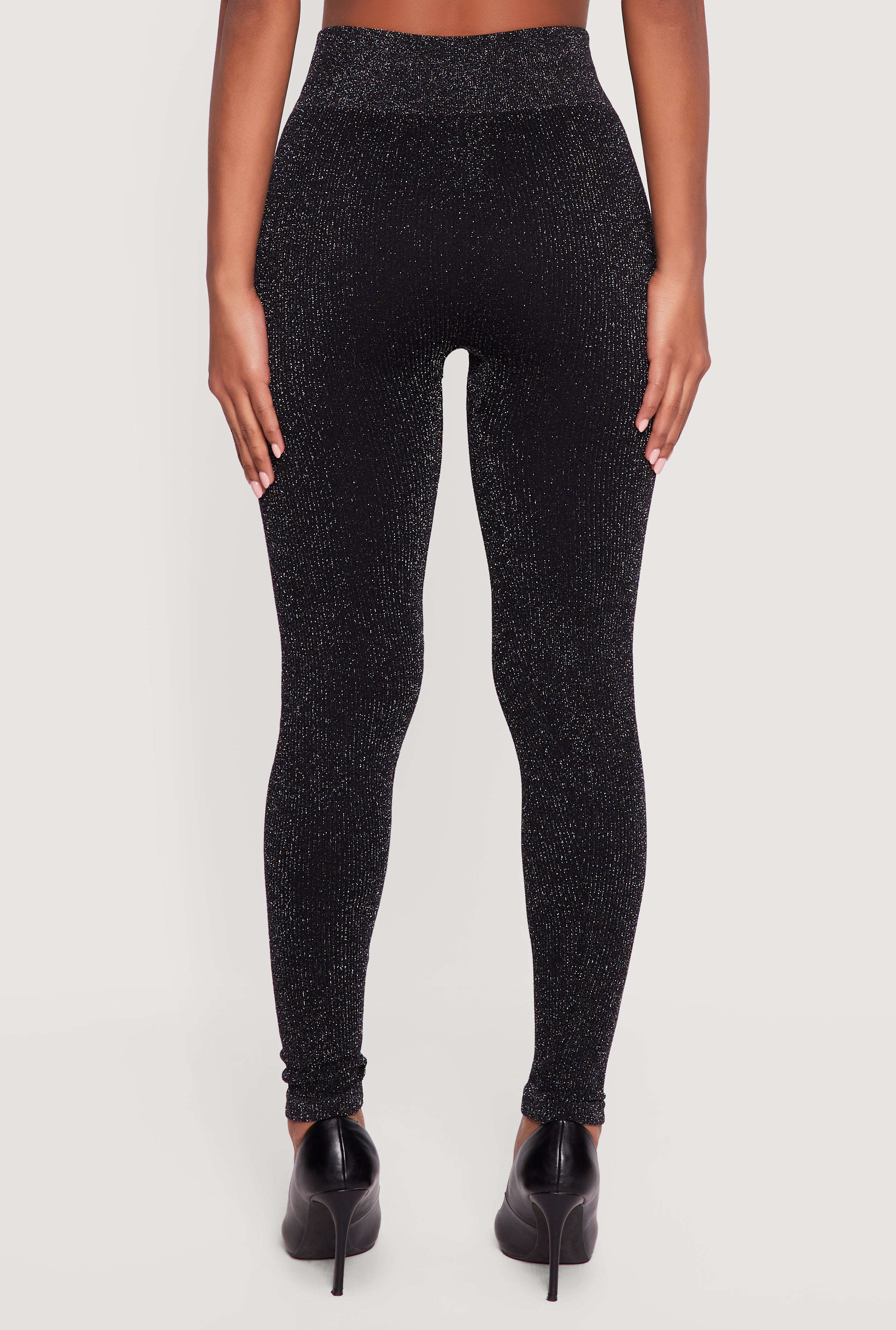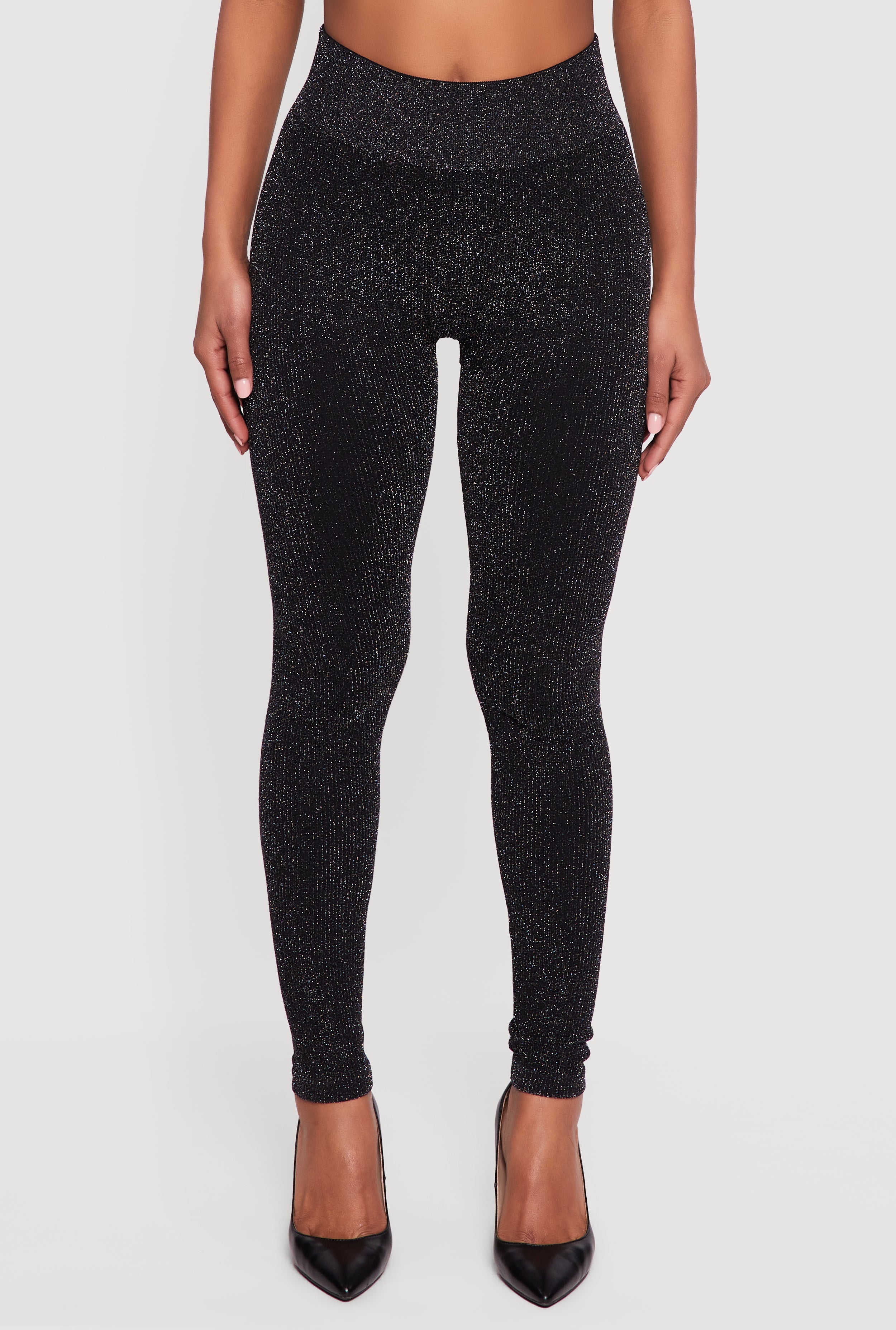These high-waisted leggings feature a sleek ribbed knit texture with subtle lurex threading for a touch of shimmer. Designed with a skinny fit that tapers to the ankle, they provide a flattering silhouette perfect for casual wear. The stretchy fabric moves with you for everyday ease.