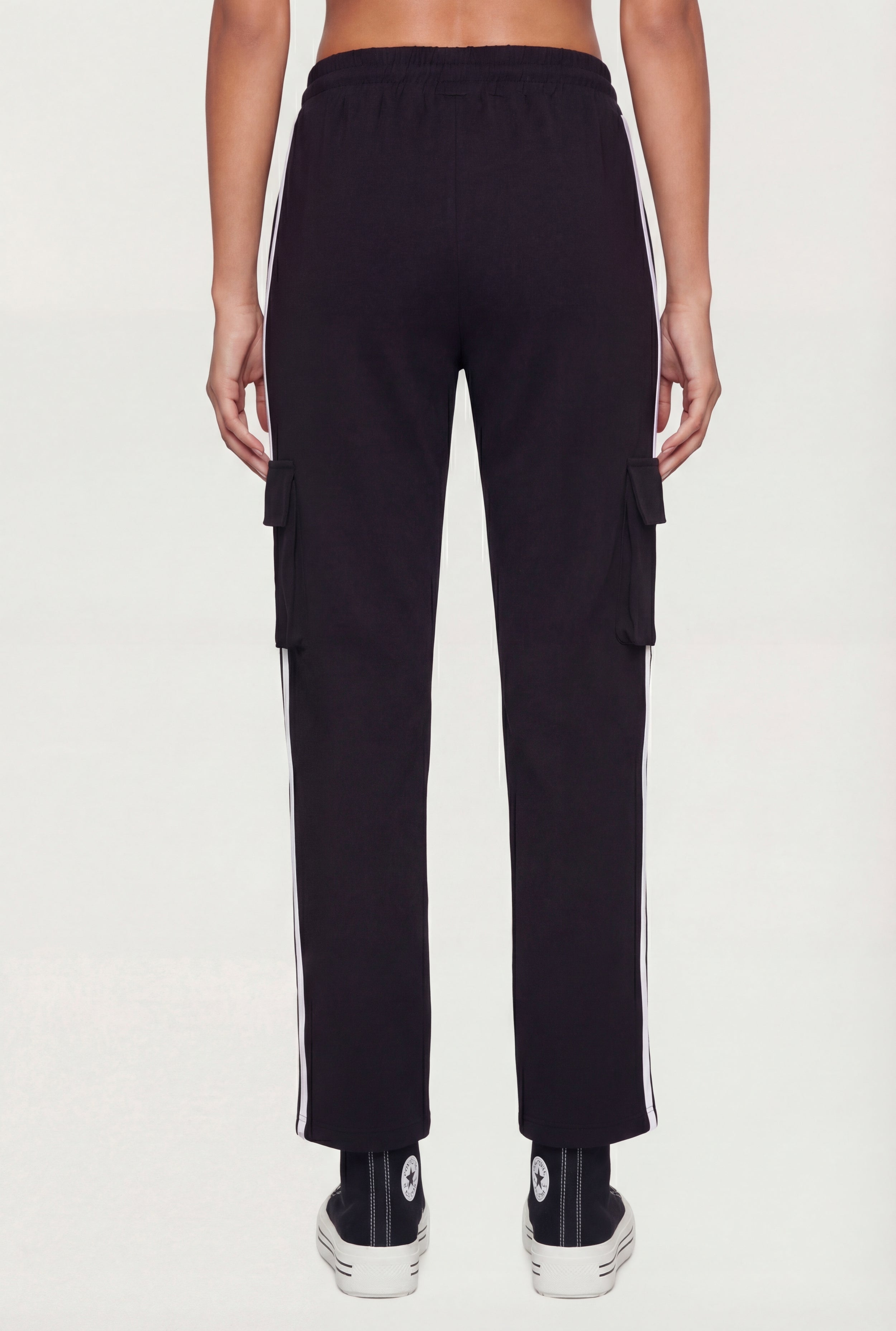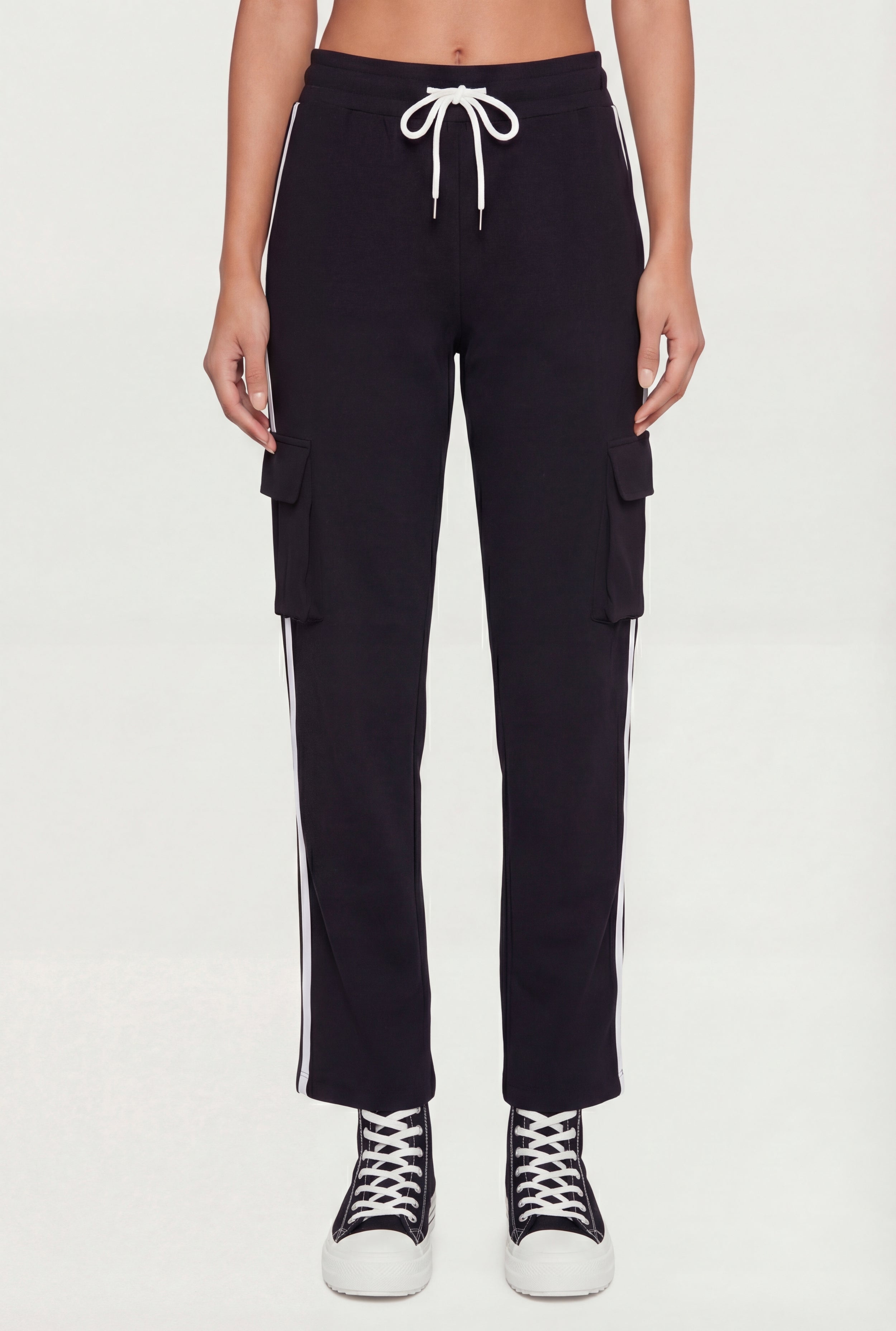These track pants bring a sporty edge with a mid-rise fit and straight-leg silhouette. Designed with a pull-on style and adjustable drawstring waist, they offer easy wear and a modern fit. Cargo pockets add practical storage while varsity stripes along the sides elevate the athleisure vibe.