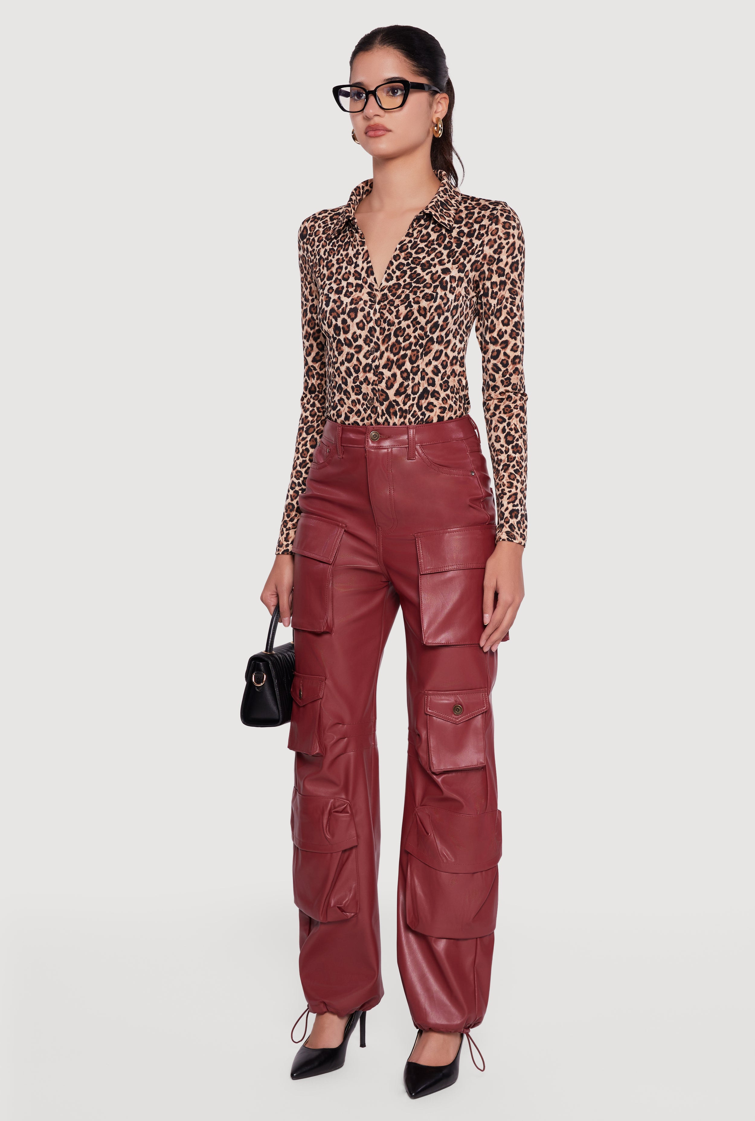 These straight-leg cargo pants combine edgy faux leather with practical fleece lining for warmth. Featuring a high waist and multiple cargo pockets, they offer a bold, utilitarian style perfect for fall and winter. The adjustable drawstring hem adds a customizable finish to your look.