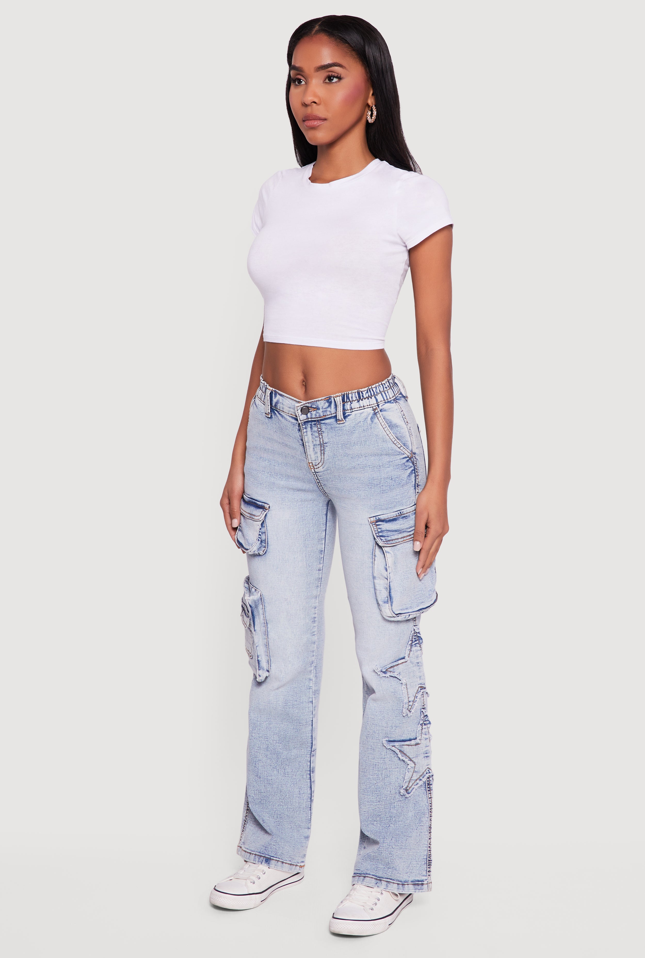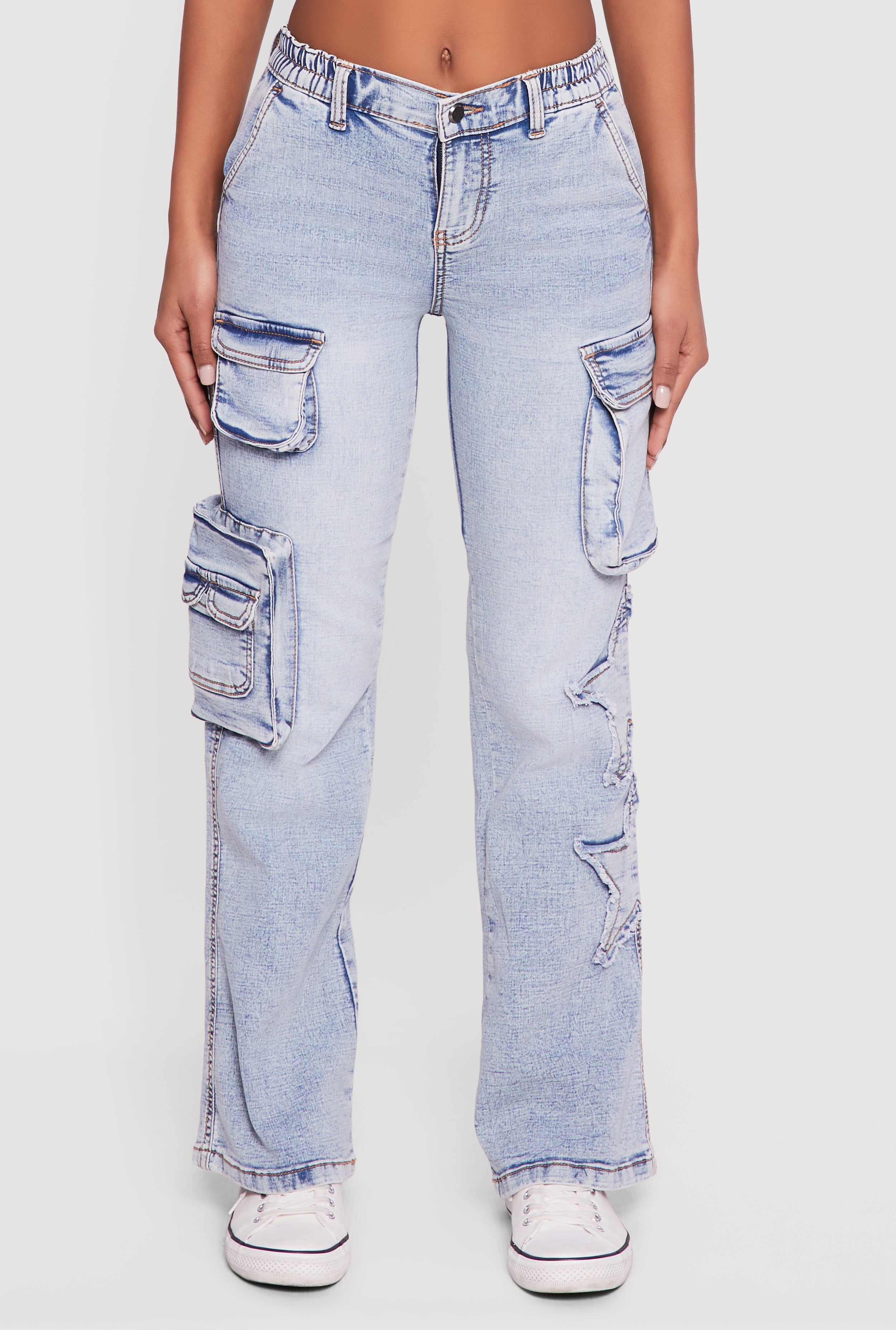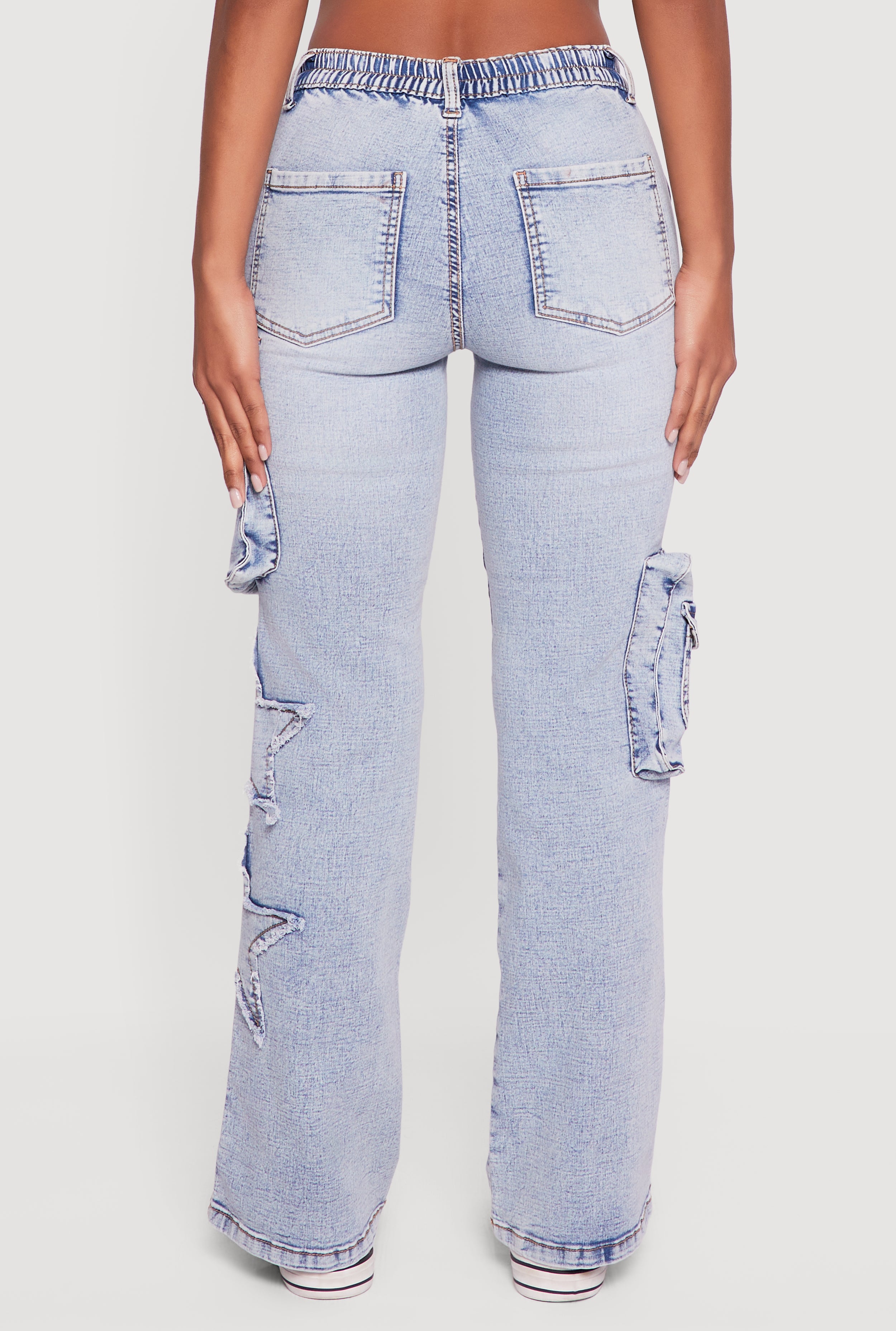 Step up your style game with these Star Applique Acid Wash Straight Leg Cargo Jeans. Featuring a cool acid wash finish and relaxed straight-leg fit, these jeans bring effortless streetwear vibes to your casual wardrobe. The standout star applique and cargo pockets add playful details that make these jeans uniquely you. Perfect for those days when comfort meets cool, they pair easily with your favorite tees and sneakers for an on-trend look that never tries too hard.