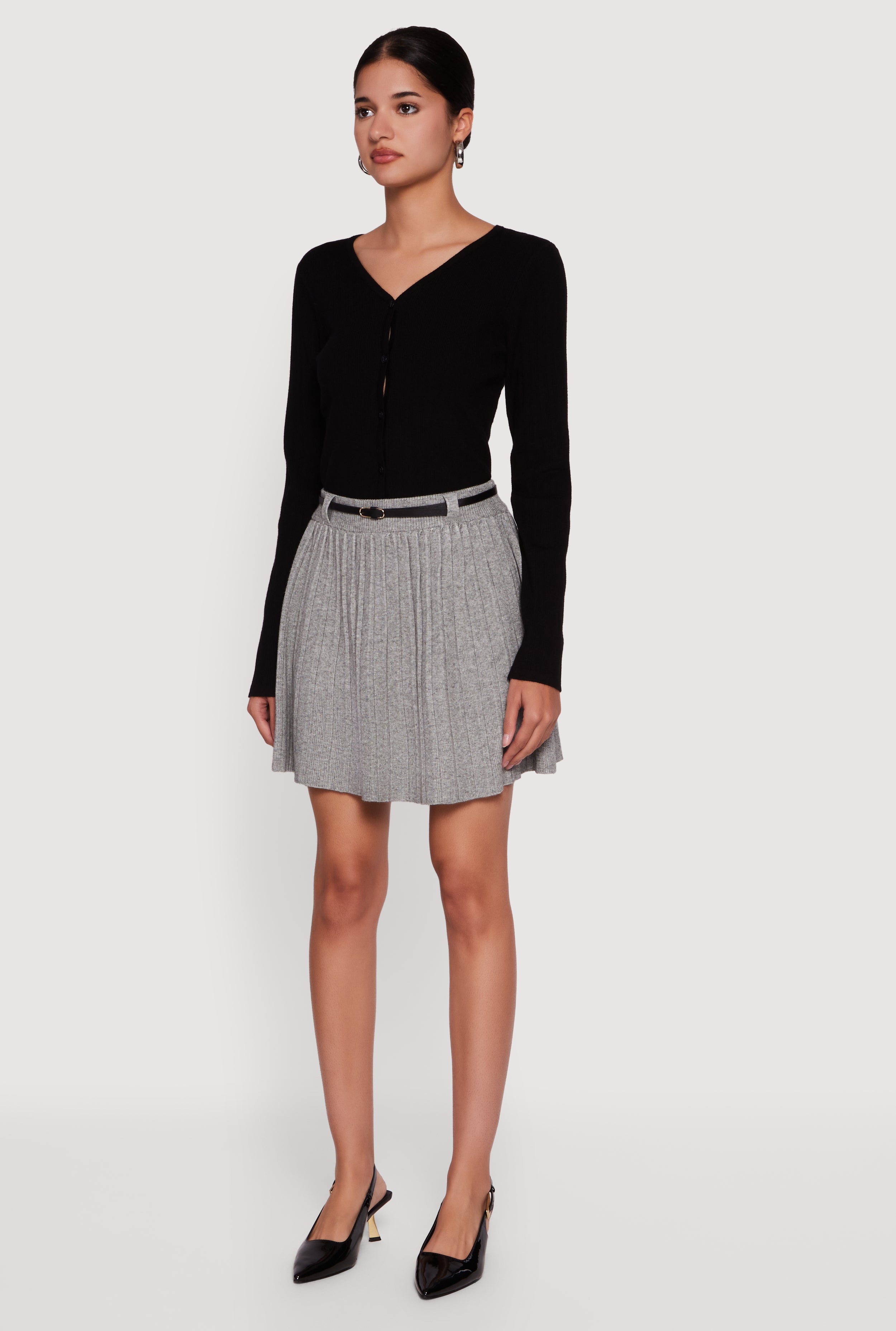 Step up your style game with this Marled High Waisted Pleated Skirt with Belt. Designed to flatter every figure, this mini skirt features a trendy marled pattern and classic pleats that add a playful yet polished vibe. The high waist and included belt help define your silhouette, making it perfect for casual hangouts or office days when you want to keep it chic and comfortable. Made from soft ribbed knit fabric, it moves with you while keeping you cozy and stylish all day long.