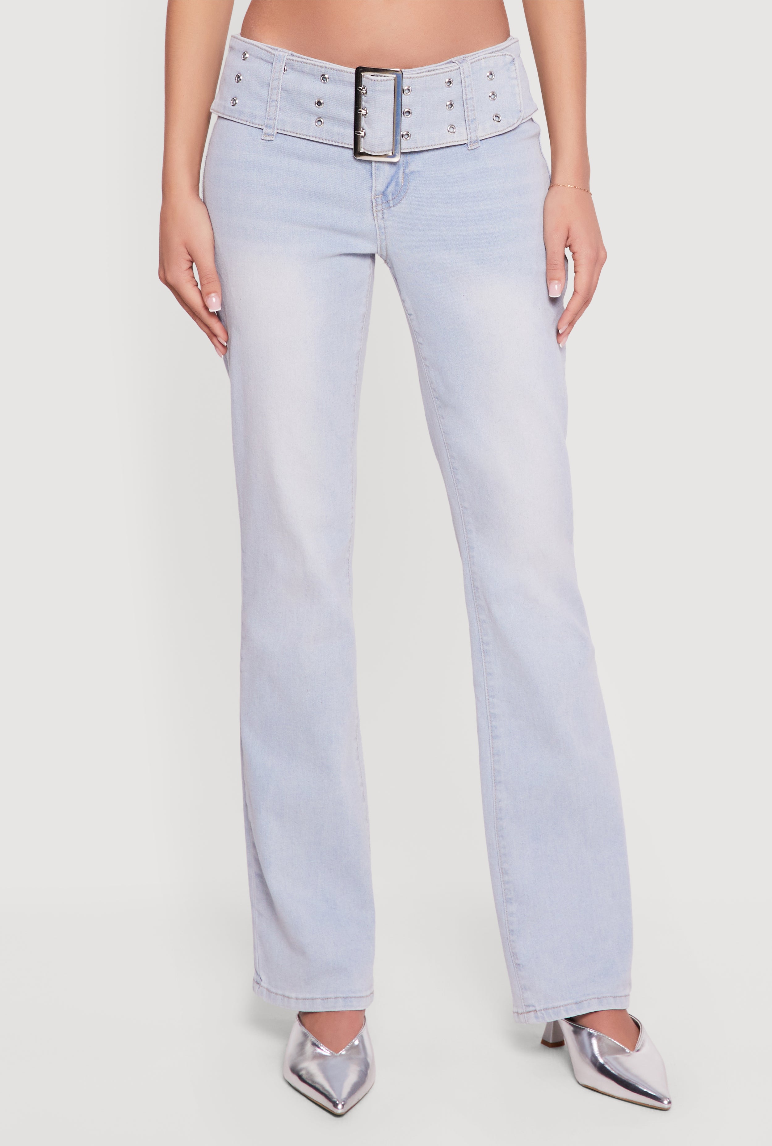 These bootcut jeans feature a low-rise waist with a belted front that adds a stylish touch to your casual wardrobe. Designed with a modern fit, they offer a flattering silhouette that balances comfort and shape. The full-length bootcut leg pairs well with a variety of footwear for versatile styling.