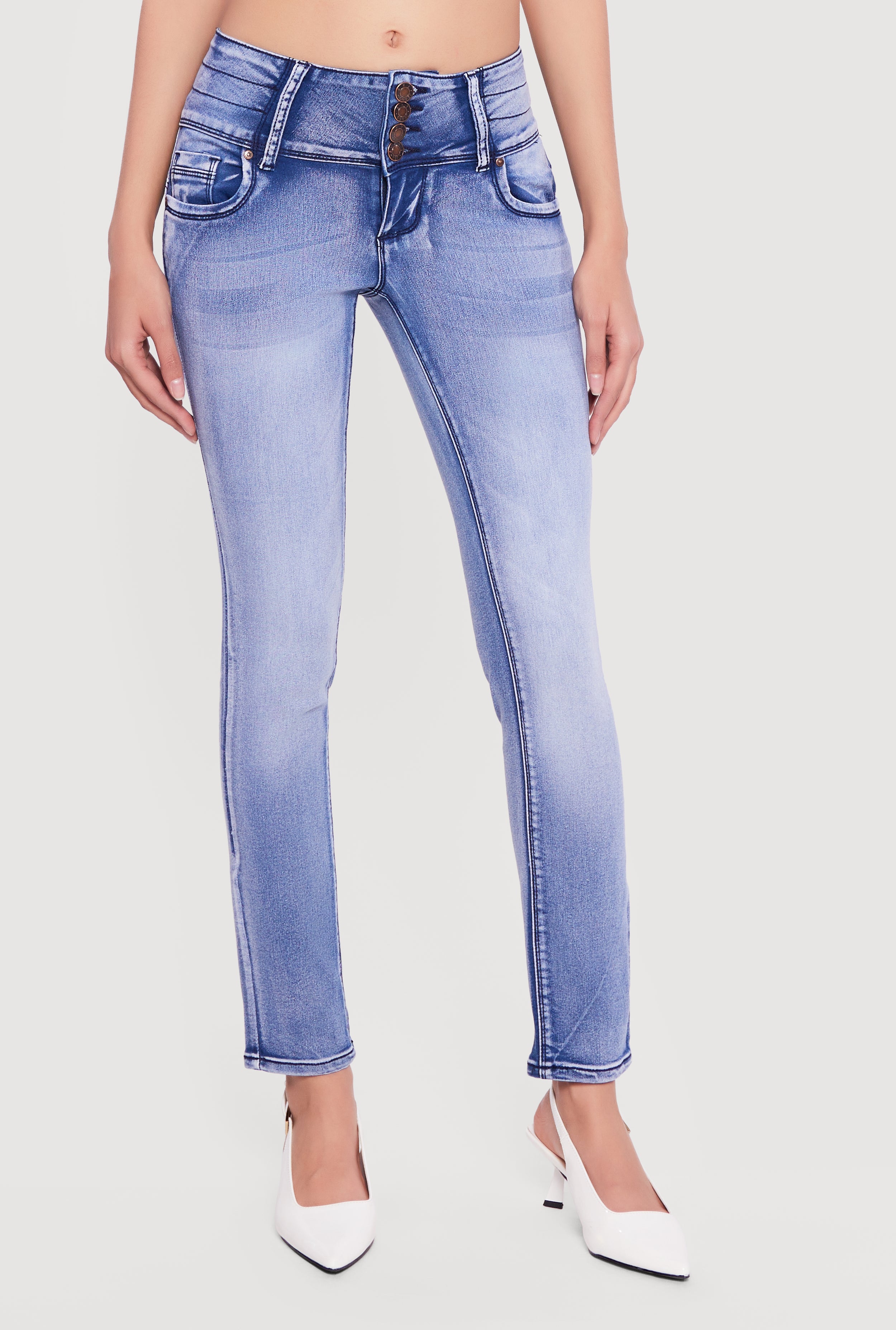 These mid rise skinny jeans feature a sleek 4-button closure that adds a modern twist to classic denim. Designed with a clean ankle-length hem and a classic fit, they offer a streamlined silhouette perfect for casual wear. Crafted from durable denim, they balance style and everyday versatility effortlessly.