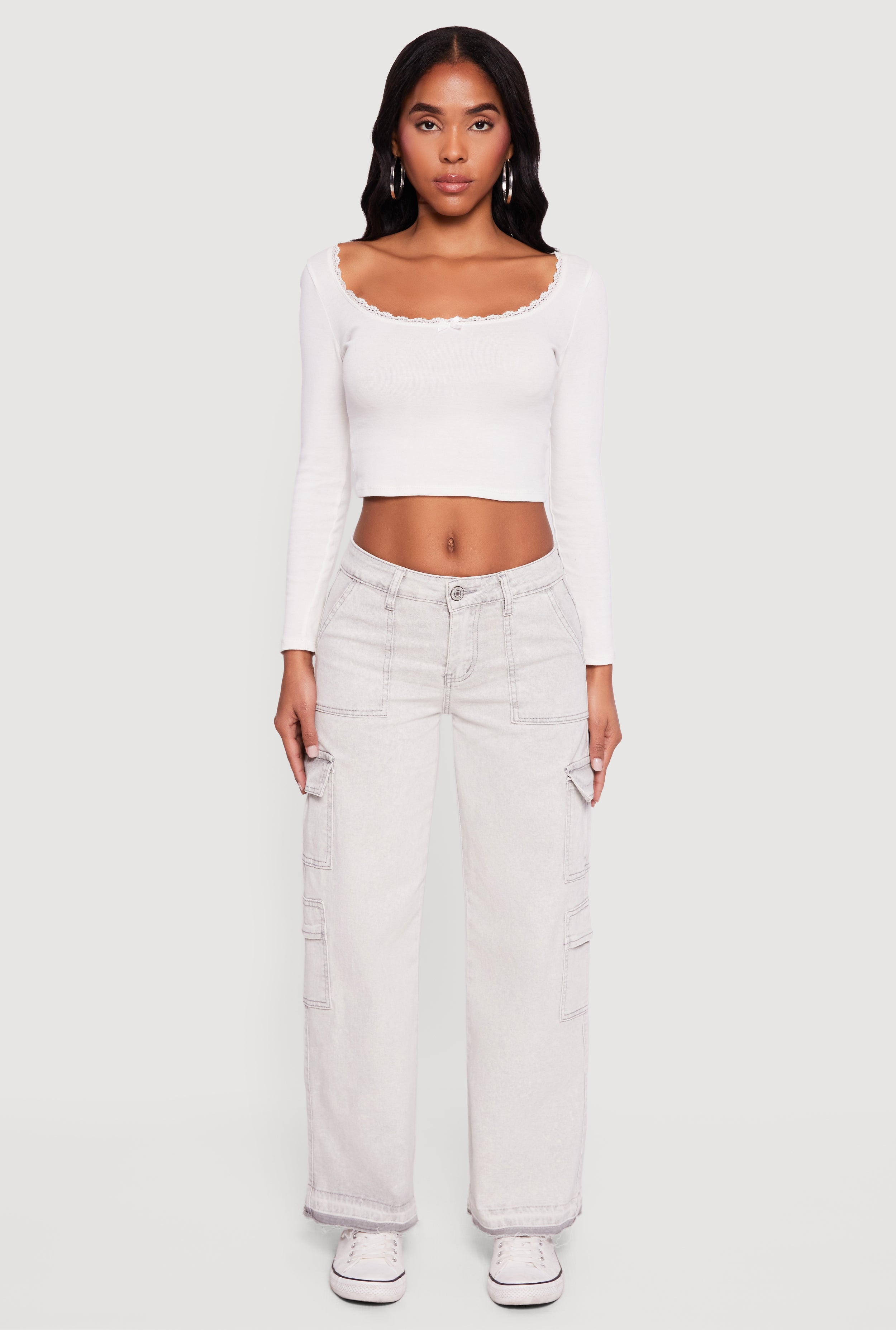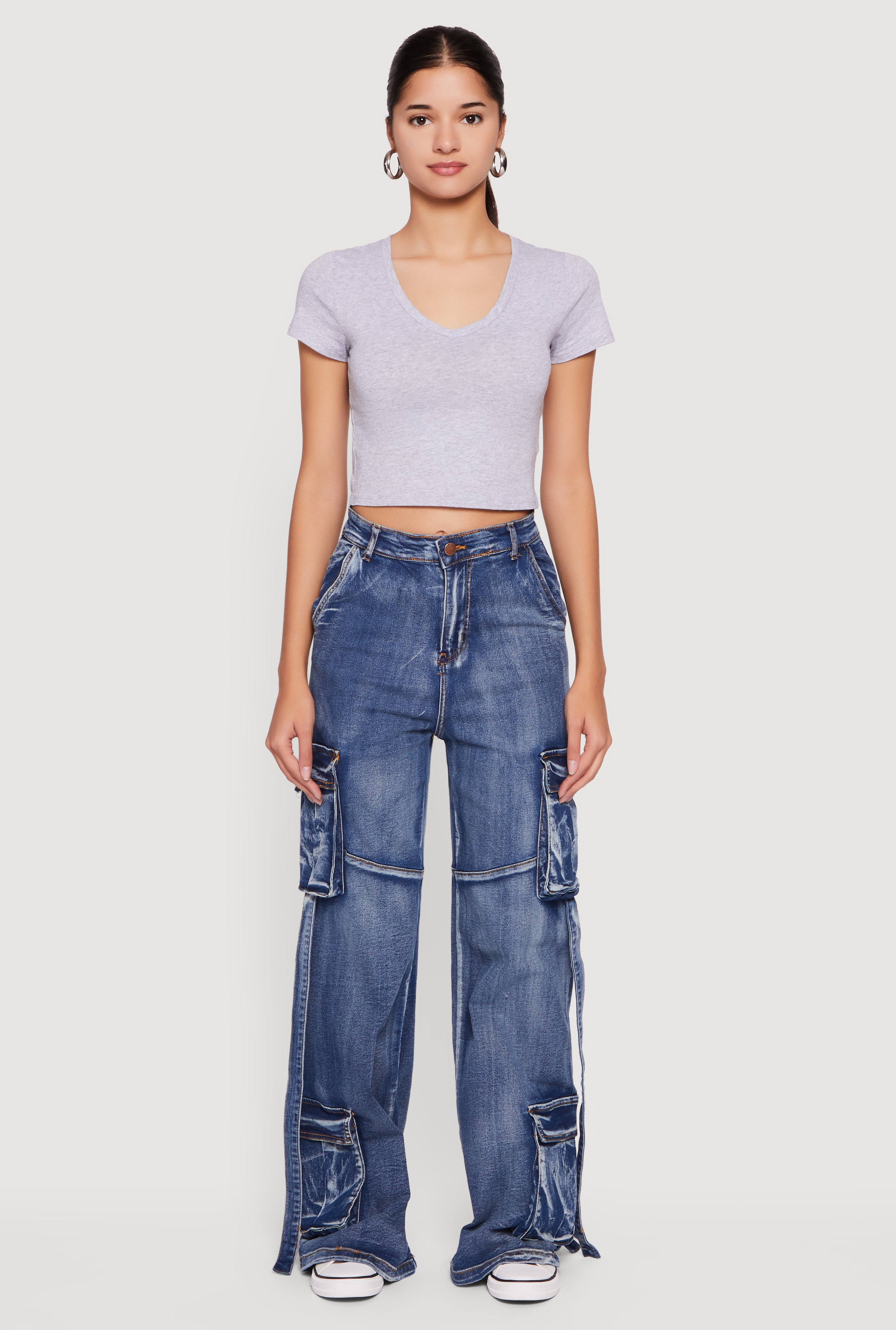 High Waisted Decorative Stitch Cargo Pocket Jeans