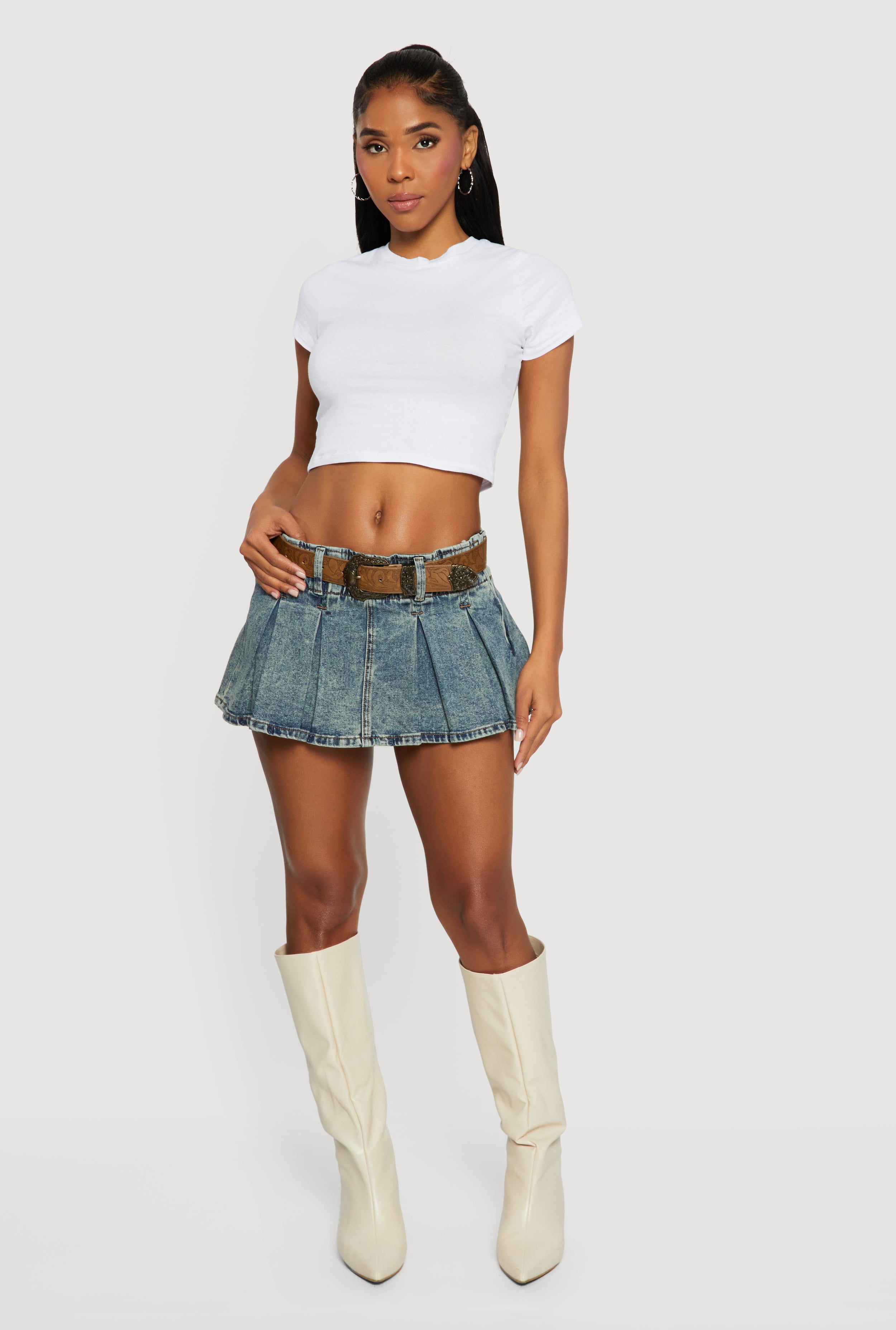 Cowboy Belted Mid Rise Acid Wash Pleated Skort