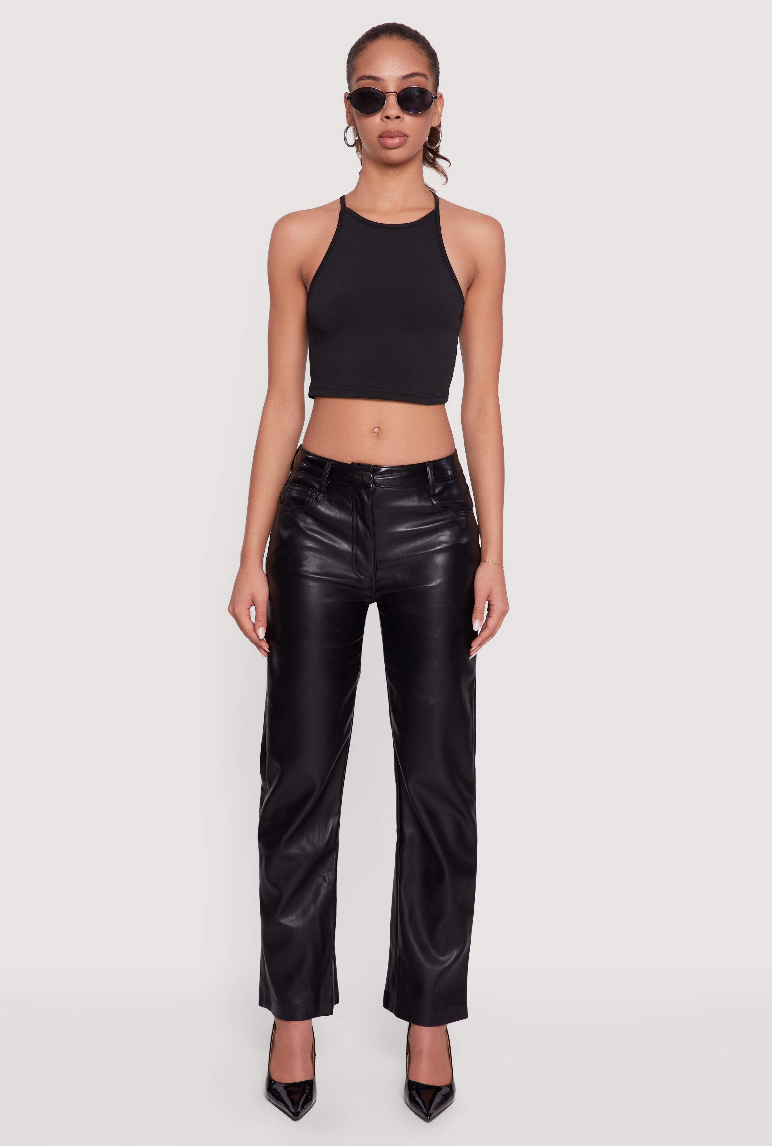 Mid Rise Faux Leather Straight Leg Pants