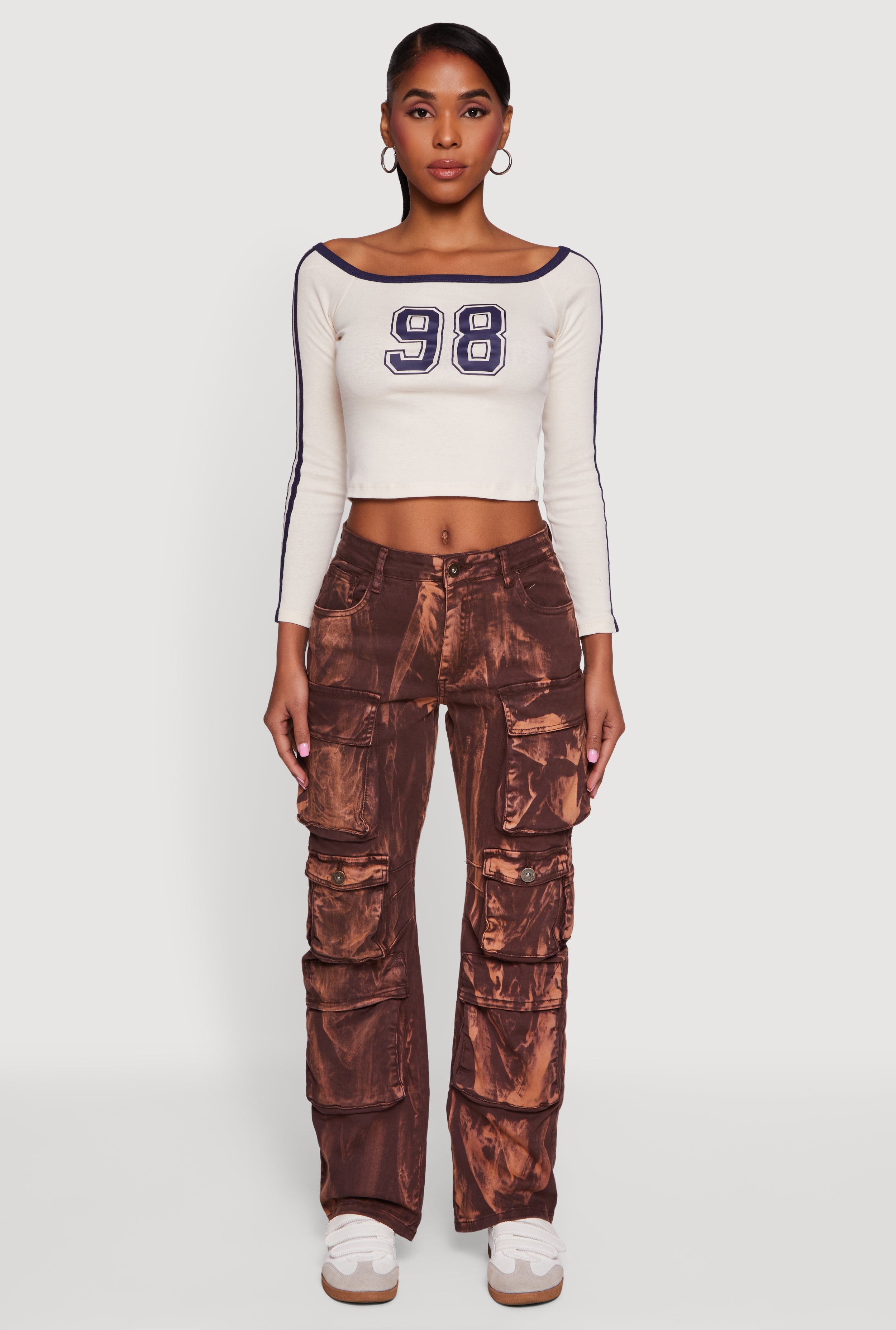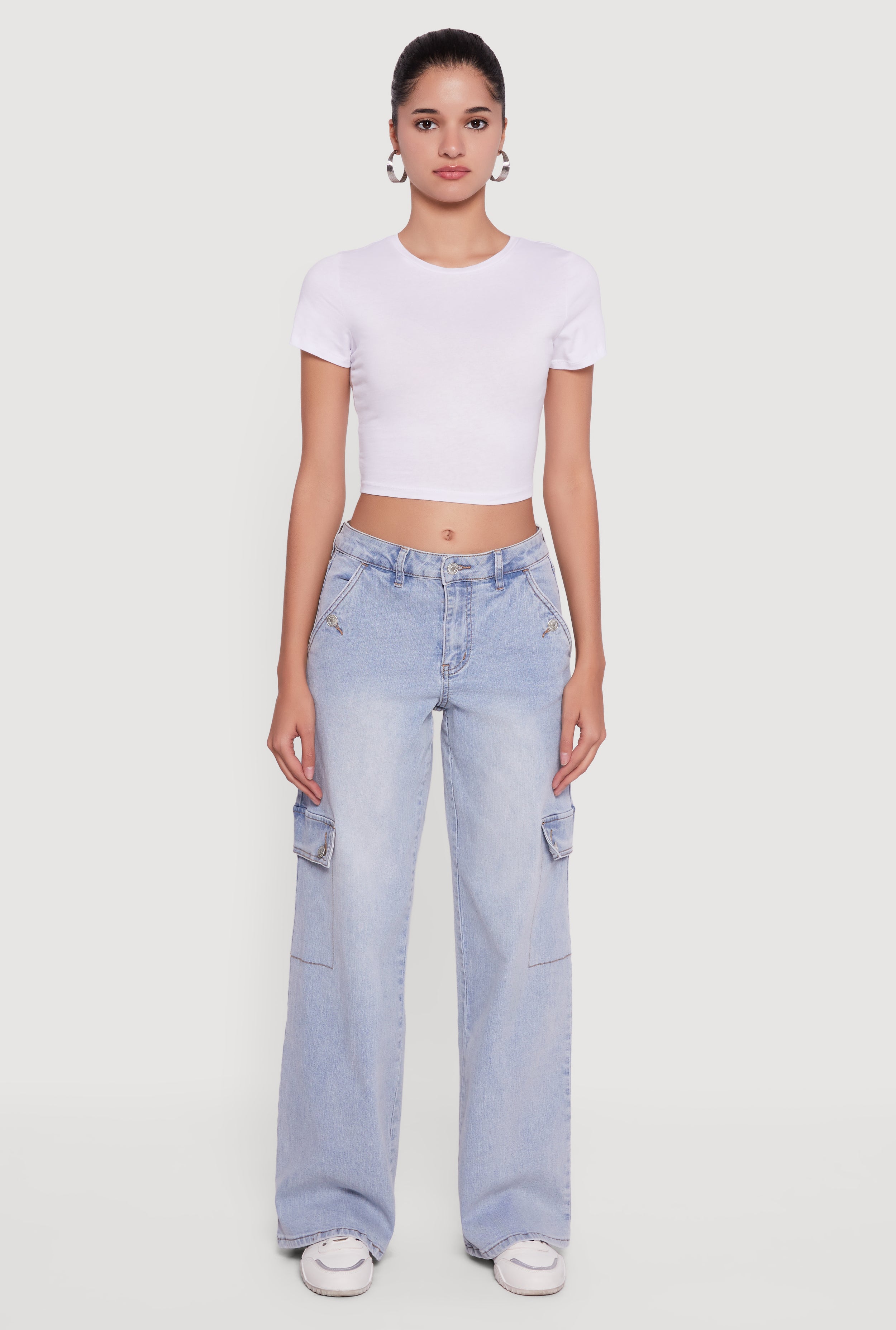 Bleached Detail Mid Rise Wide Leg Cargo Pocket Jeans