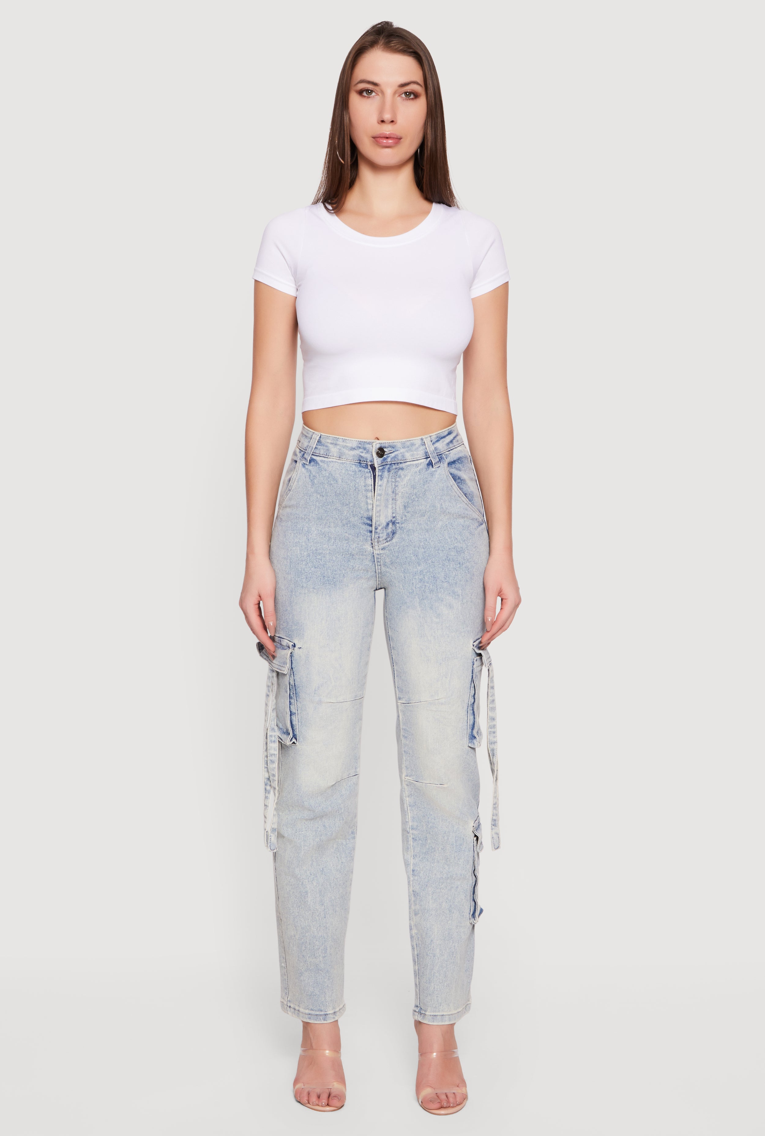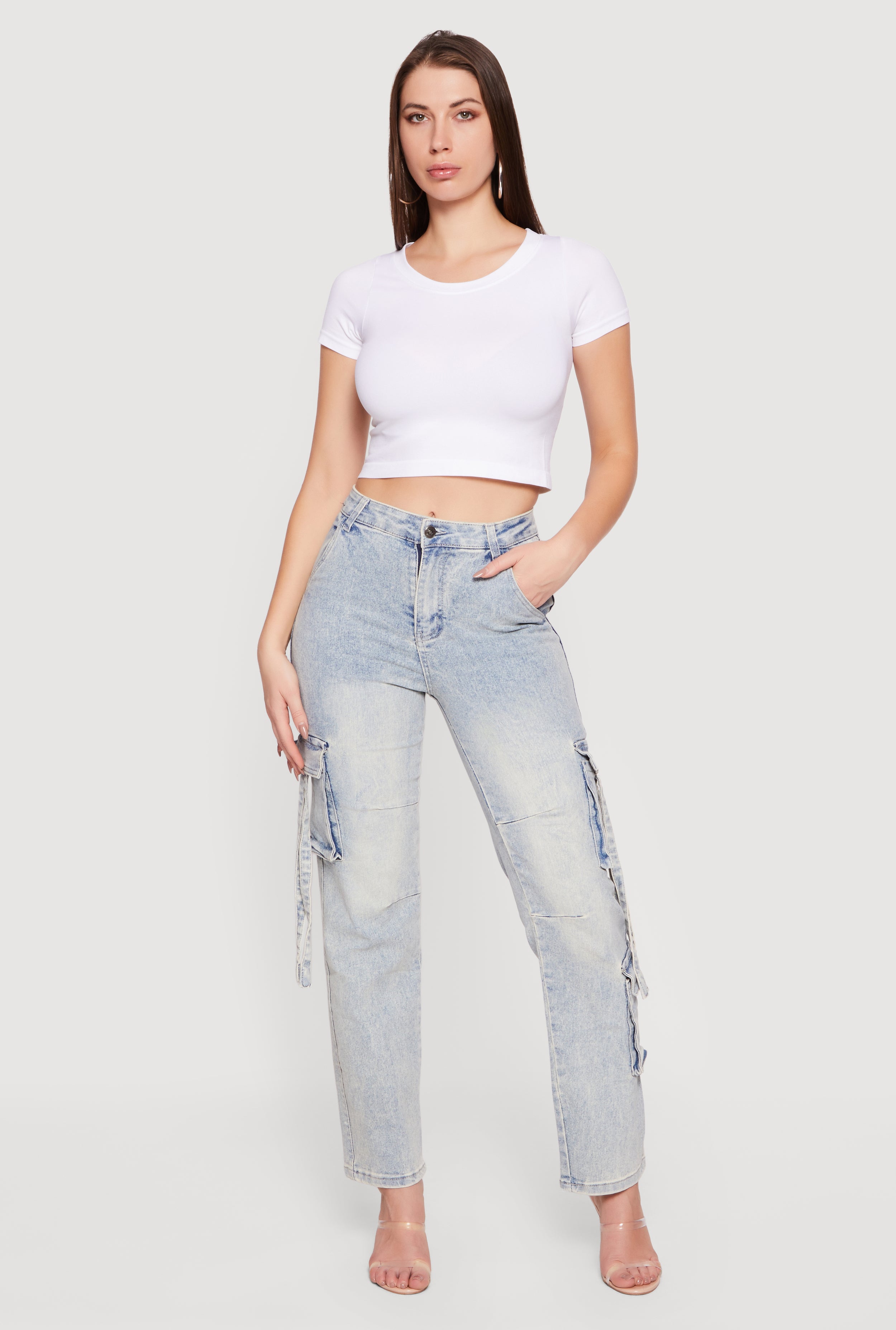 High Waisted Cargo Pocket Acid Wash Jeans