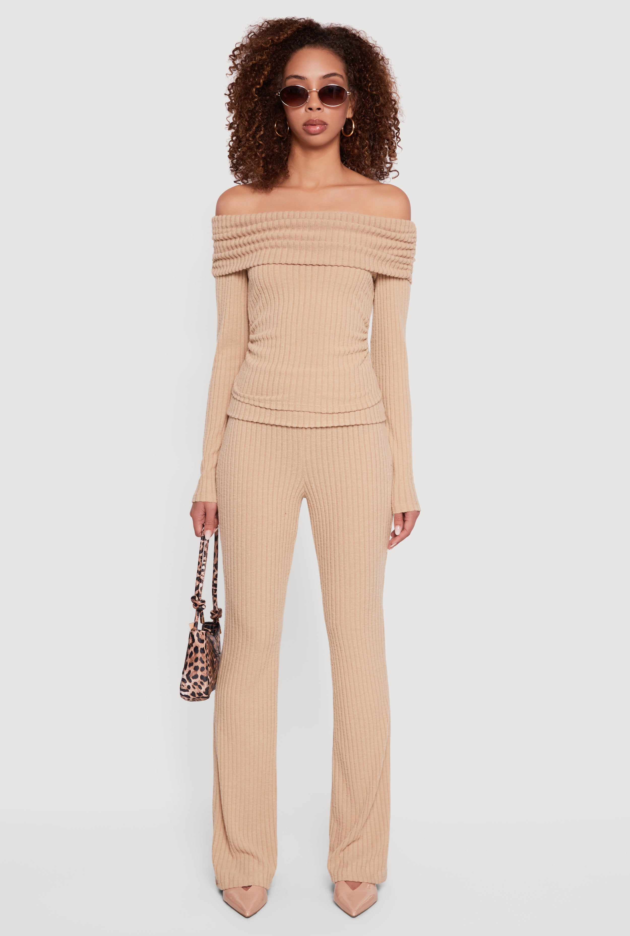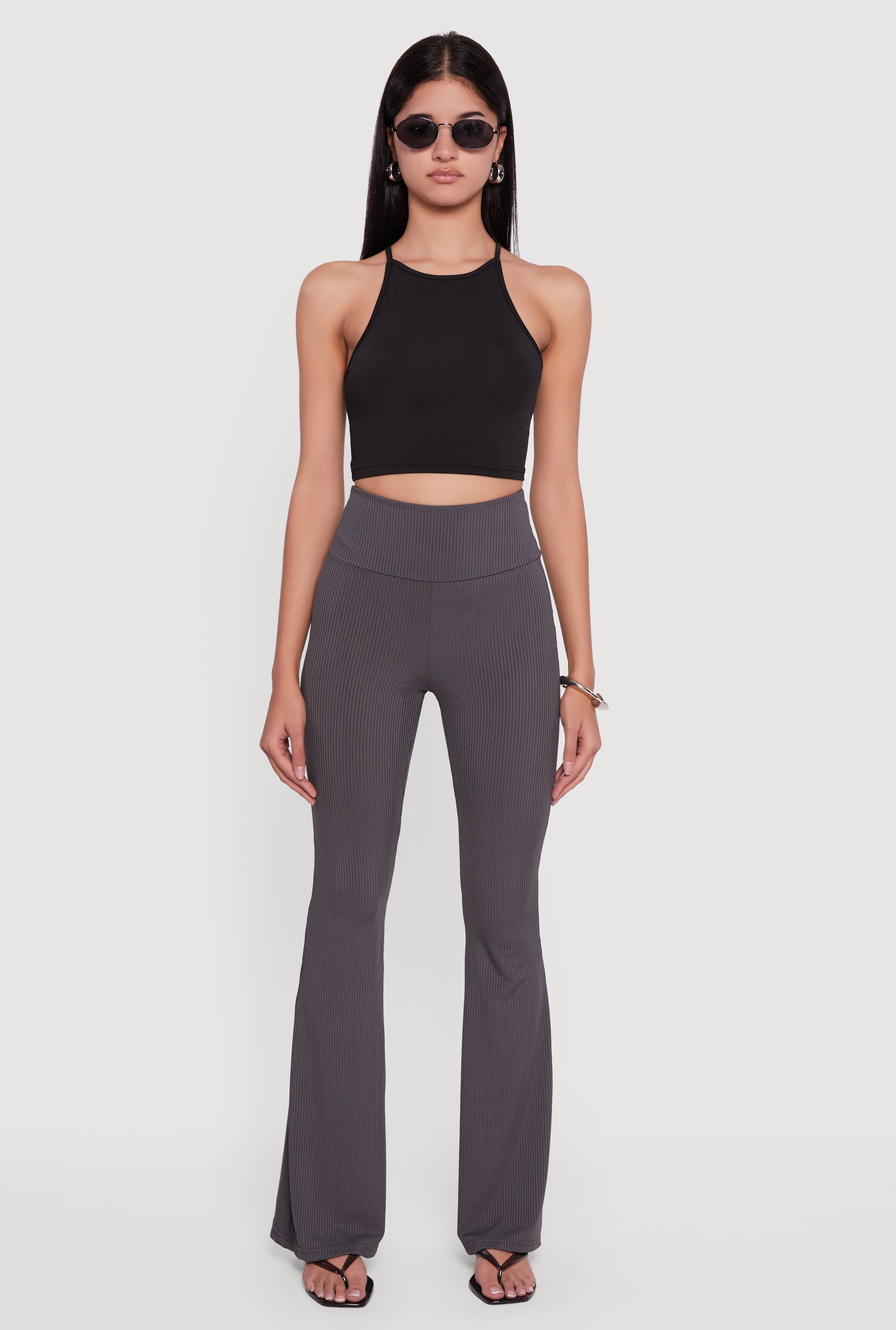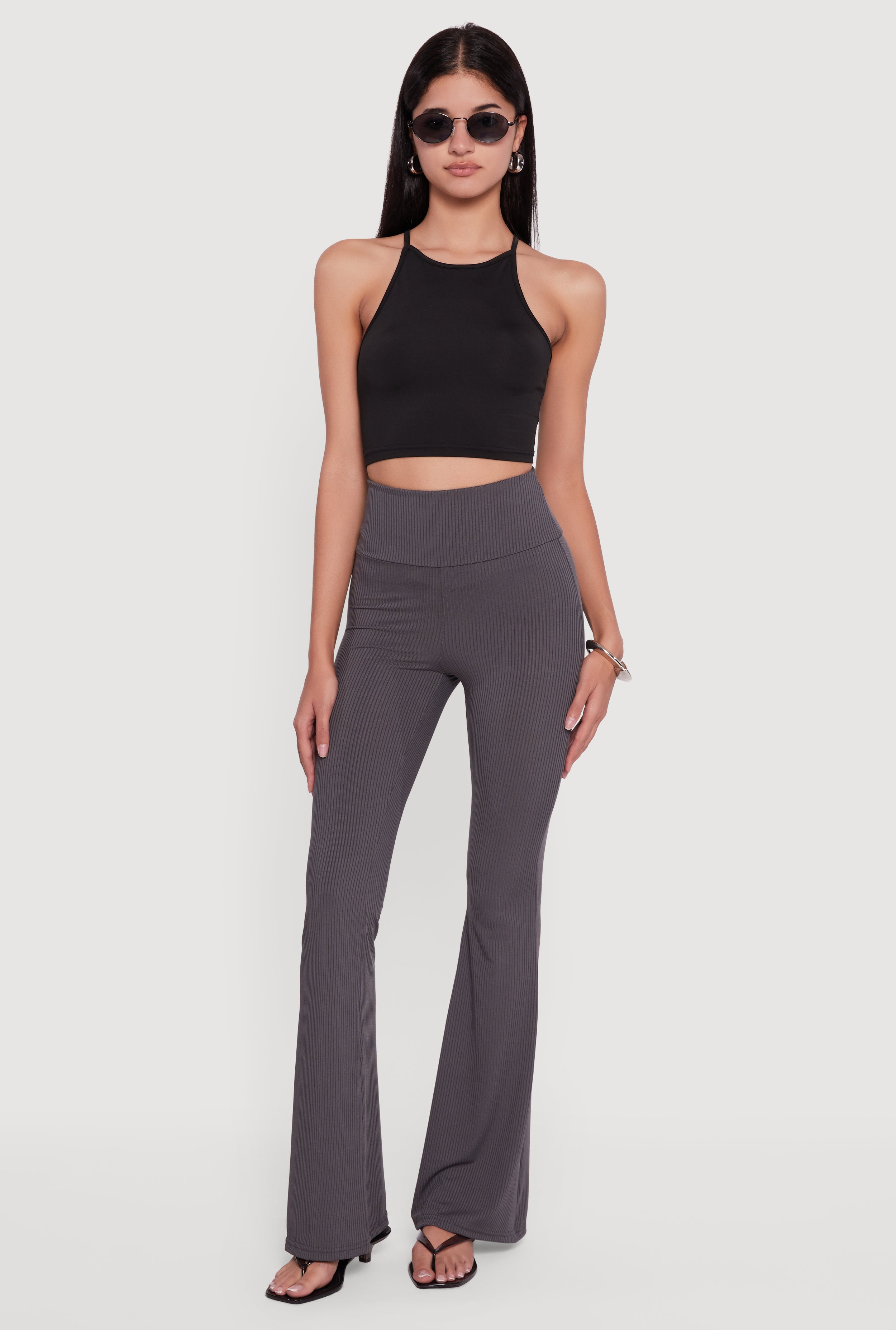 Fold Over High Waisted Flare Leg Ribbed Knit Pants