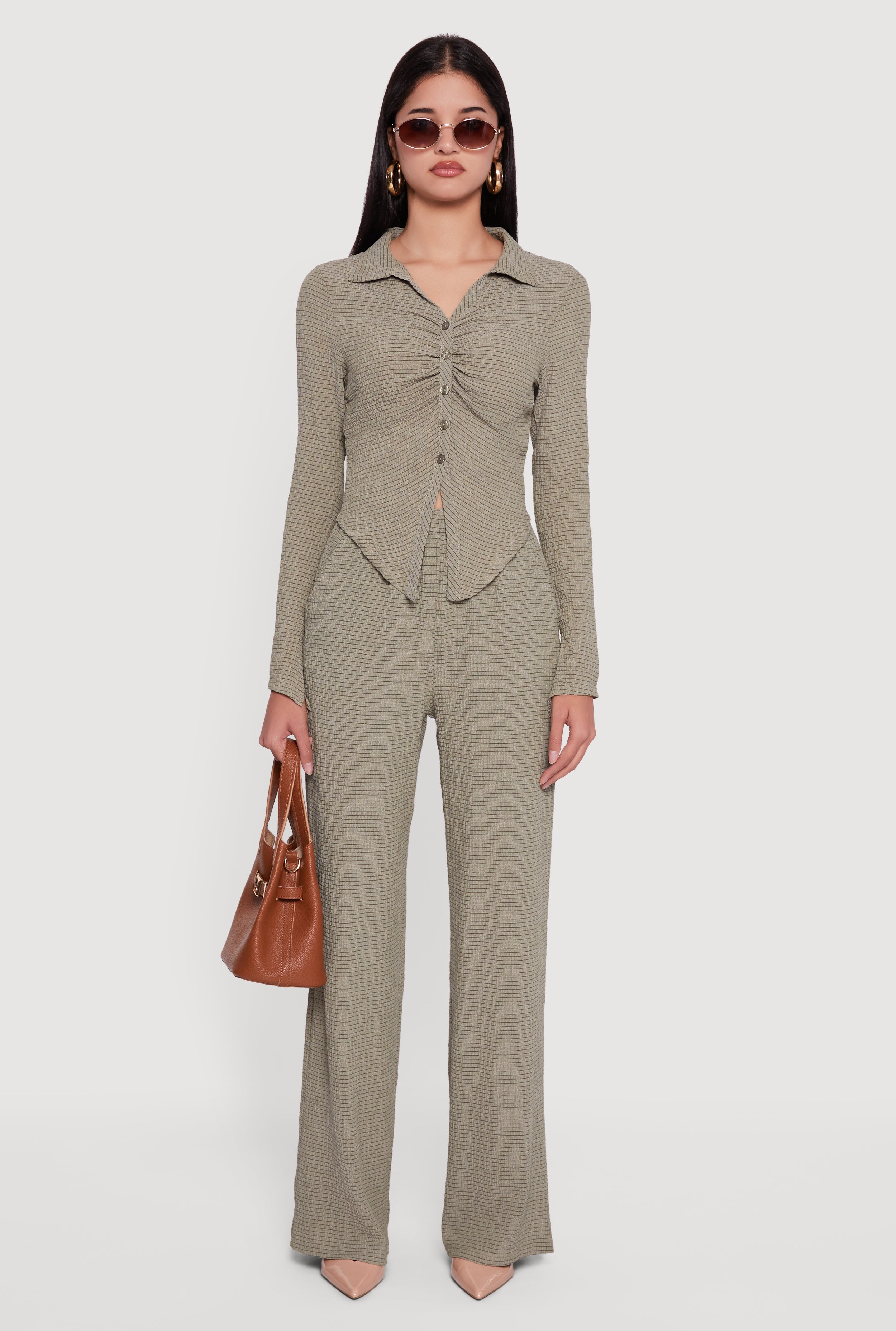 High Waisted Wide Leg Textured Knit Dress Pants