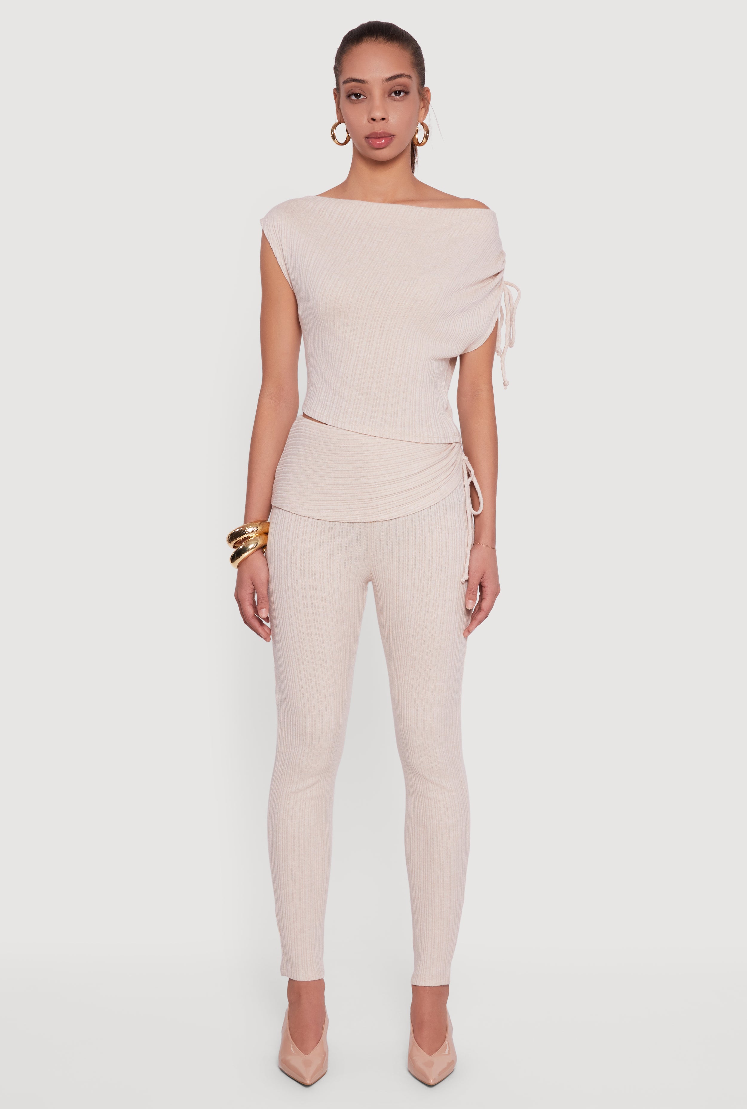 Brushed Rib Knit Fold Over Ruched Side Leggings