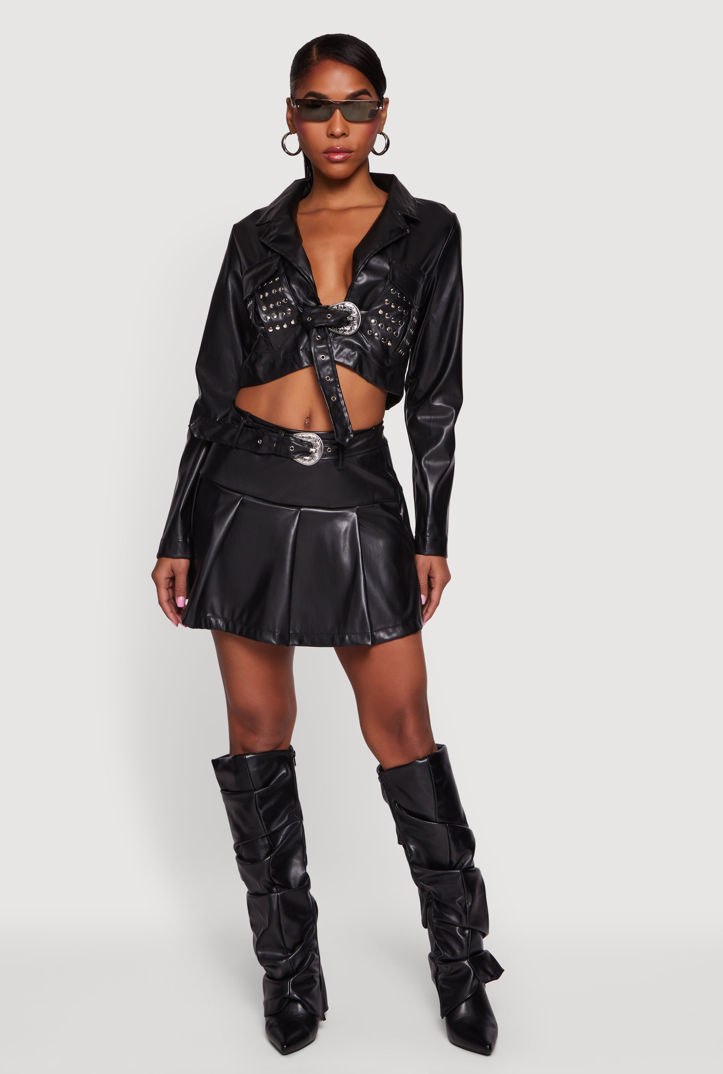 Belted Faux Leather Drop Waist Pleated Skirt