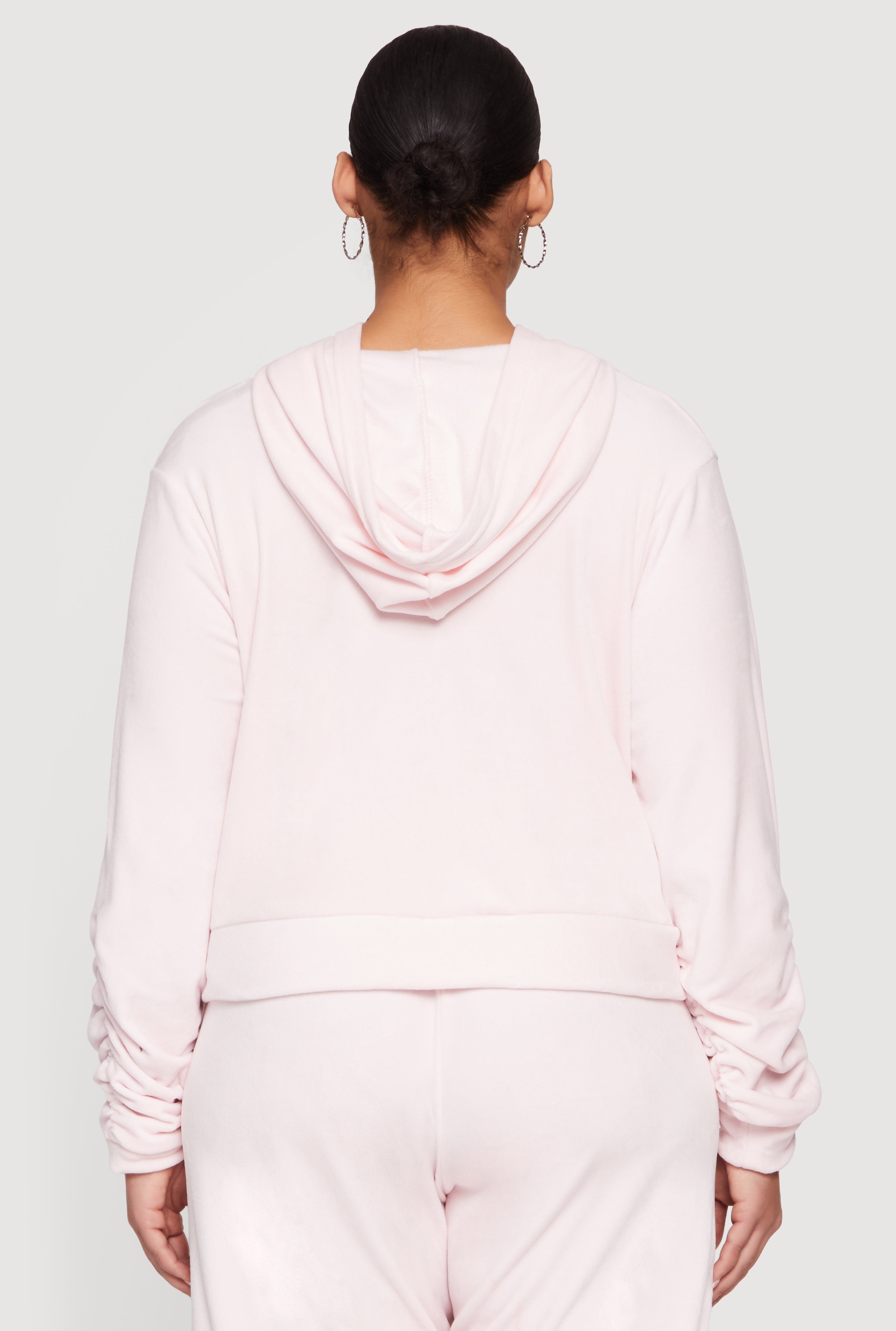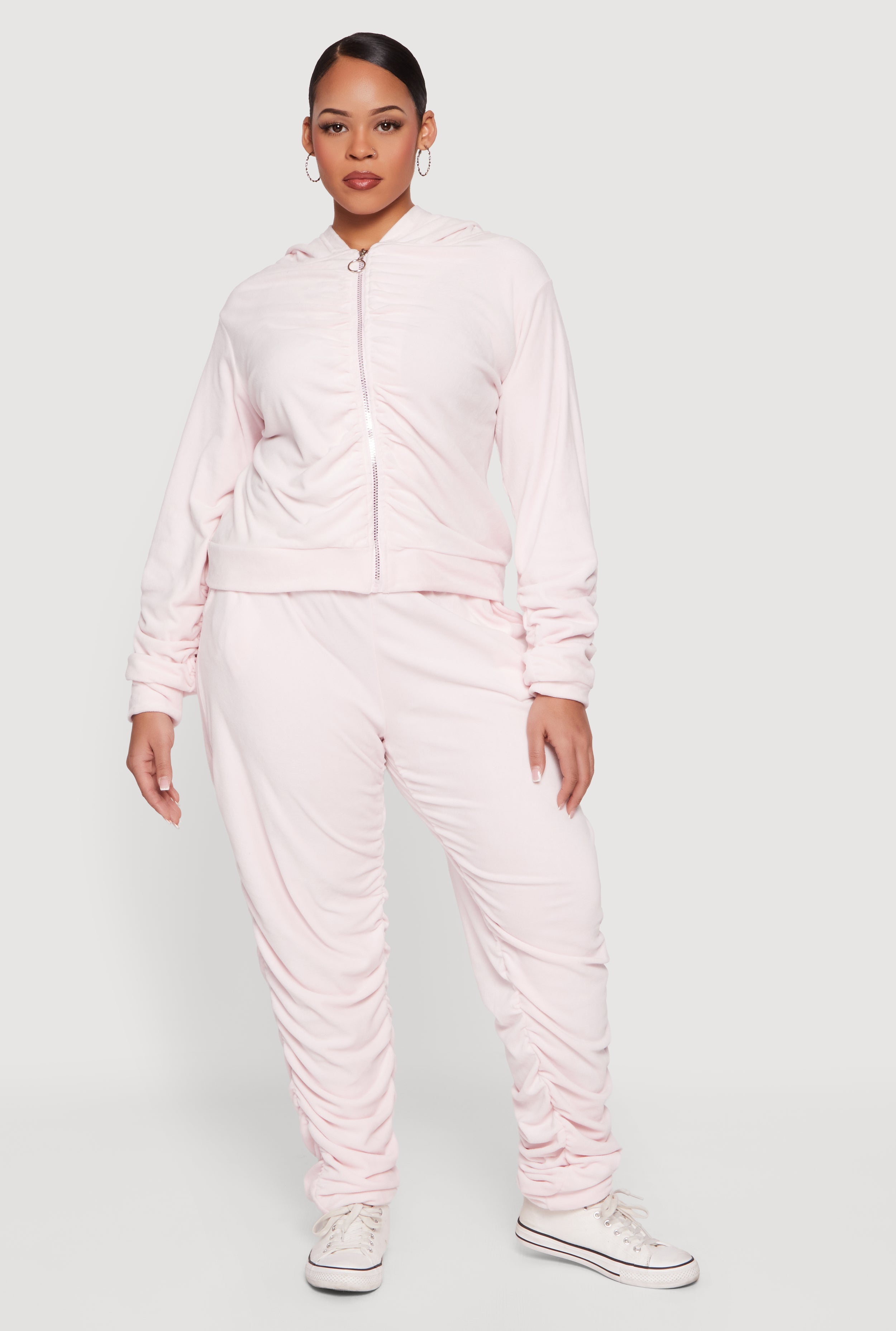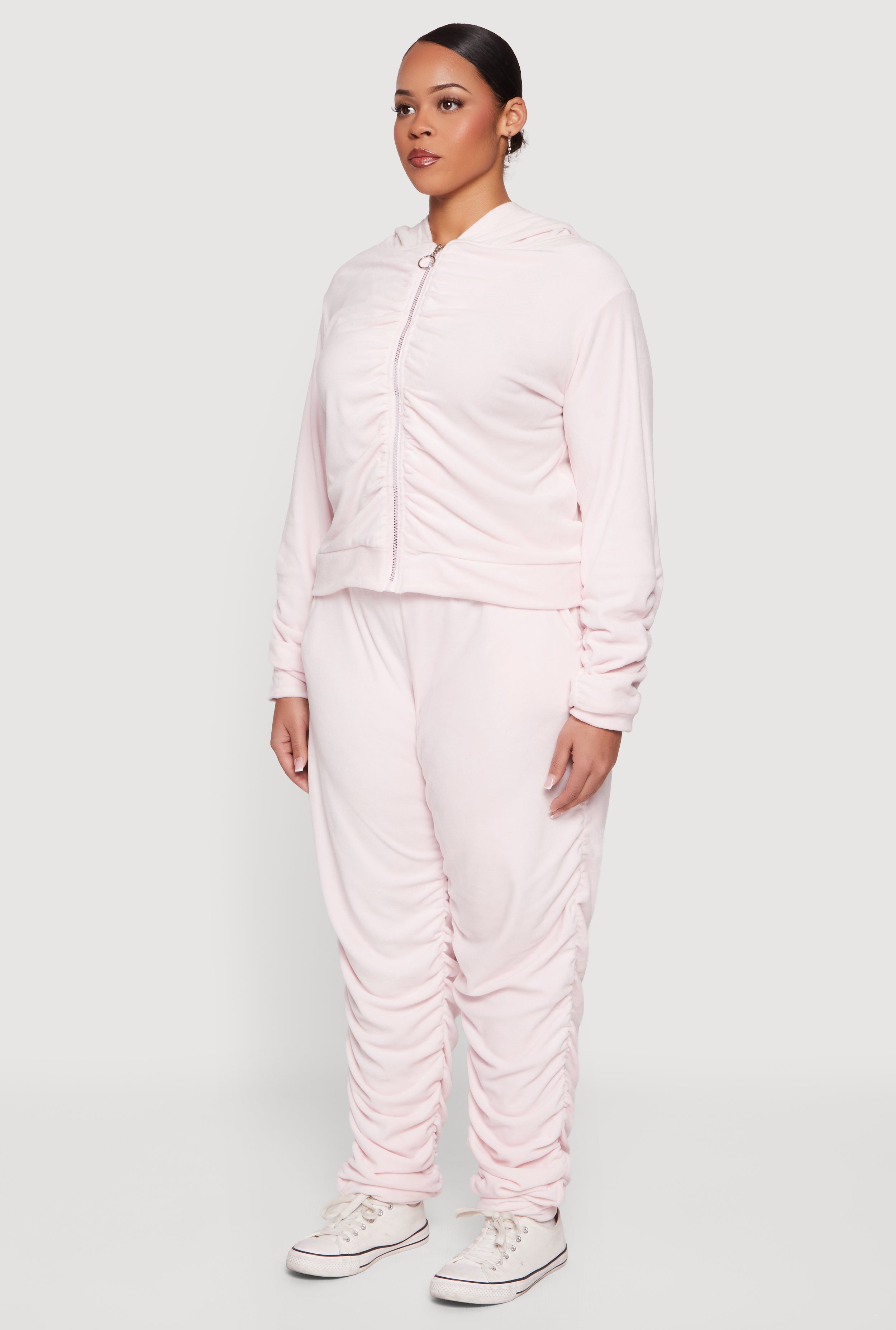 Cozy meets cool in this Plus Size Velour Ruched Zip Front Hooded Sweatshirt. Designed with a classic fit and soft velour fabric, it’s your go-to for effortless athleisure vibes and all-day comfort. The ruched detailing adds a trendy twist, while the zip front and hood keep things casual and functional. Perfect for lounging, running errands, or layering up on chilly days.