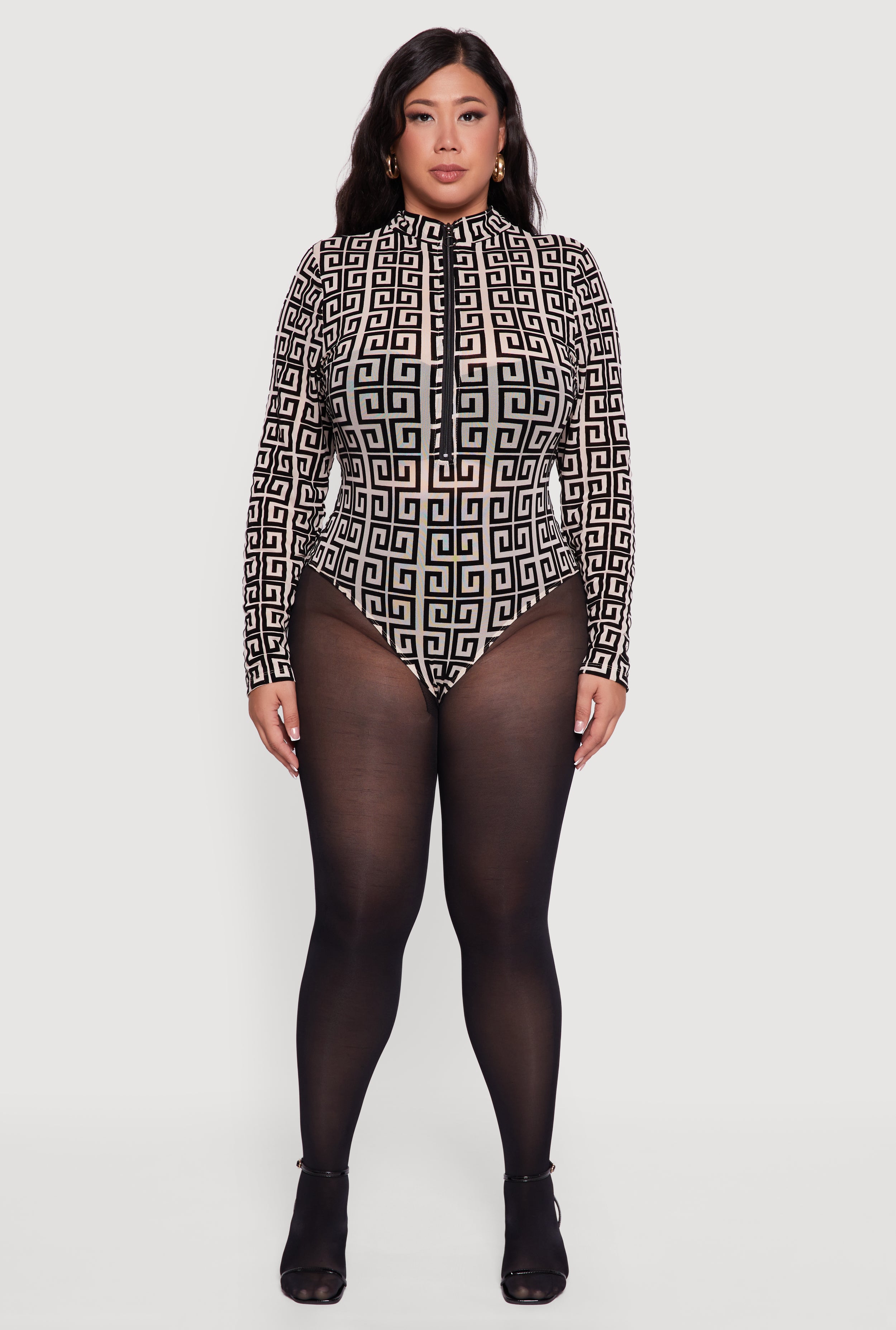 Slide into the spotlight with this Plus Size Greek Key Velvet Burnout Half Zip Bodysuit. Designed to hug your curves and elevate your night out or festival look, this bodysuit blends luxe velvet burnout fabric with a sleek greek key pattern for a vibe that’s equal parts edgy and elegant. The mock neck and long sleeves add a touch of cool sophistication, while the half zip front lets you dial up the attitude. Plus, the thong snap closure keeps everything smooth and seamless, so you can dance the night away without a worry.
