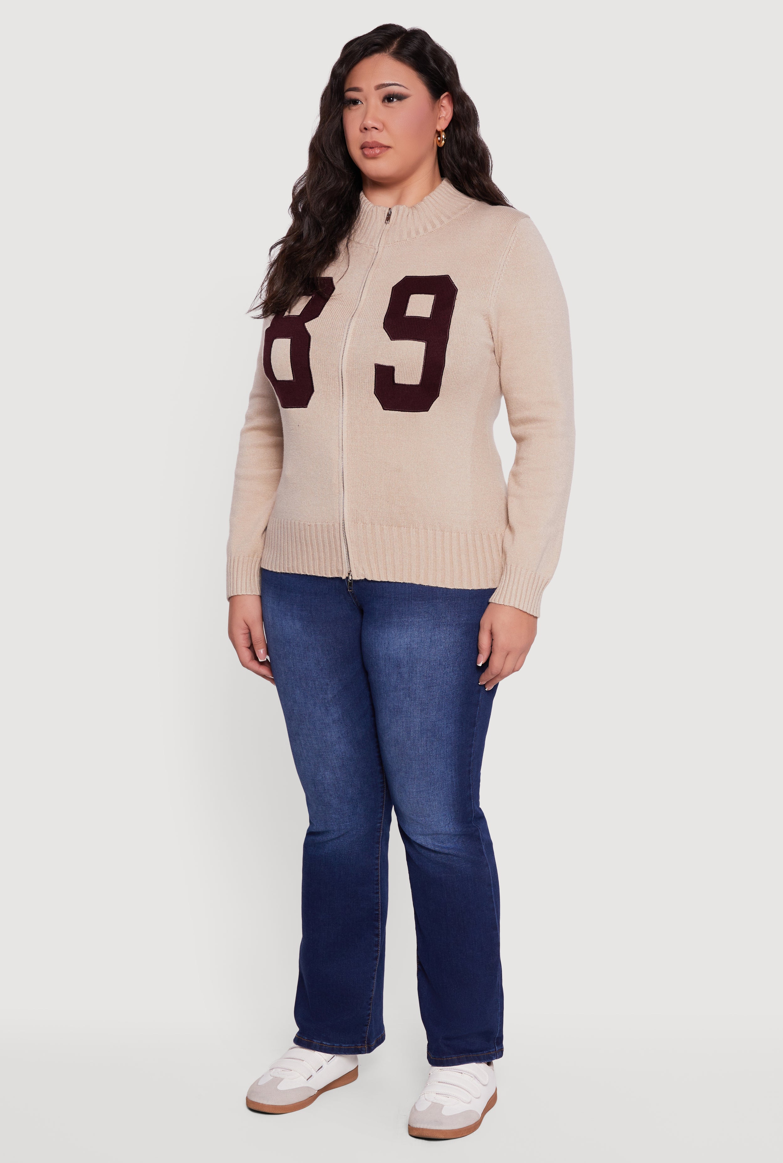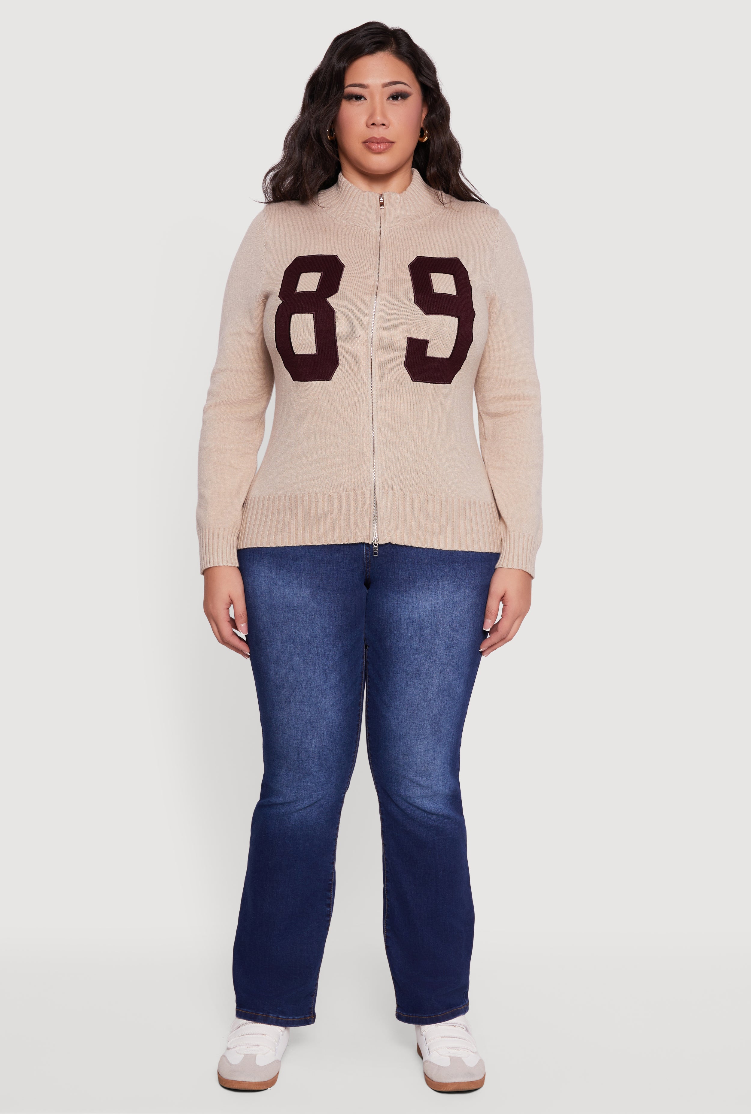 Step up your cozy game with this Plus Size 89 Zip Front Mock Neck Sweater. Designed with a classic fit and ribbed knit fabric, it delivers all-day comfort with a cool, casual vibe. The zip front adds a trendy touch and lets you customize your look, while the mock neck keeps things effortlessly chic. Perfect for back to school or just chilling in style, this sweater features a bold "89" graphic that stands out without trying too hard.