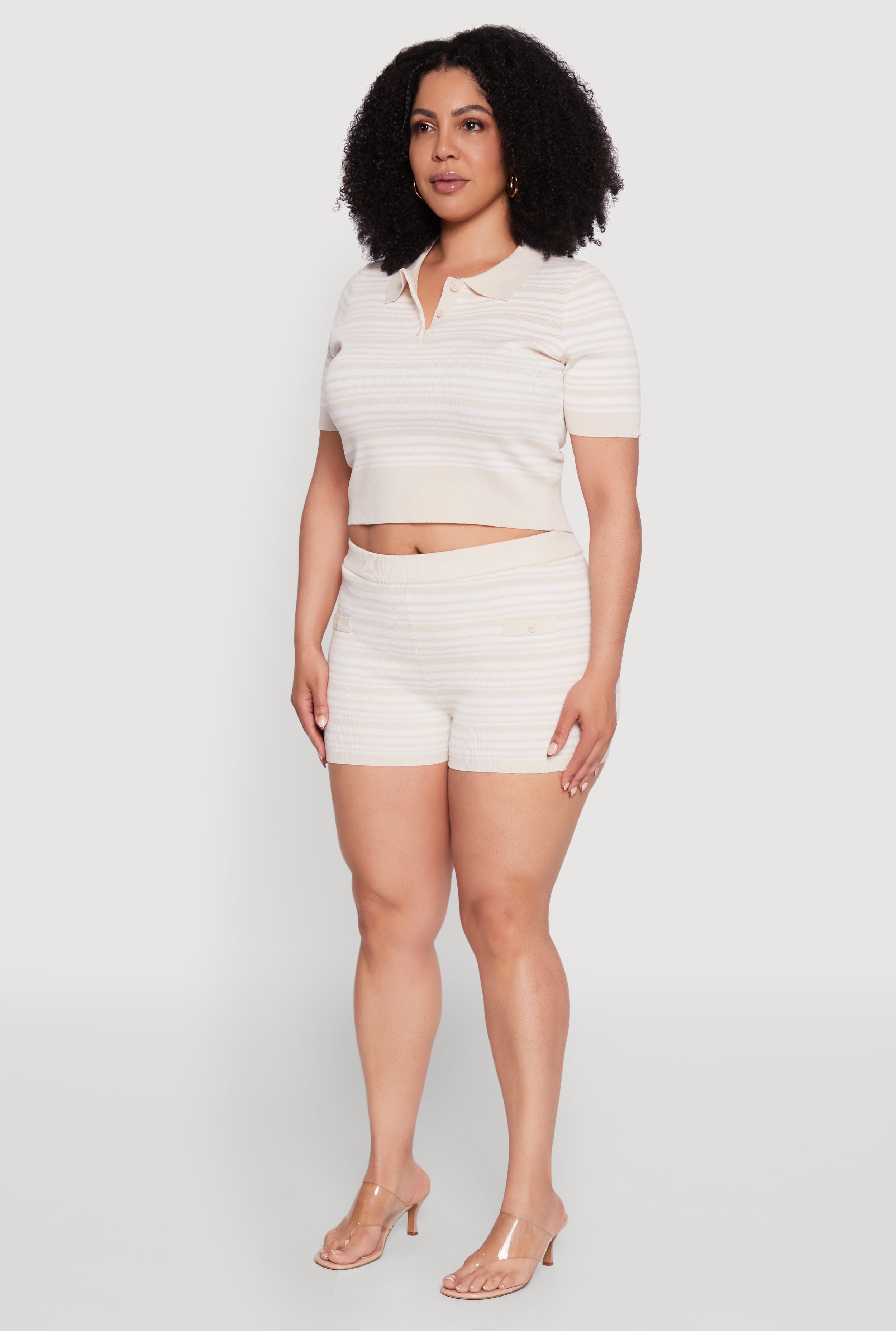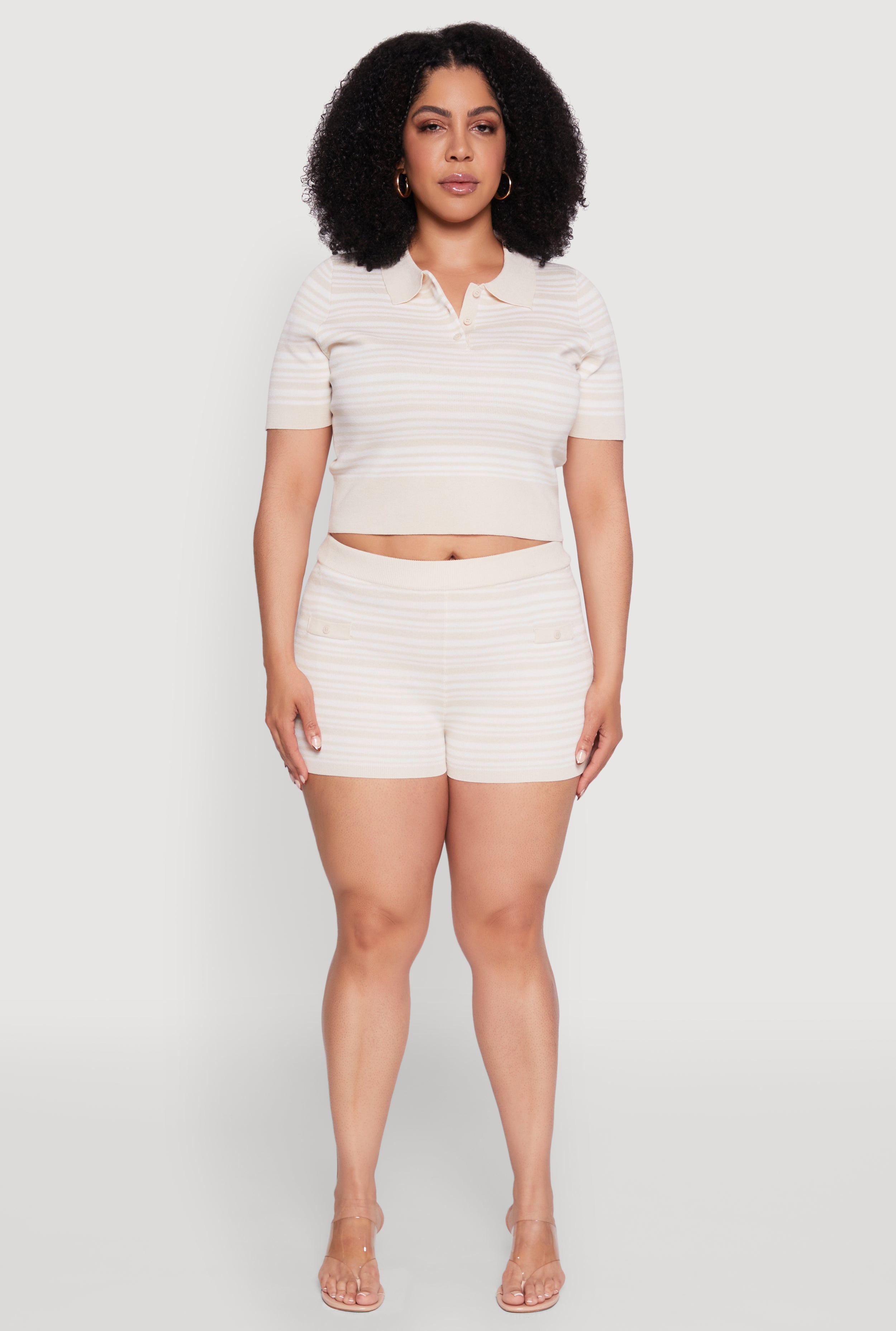 Get ready to turn heads with our Plus Size Daisy Striped Cropped Polo Shirt. Perfect for adding a playful yet polished vibe to your wardrobe, this shirt combines classic style with a fun twist. Whether you're out with friends or just enjoying a casual day, this polo is your new go-to. Its timeless silhouette and cropped hem make it a versatile piece that flatters your curves and keeps you looking effortlessly chic. Feel confident, comfortable, and totally on-trend in this must-have top.