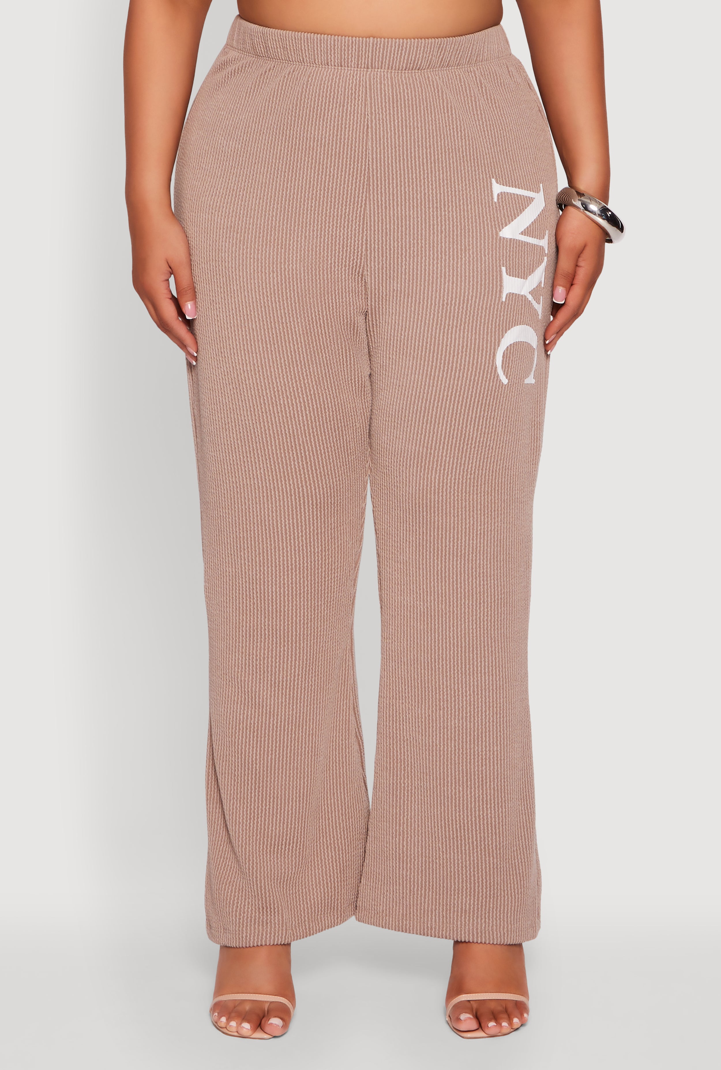 Step up your casual game with these Plus Size NYC Graphic High Waisted Ribbed Knit Flare Pants. Designed to hug your curves with a modern fit, these flare-leg pants blend comfort and style effortlessly. The high waist gives you that flattering silhouette while the ribbed knit fabric keeps things cozy and breathable. Perfect for lounging around or hitting the city streets, these pants bring a cool NYC vibe to your everyday look without breaking the bank.