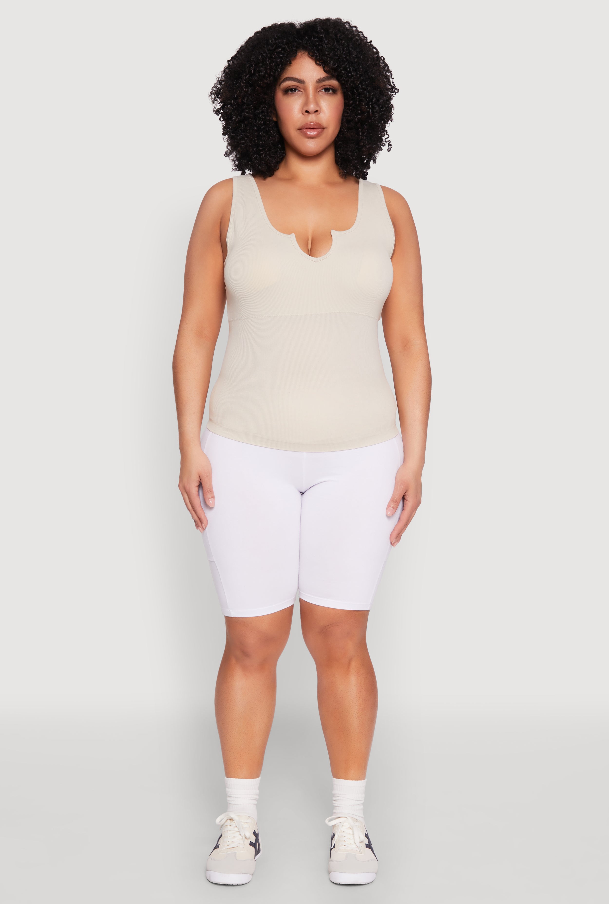 Upgrade your wardrobe with our Plus Size Seamless Notch Neck Tank Top, the perfect blend of comfort and style. Designed with a classic fit and a timeless silhouette, this sleeveless top is your new go-to for everyday wear. The ribbed knit material feels soft against your skin, while the built-in shelf bra with removable padding offers extra support without sacrificing comfort. Whether you're layering or wearing it solo, this tank top keeps you feeling confident and cool all day long.