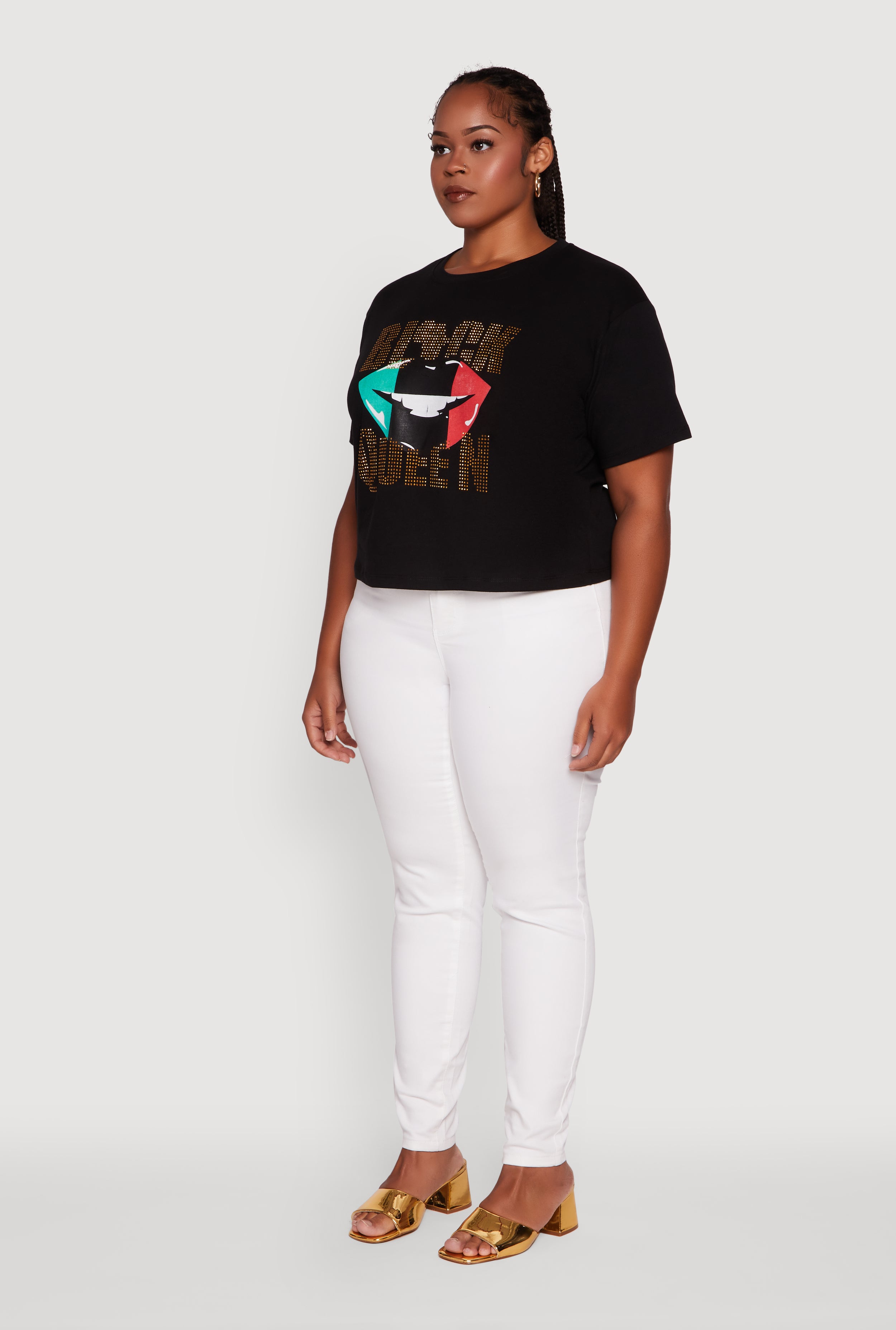 Step into your power with this Plus Size Black Queen Lip Graphic Crew Neck Tee. Designed for those who love to keep it casual but bold, this tee features a striking Black Queen graphic accented with rhinestones for that extra sparkle. Its relaxed fit and classic crew neck make it your new go-to for effortless streetwear vibes. Perfect for everyday wear, it’s the statement piece that’s as comfortable as it is confident.