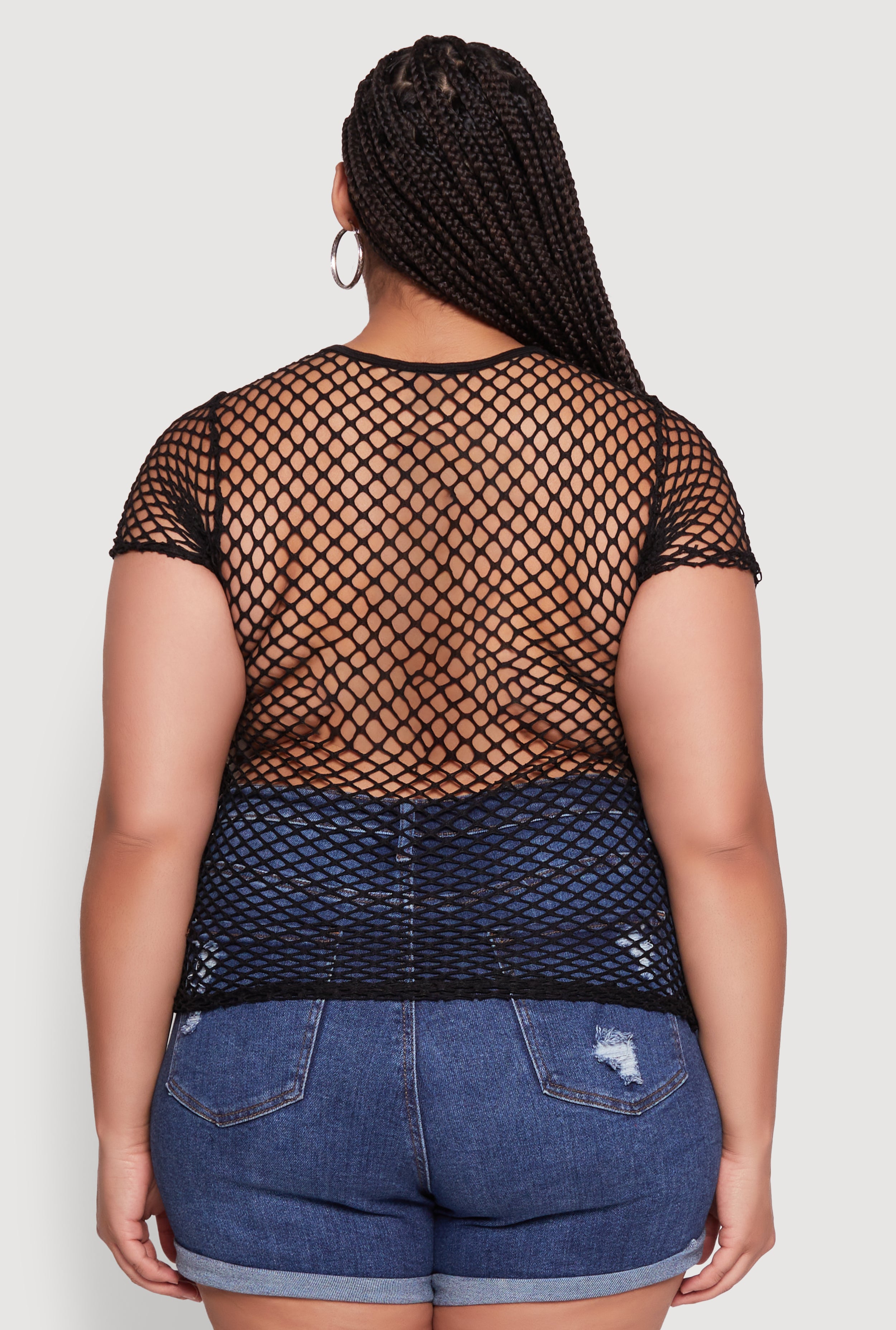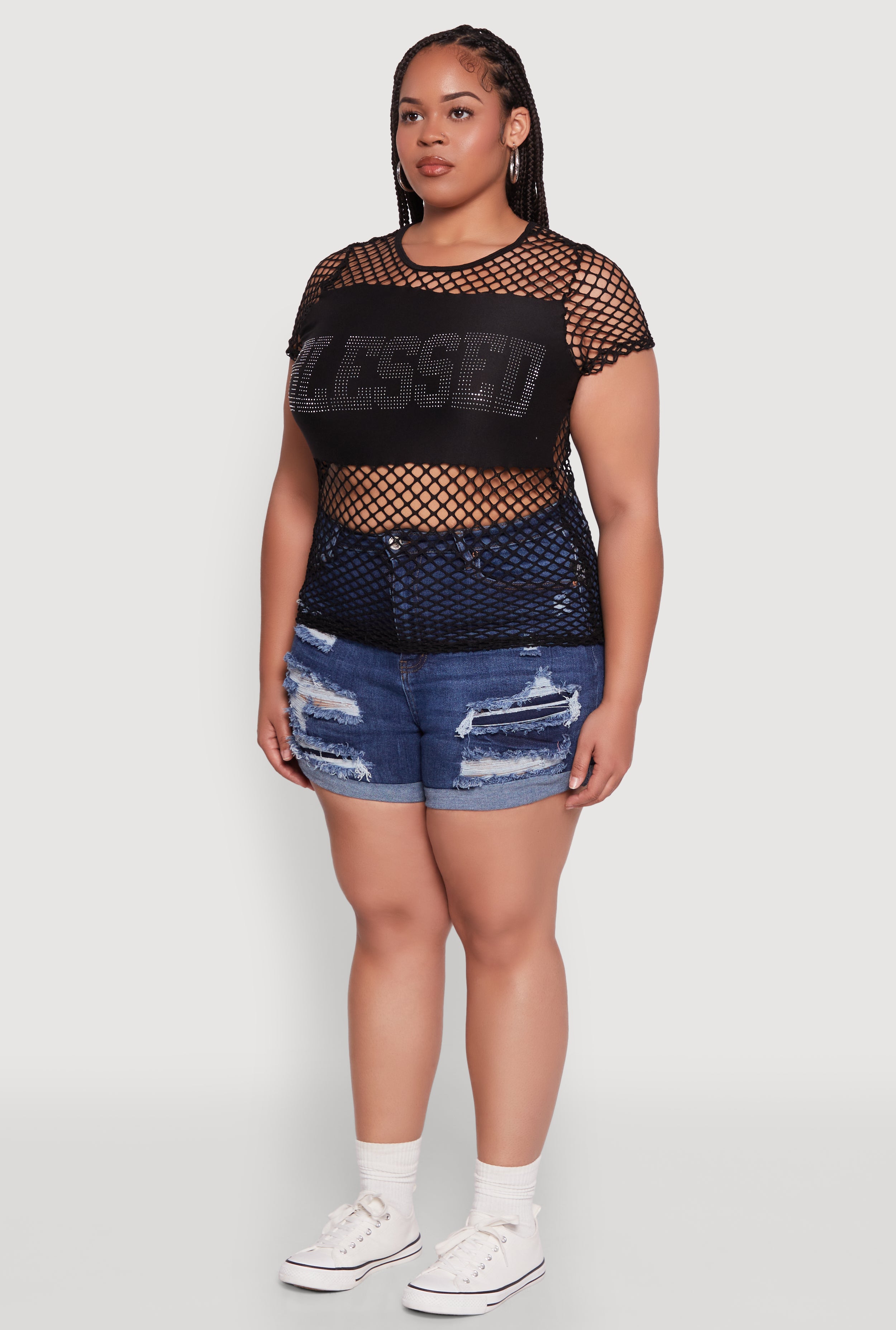 Get ready to shine and make a statement with our Plus Size Blessed Rhinestone Fishnet Top. Featuring a bold graphic and sparkling rhinestones, this sheer t-shirt is perfect for adding some glam to your everyday look. The classic fit and crew neck make it super comfortable, while the short sleeves keep it breezy and easy to style. Whether you're layering or rocking it on its own, this top is your new go-to for turning heads and embracing your fabulous self.