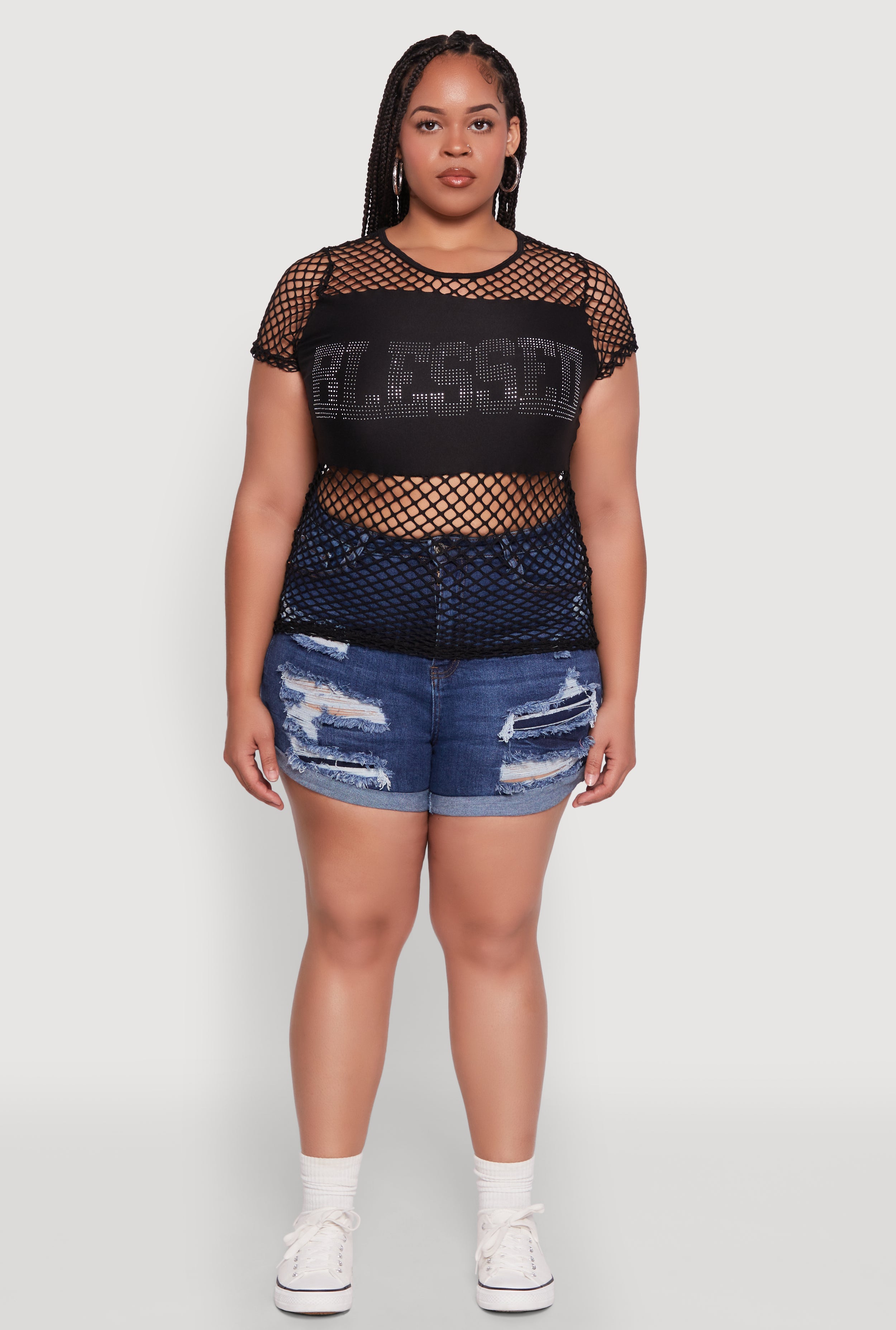 Plus Size Blessed Rhinestone Fishnet Top with Crew Neck