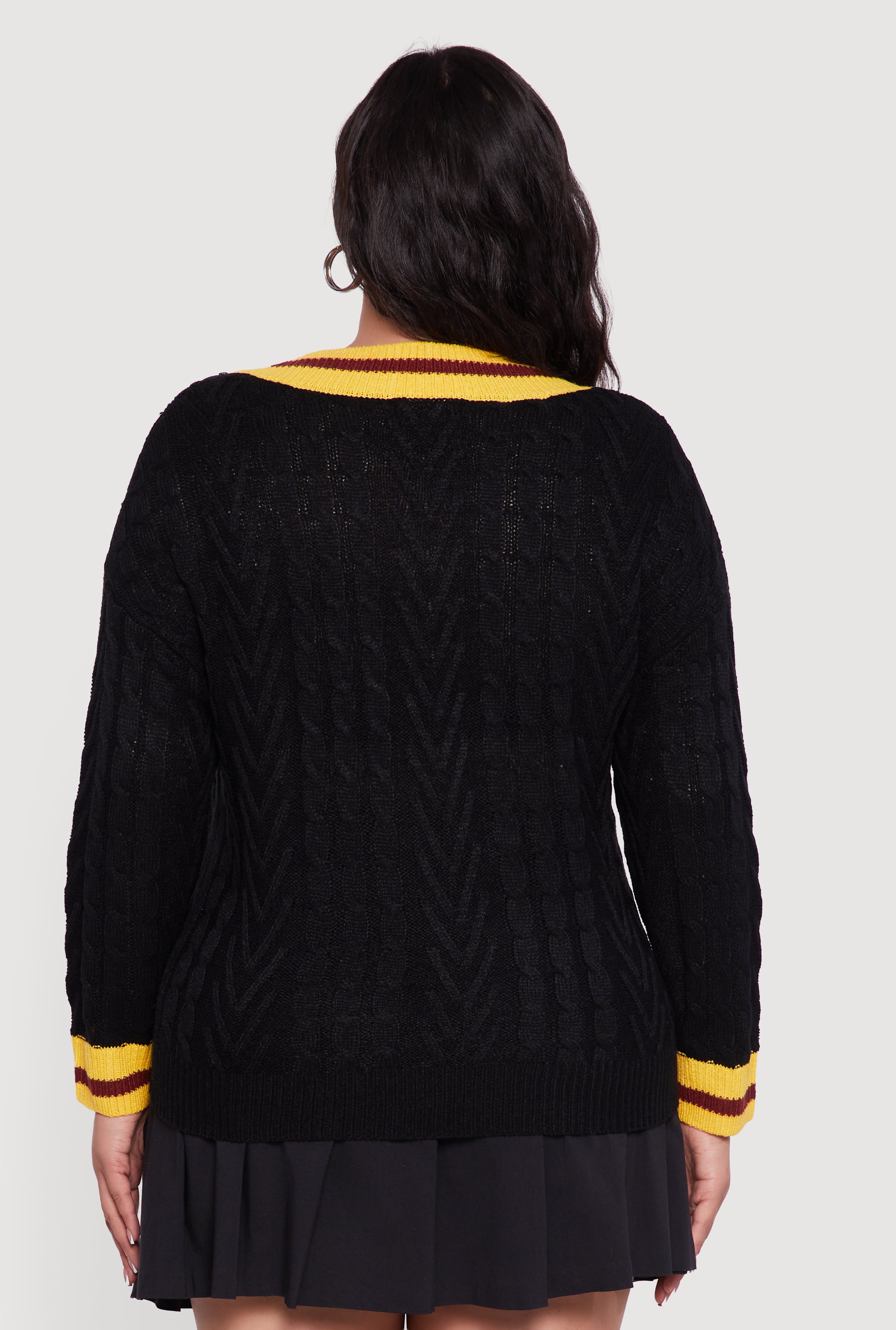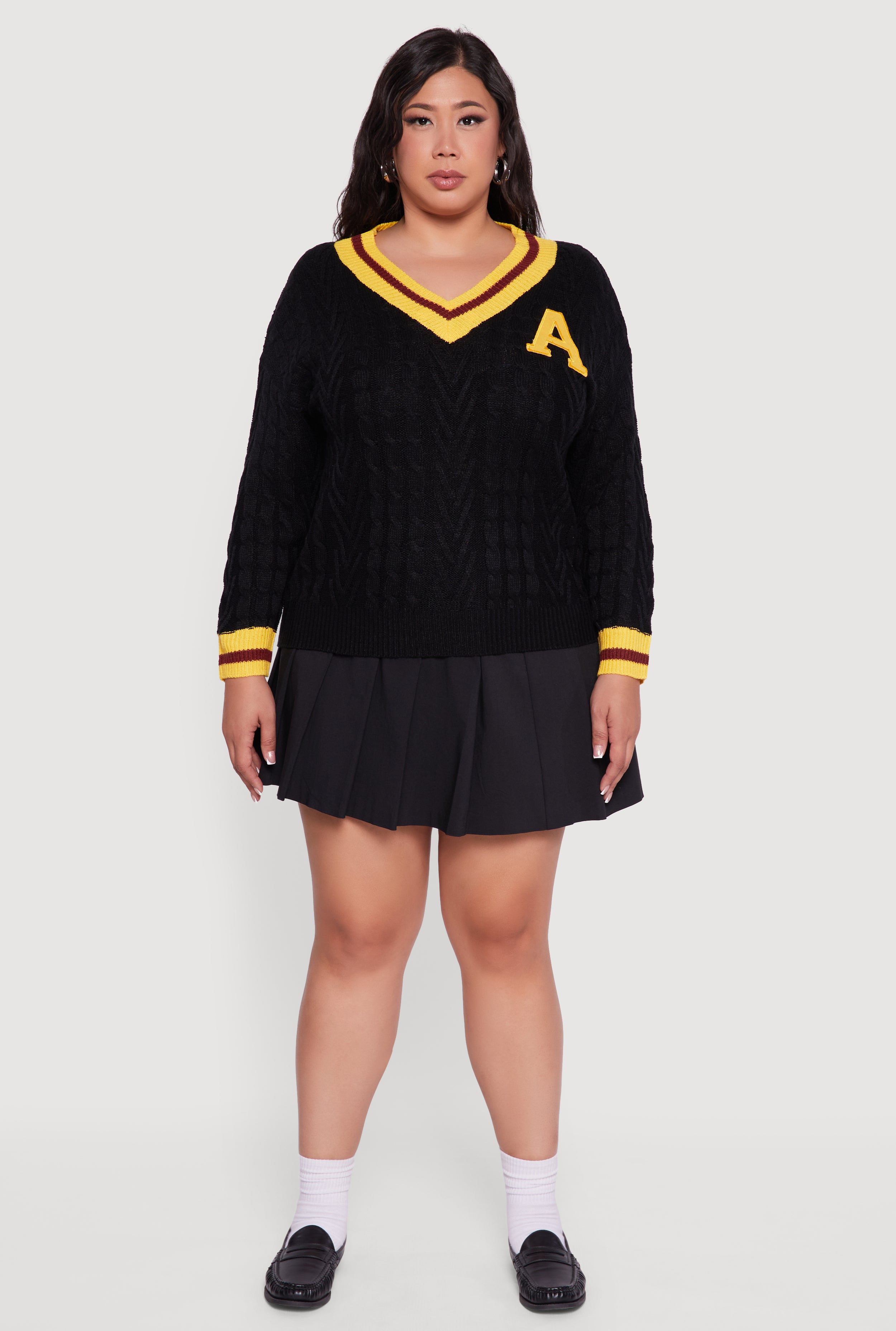 Cozy meets cool in this Plus Size Cable Knit Varsity Stripe Sweater. With its classic fit and timeless V-neck silhouette, it’s the perfect go-to for casual days when you want to look effortlessly stylish. The varsity stripe detail and embroidered patch add just the right amount of sporty flair to keep your outfit fresh and fun. Whether you’re lounging at home or out with friends, this cable knit pullover is designed to keep you comfy and confident all day long.