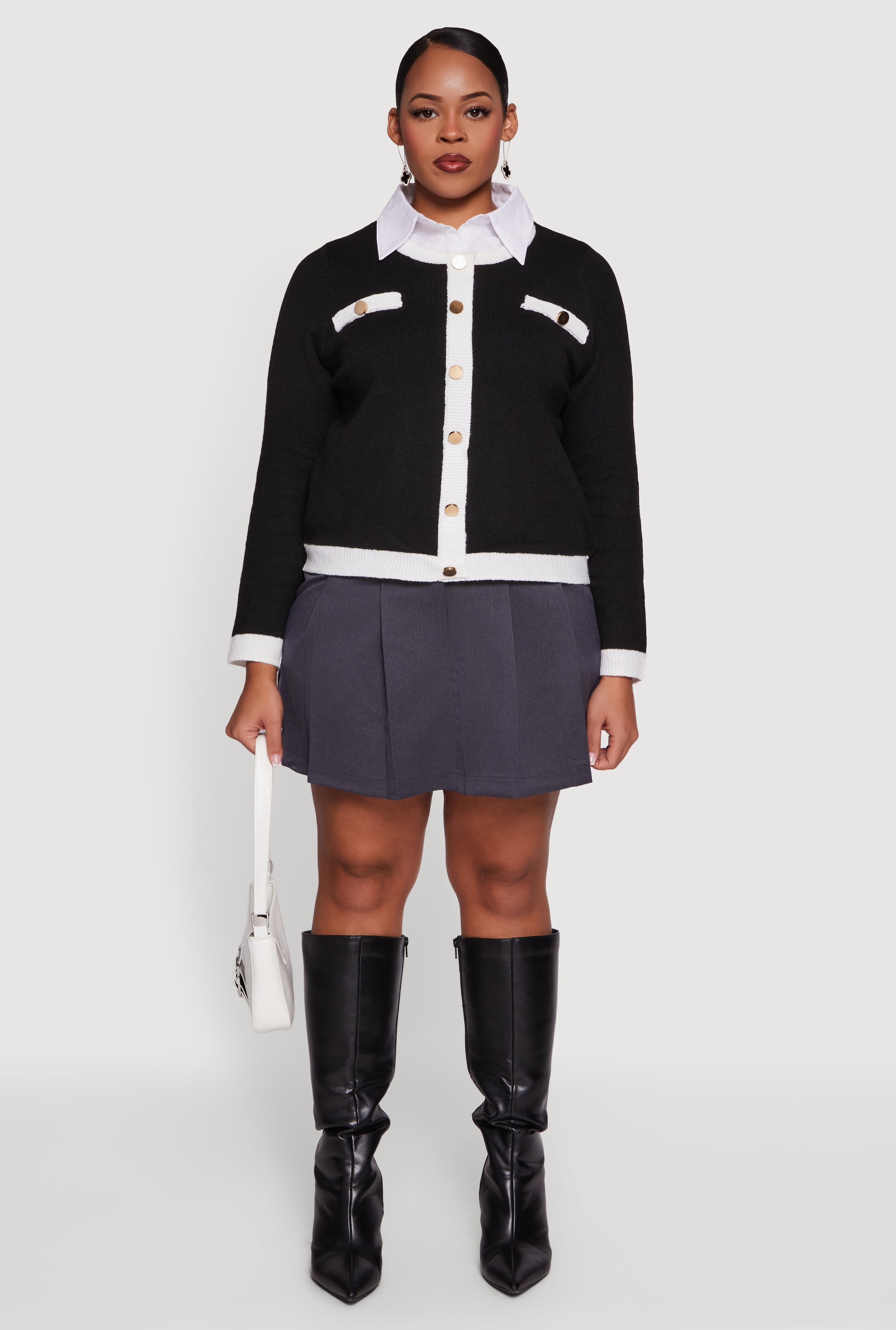 - Contrast trim and faux buttons add a chic, layered look without the hassle