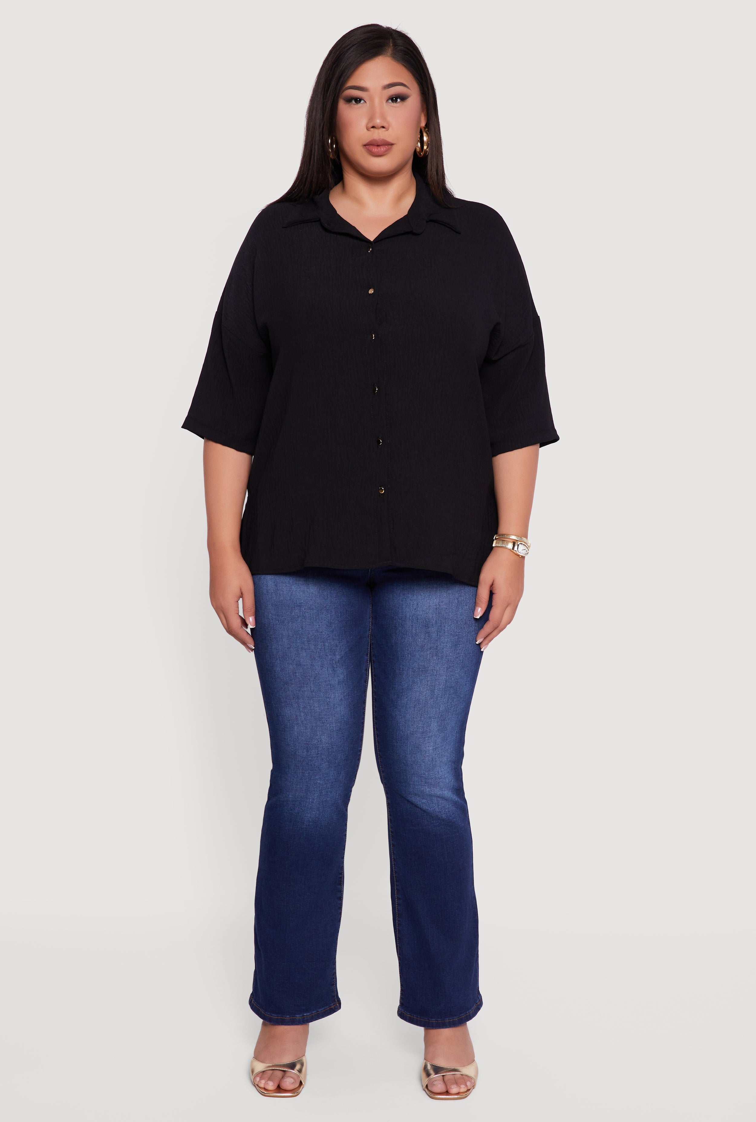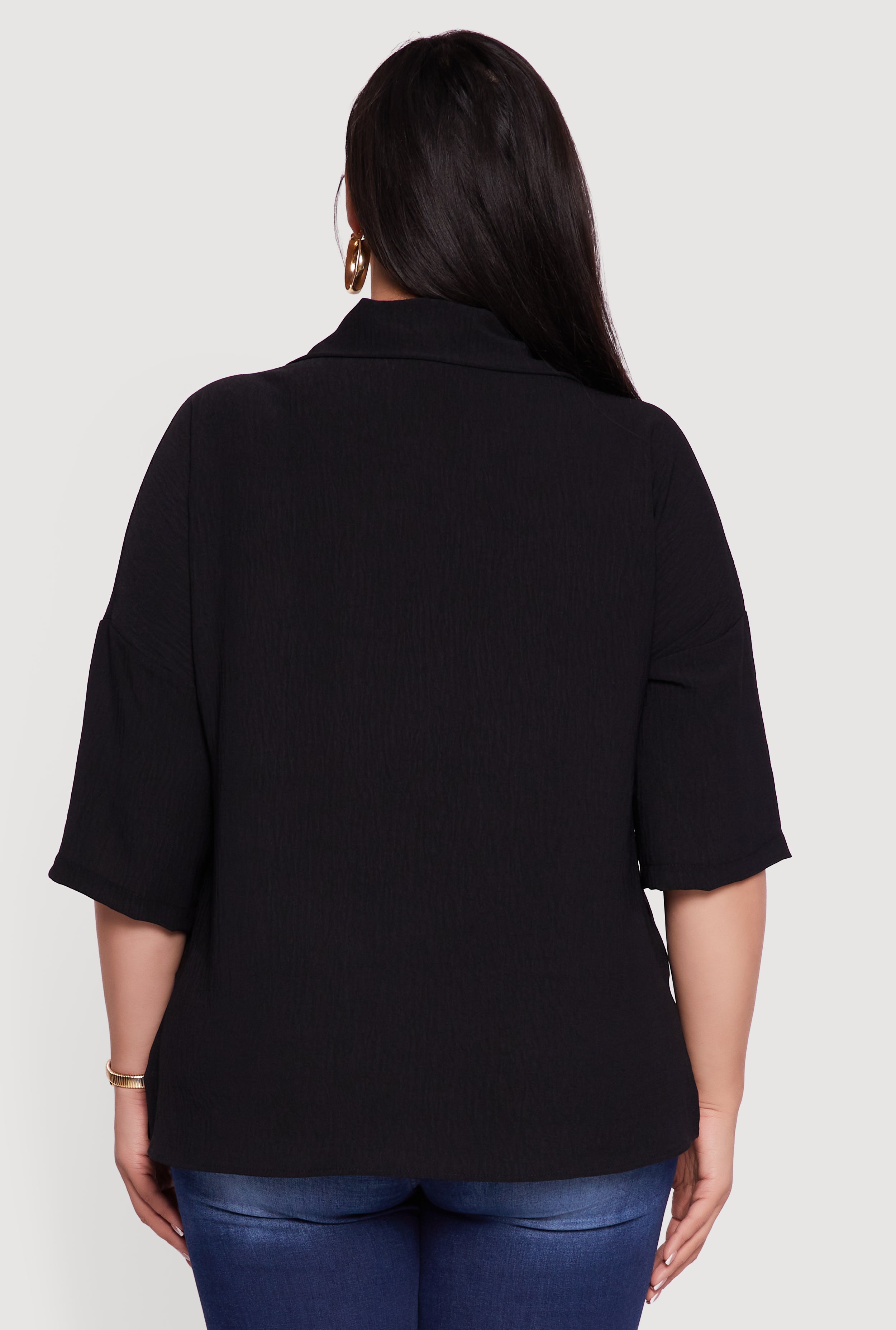 Discover effortless style with this Plus Size Crepe Knit Boxy Button Front Shirt designed to keep your look fresh and comfy all day. Featuring a classic fit and timeless shirt collar, it’s a versatile piece that pairs perfectly with your favorite jeans or skirts. The soft crepe knit fabric feels light against your skin, while the 3/4 sleeves and drop shoulder design add a relaxed, modern vibe that’s ideal for casual outings or laid-back weekends.