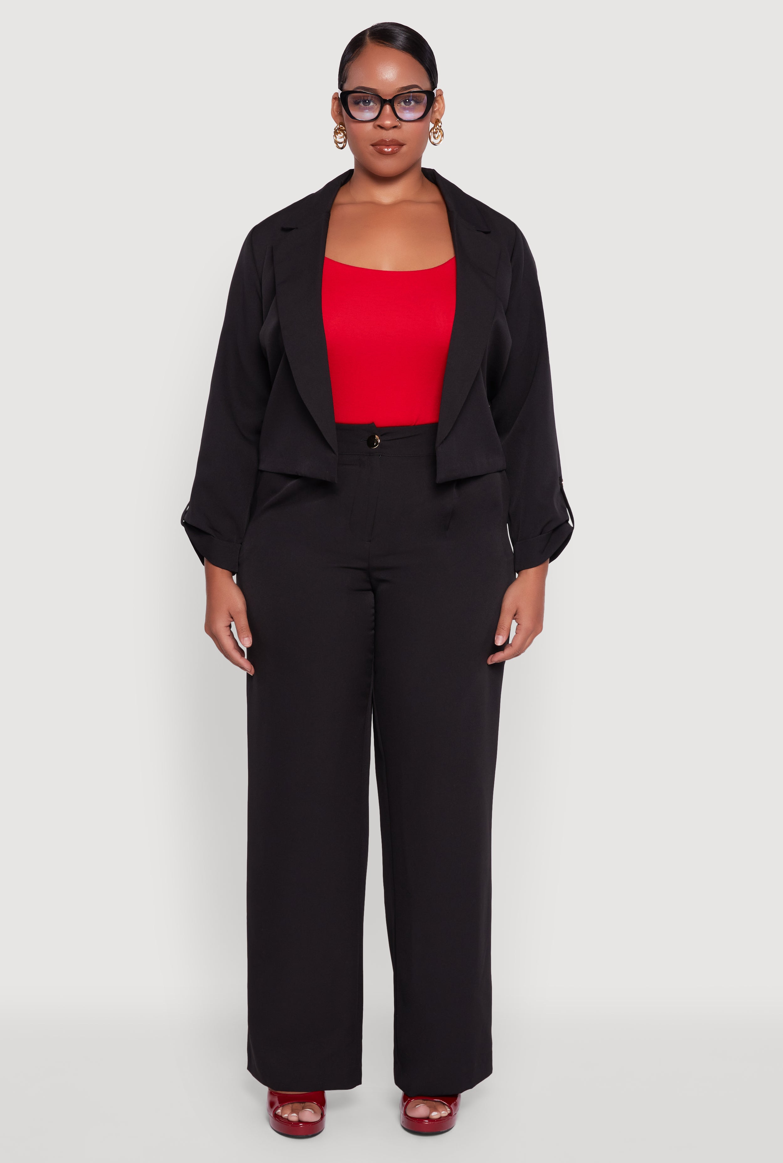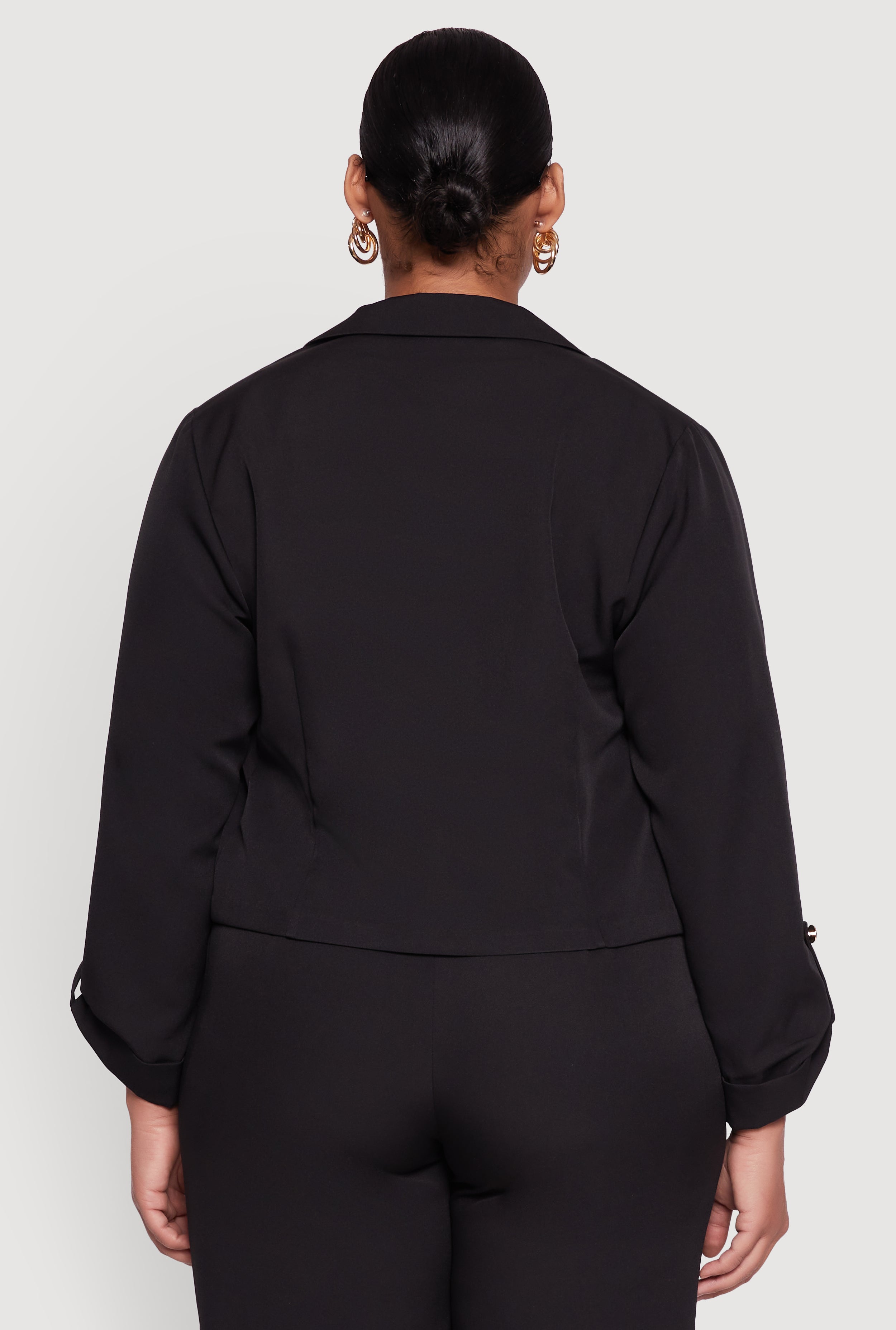 Step up your style game with this Plus Size Crepe Knit Cropped Long Sleeve Collared Blazer. Perfectly tailored for a chic, confident look, this blazer blends dressy vibes with office-ready polish. The cropped cut adds a trendy twist while the crepe knit fabric keeps it comfy all day long. Whether you’re closing deals or meeting friends, this blazer makes you look and feel unstoppable.